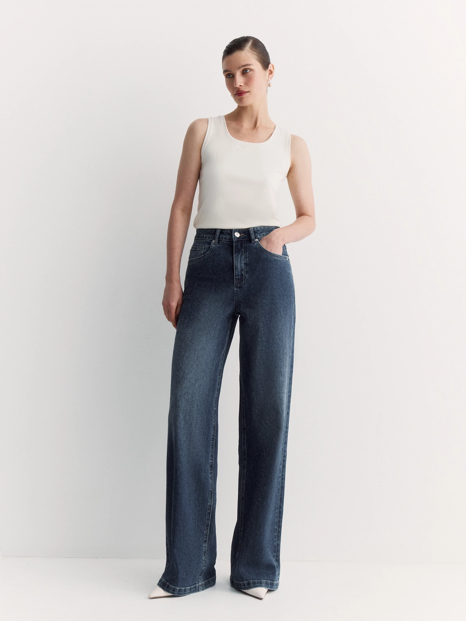 Широкие прямые джинсы relaxed fit - одна из составляющих базового гардероба. Высокая удобная посадка, застежка на молнию и болт, пять традиционных карманов и плоская кокетка - идеальная модель для повседневной носки и офисного кэжуала.