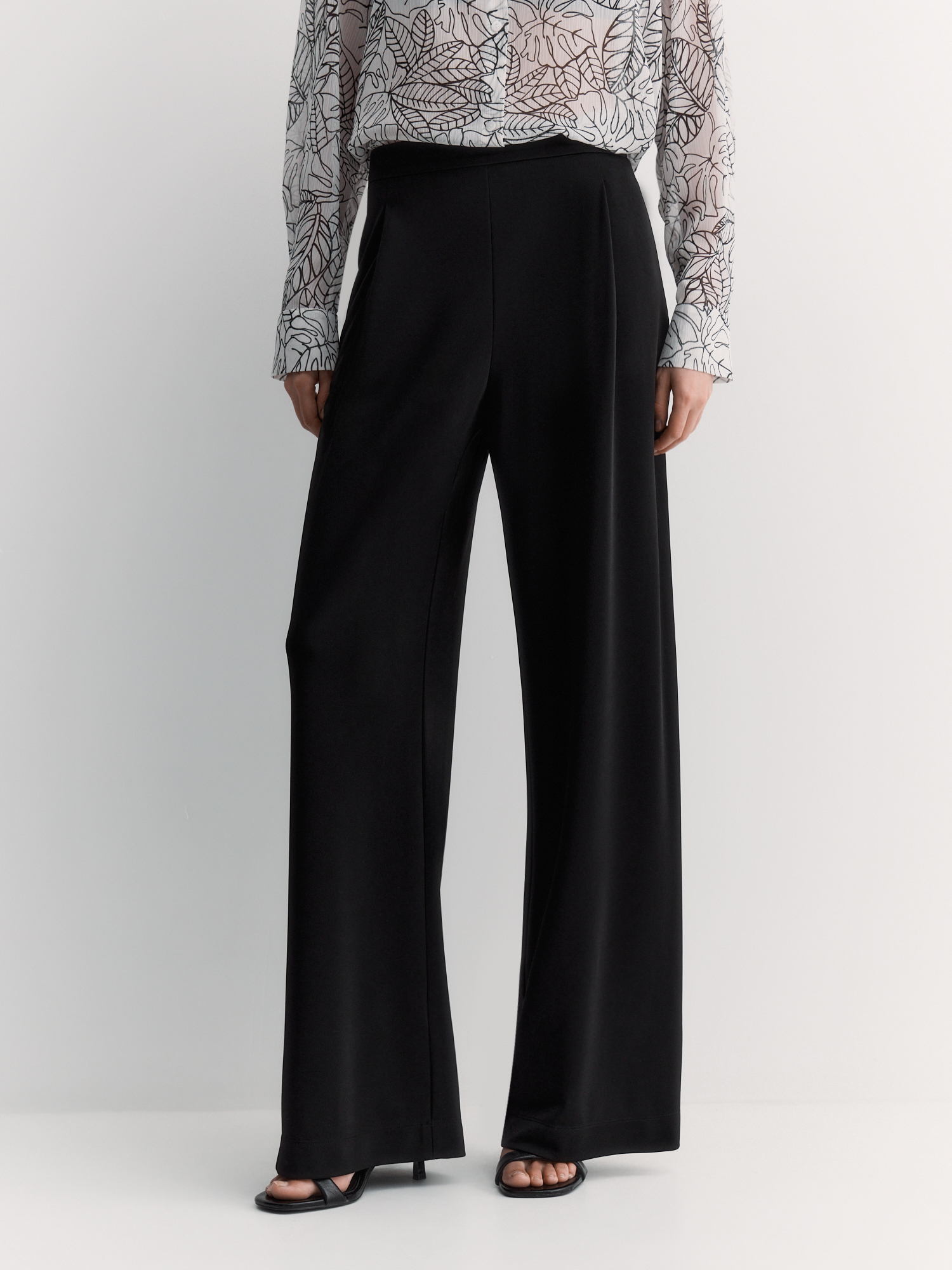 Прямые брюки сочетают универсальность лаконичной модели и комфорт трикотажа. Сшитые из эластичной ткани, они хорошо тянутся и удобно сидят.