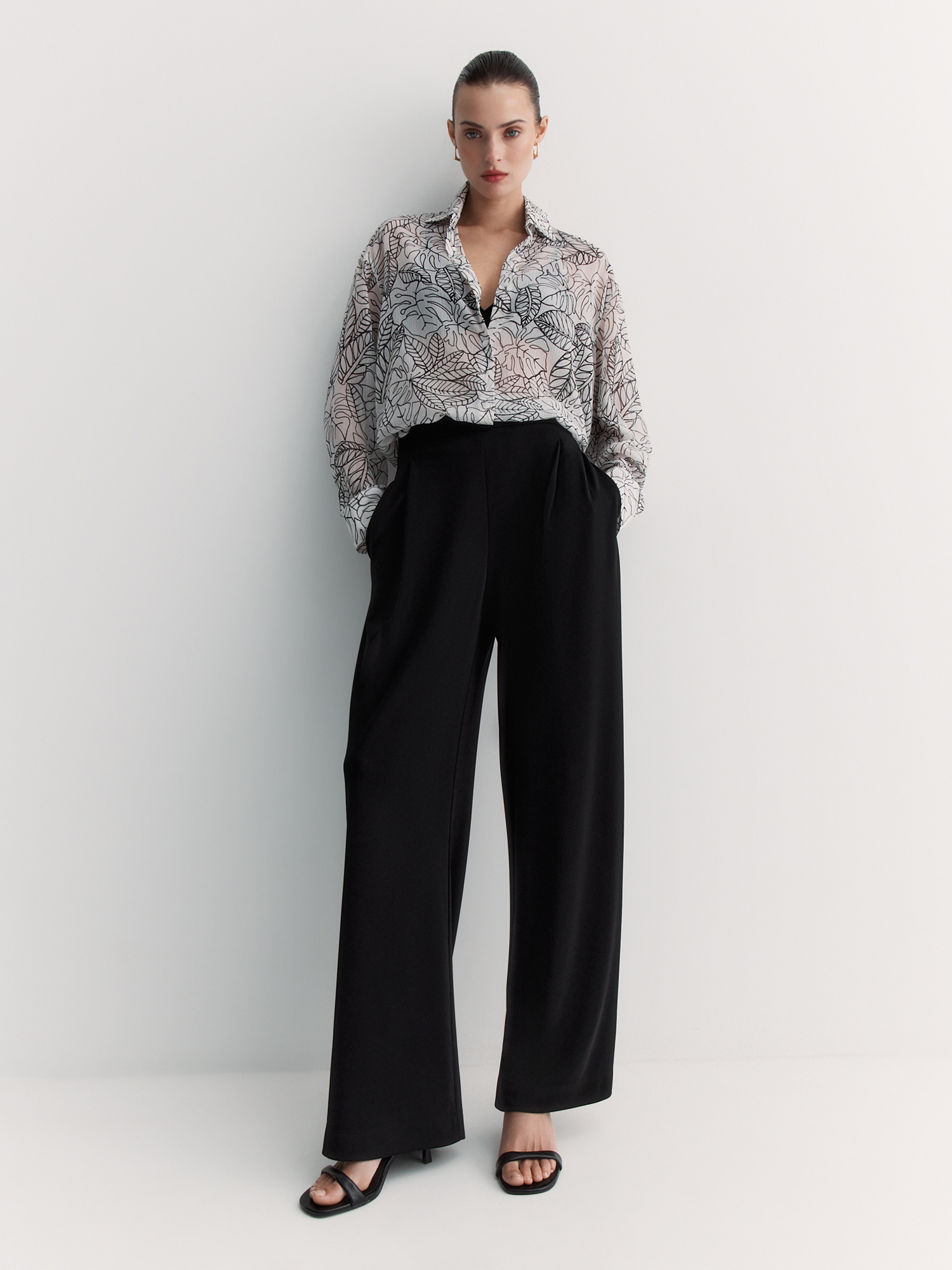 Классический чёрный цвет делает брюки универсальными. Их можно носить с рубашками, блузами или свитерами для неформального офиса, встреч или повседневных образов.