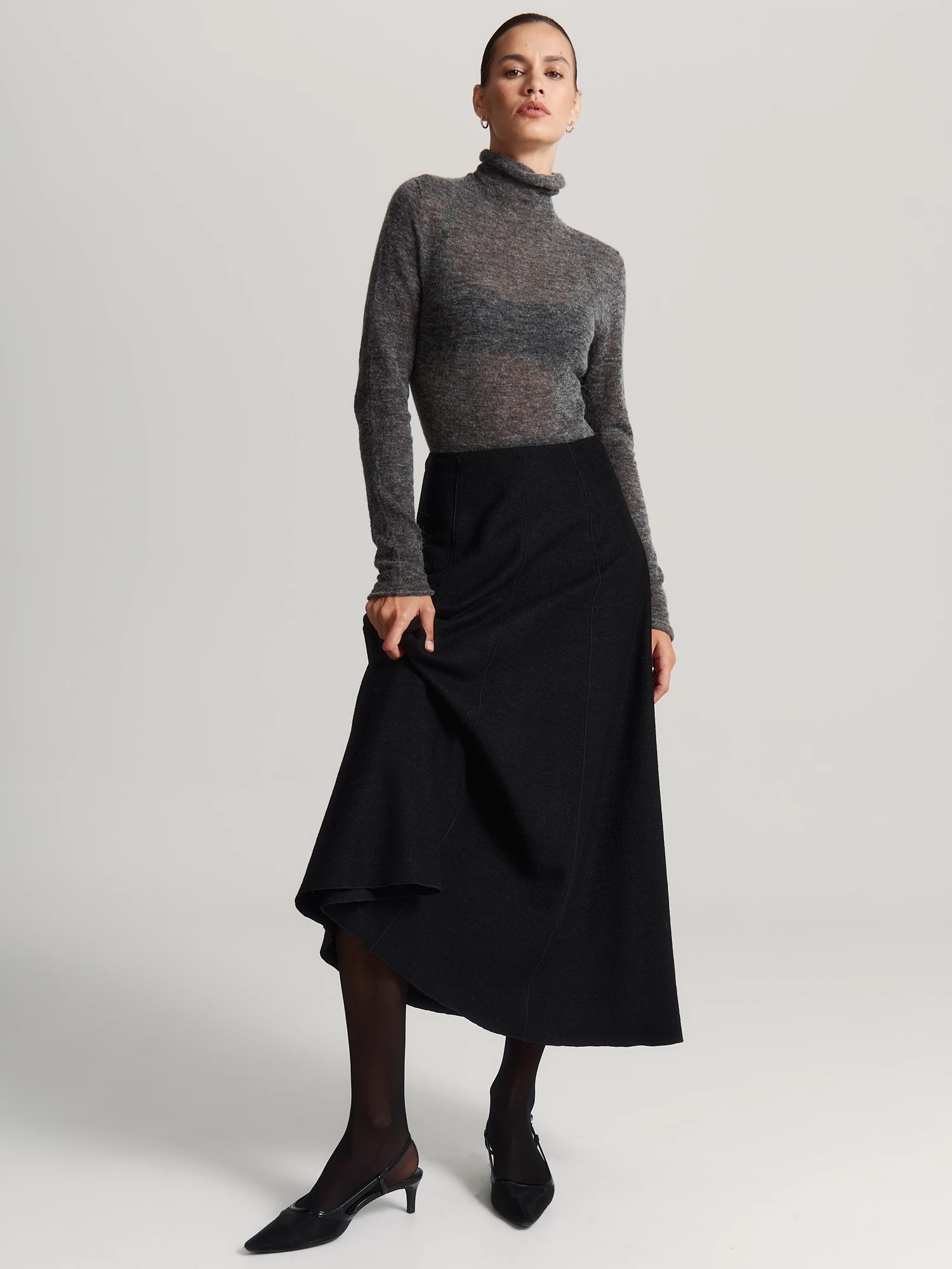 Юбка из мягкой вареной шерсти имеет узнаваемую рельефную текстуру. Такая ткань сочетает нежность и объем шерсти с прочностью полиэстера, даря ощущение комфорта и сохраняя чёткую форму.