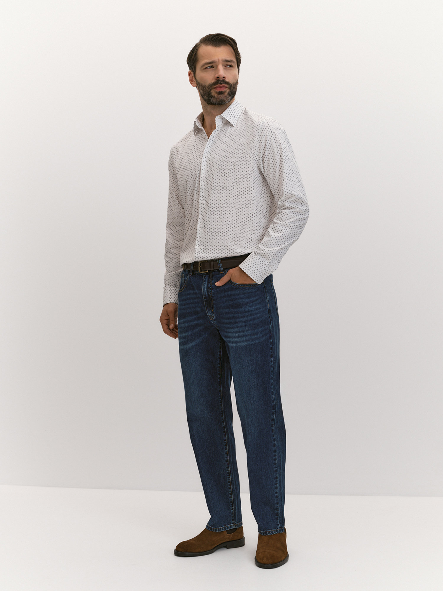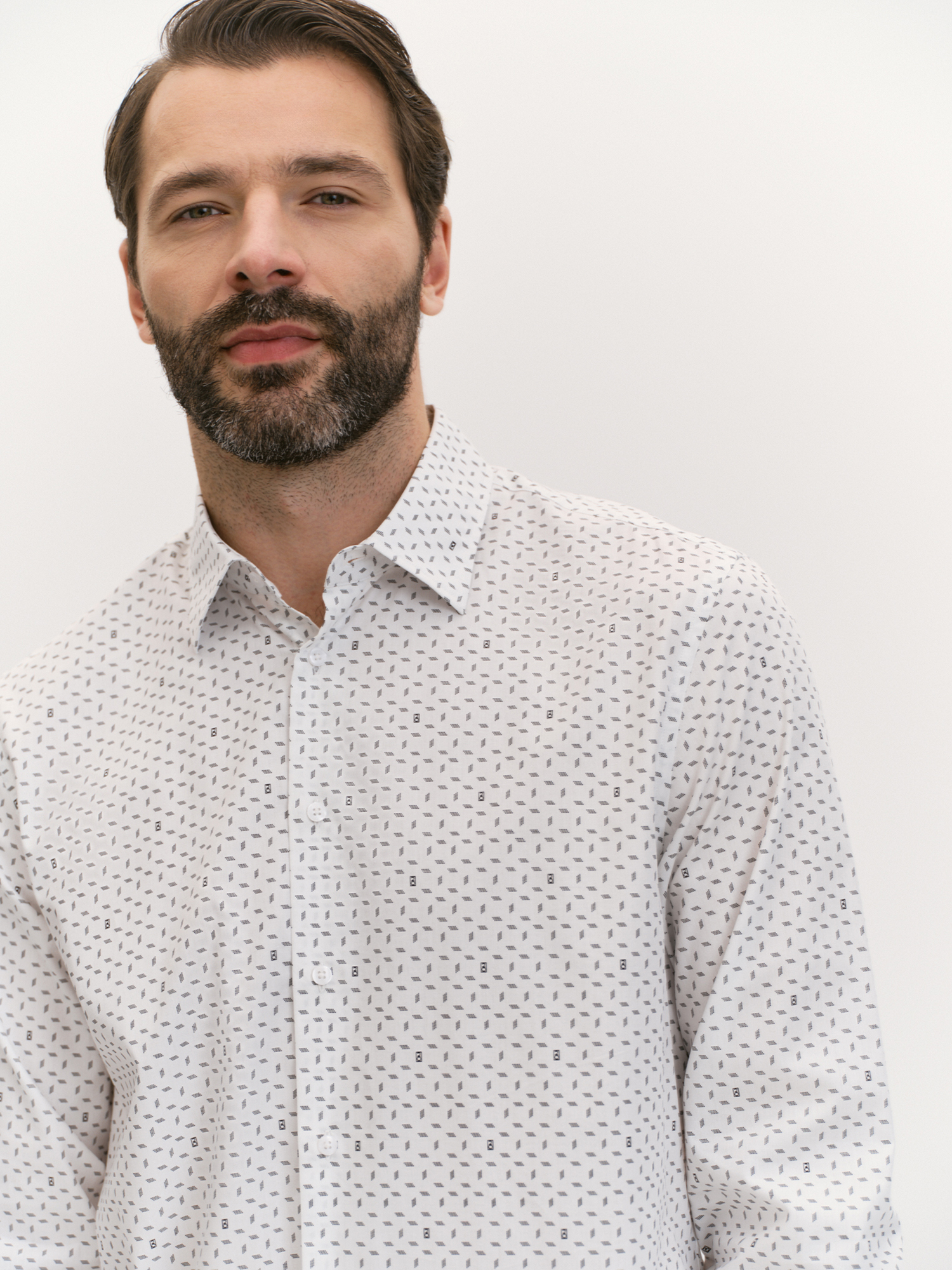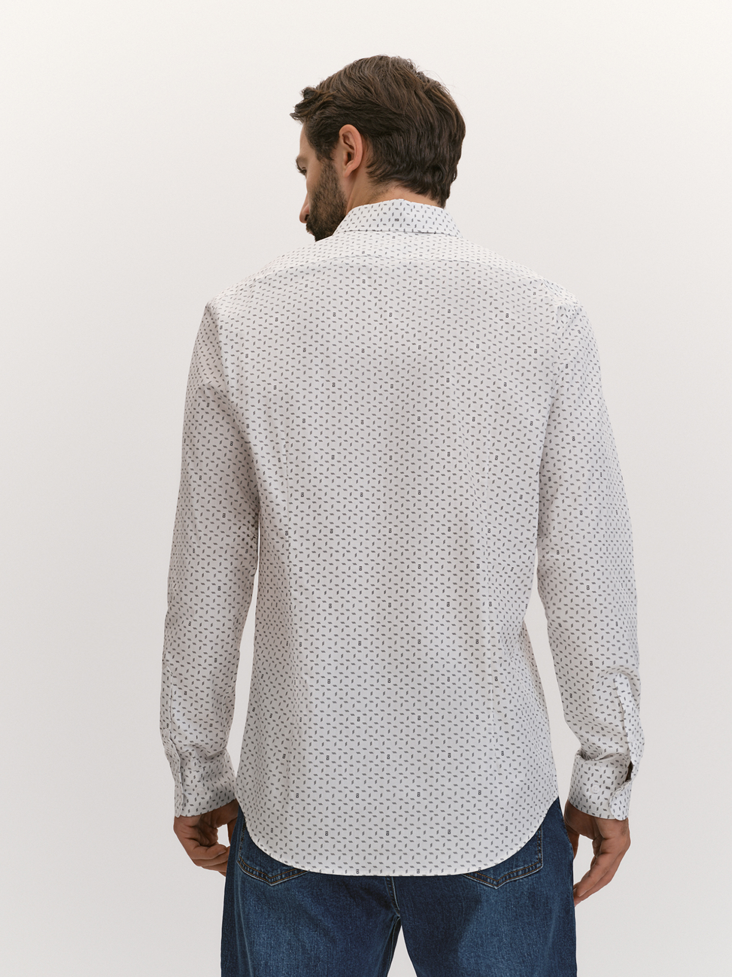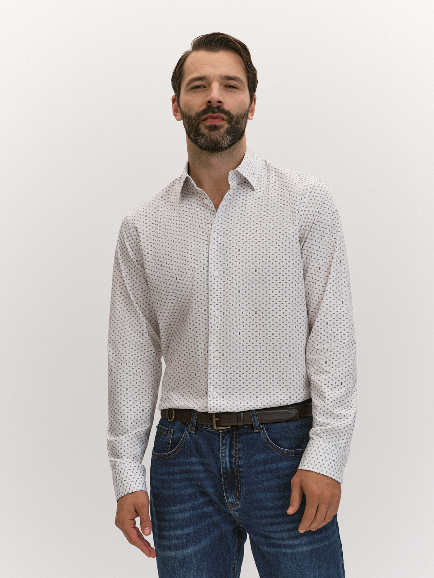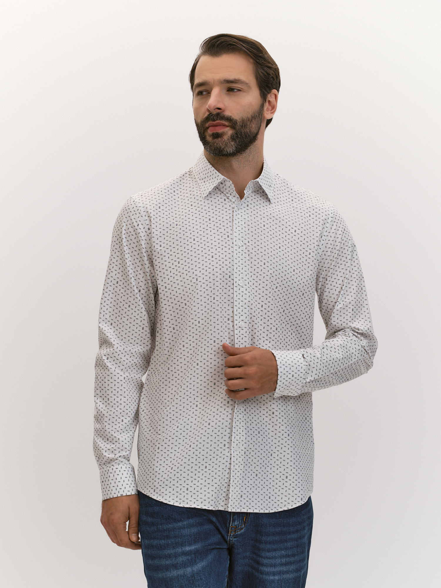 Выбрали для рубашки прилегающего силуэта slim премиальную хлопковую ткань производства Турции. Хлопок гипоаллергенен, хорошо дышит, удобен в эксплуатации и не требует дополнительного ухода. Привлекает внимание деликатный брендированный принт на белом фоне. Как крупные производители одежды, мы имеем возможность заказывать ткань с дизайнерским принтом и гордимся этим преимуществом. Прилегающий силуэт рубашки обеспечивается вертикальными вытачками, кокетка на спине гарантирует правильную посадку по плечам. Ахроматические белый и черный не подчиняются никаким правилам сочетания цветов, а потому рубашка универсальна и подойдет для офиса, вечеринки, праздника, прогулки.