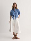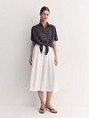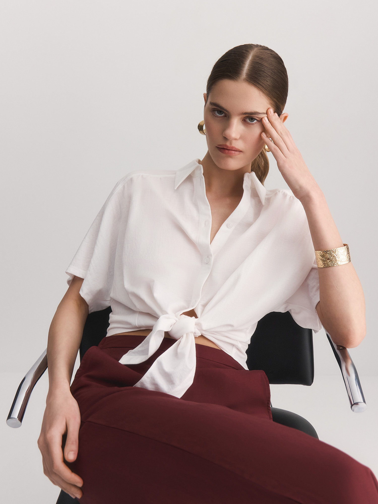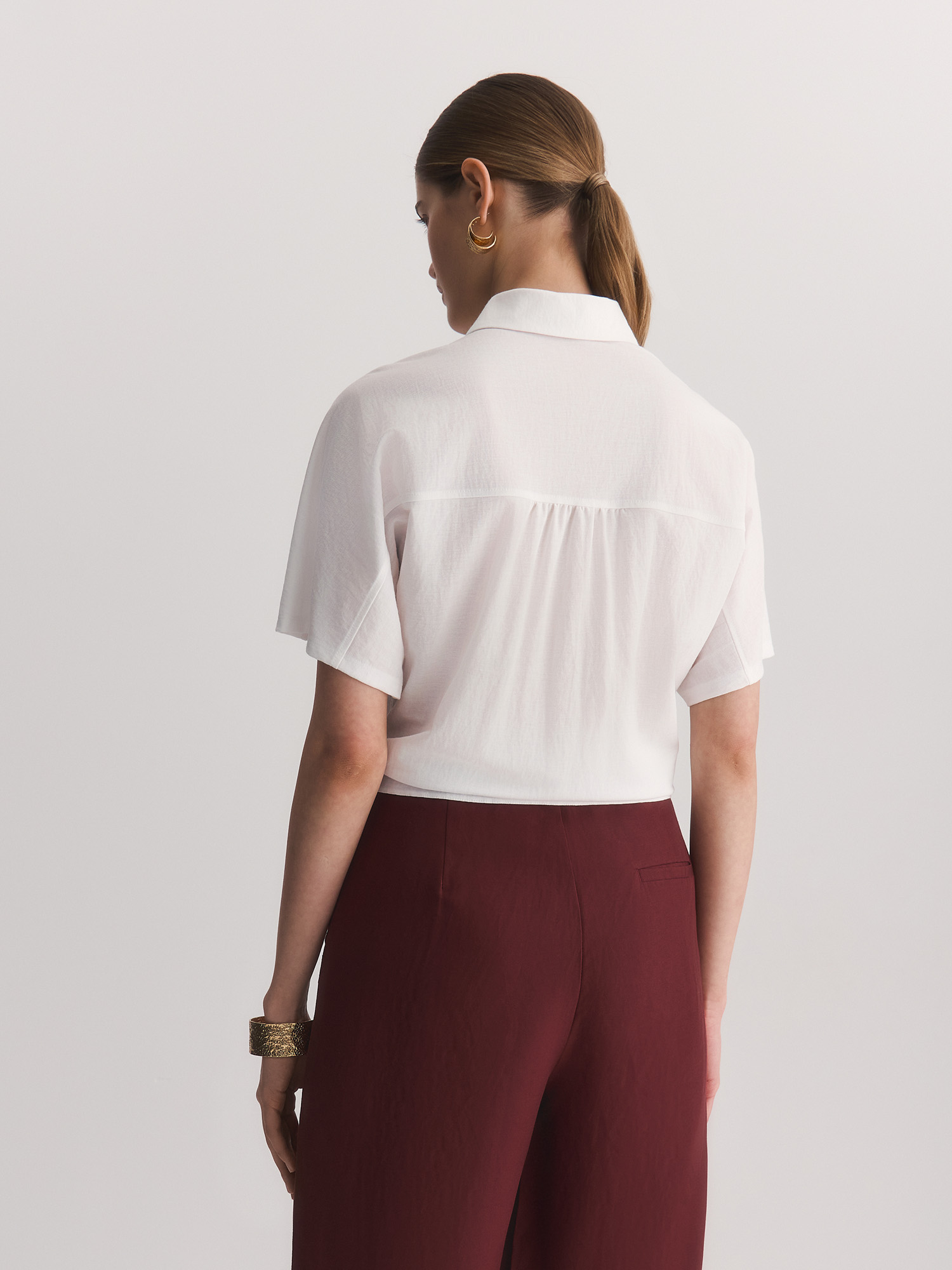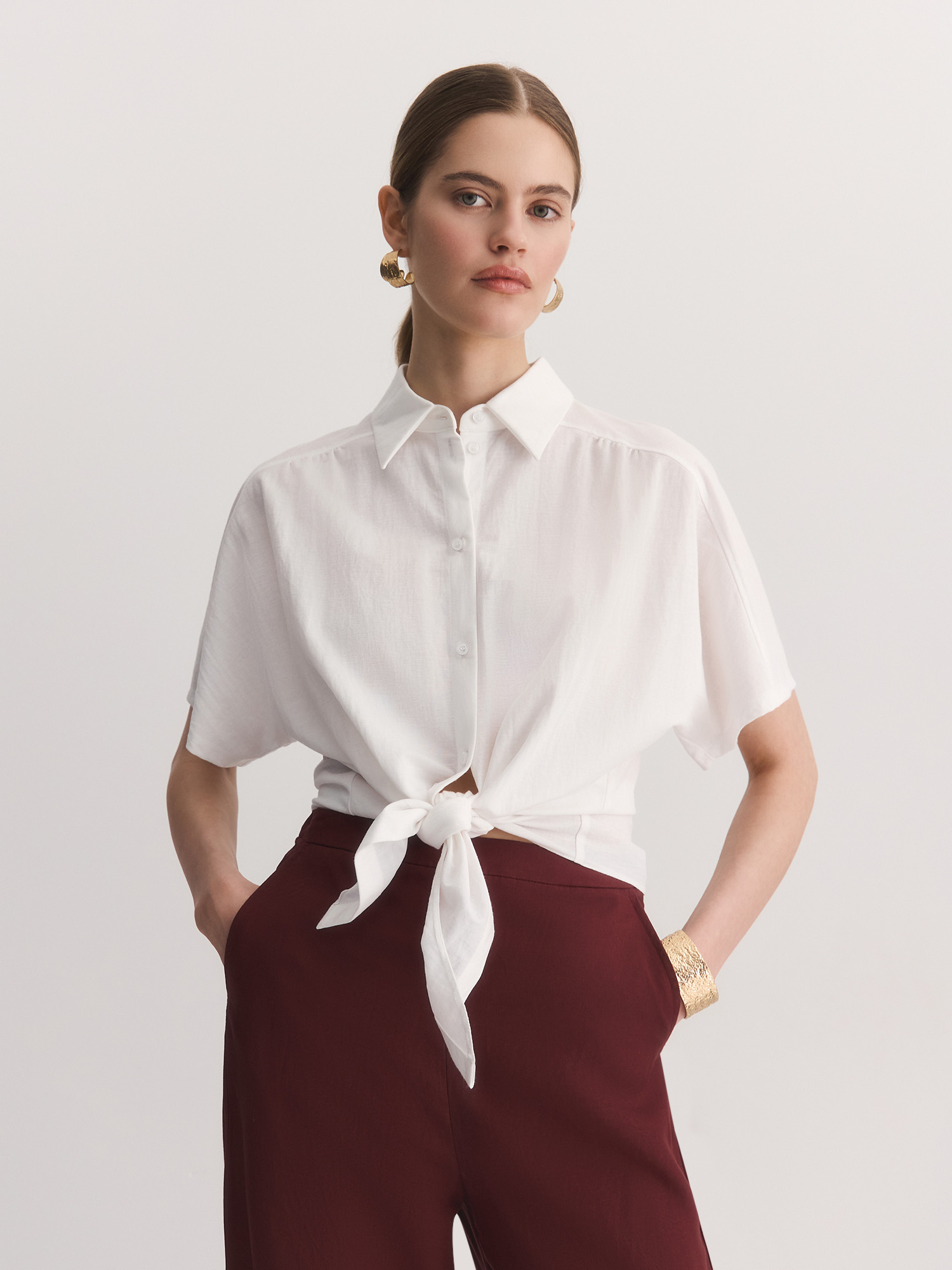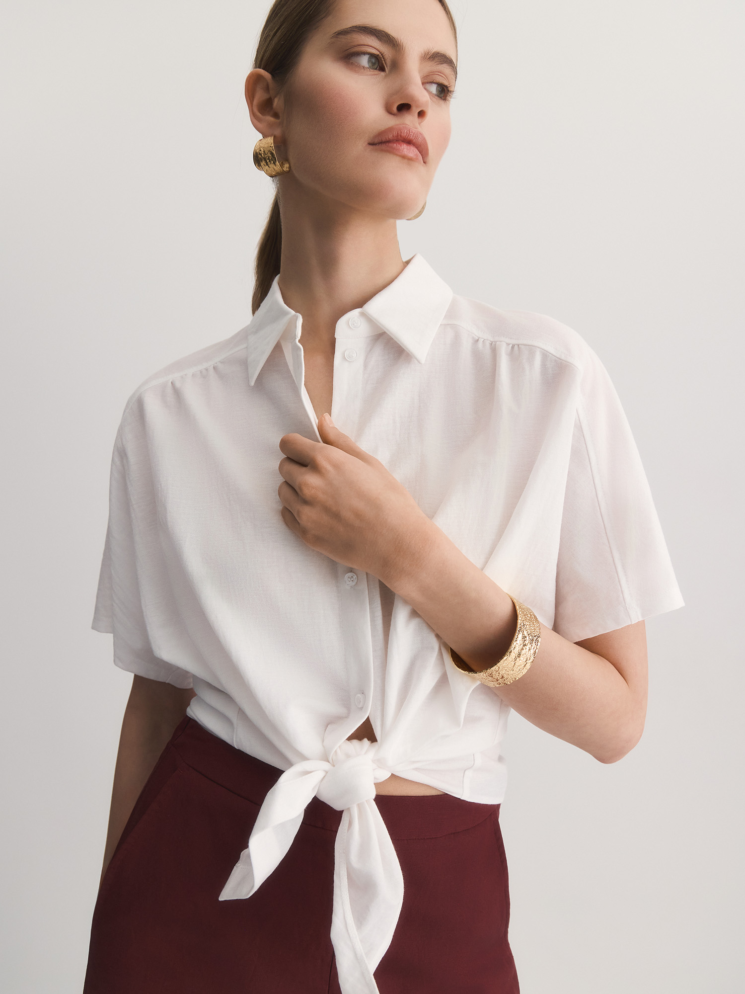 Модель прямого силуэта, с отложным воротником, свободным коротким рукавом, центральной застёжкой на пуговицы и сборками по линии плеча. Удлиненные полы спереди завязаны в комфортный узел.