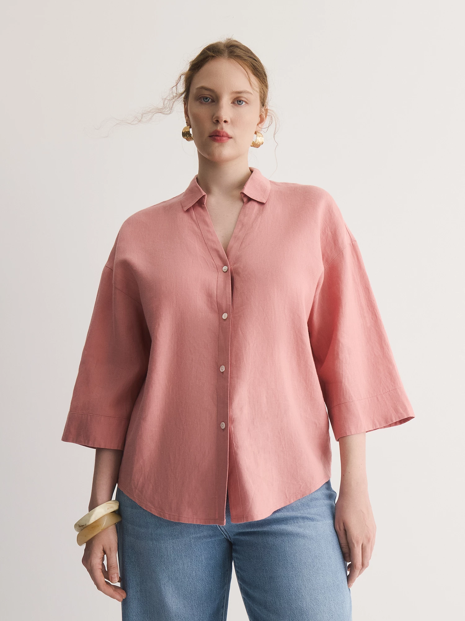 Блуза в приятном розовом оттенке прекрасно сочетается с легкими джинсами DJ0226Y1.
