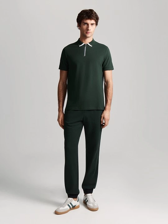 Выбрали для рубашки поло трикотаж-пике хорошей плотности в темно-зеленом оттенке "платан", насыщенном и и поддерживающем цветовую гамму капсульной коллекции. Пике легко узнать – благодаря особому переплетению нитей, на лицевой стороне изделия Вы можете увидеть рисунок, напоминающий соты. У трикотажа пике высокие эксплуатационные характеристики – он прочный, износостойкий, очень хорошо пропускает воздух и впитывает влагу за счет высокого содержания хлопка. Поло комфортного силуэта regular выполнено без традиционной планки, вместо нее сделали застежку на молнию, вместе с белой отделкой воротника, белая молния создает интересный акцент. Вязаный воротник и манжеты придают модели аккуратный и завершенный вид. Изделие декорировано небольшим металлическим брендированным украшением.