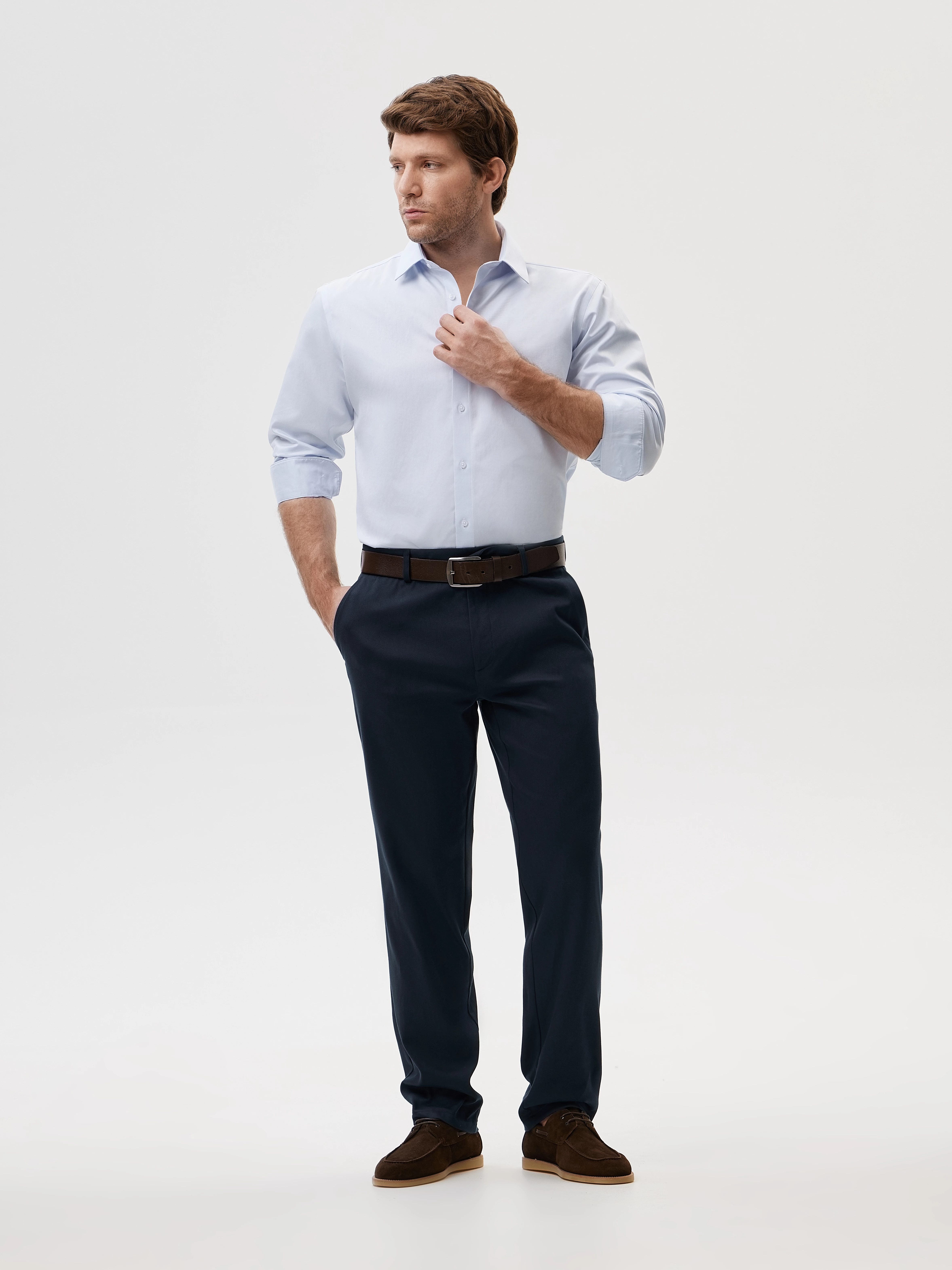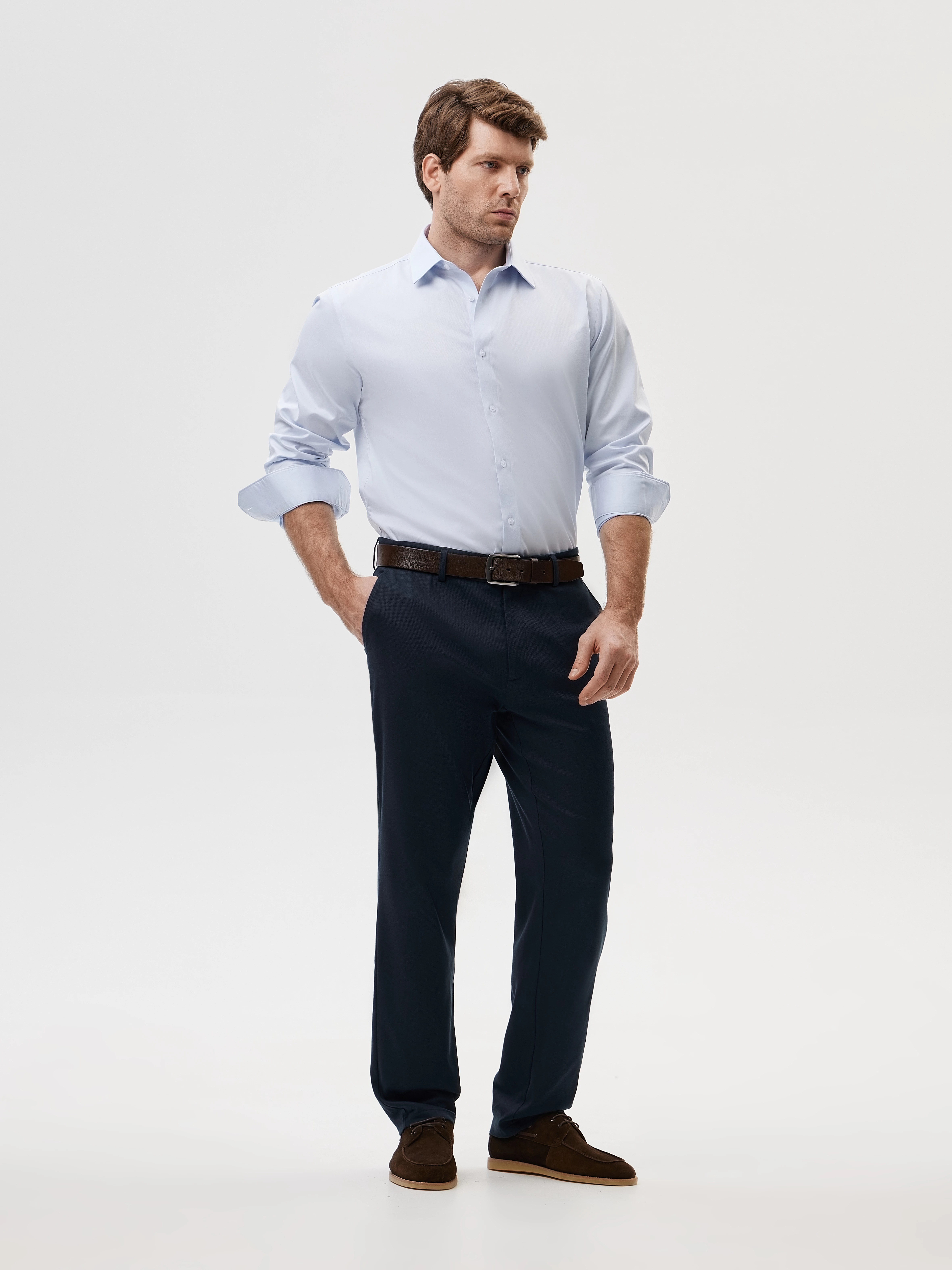 Технология non iron (или "не требует глажки") создана для занятых мужчин, ценящих практичность и стиль, она упрощает уход за рубашкой, сохраняя её опрятный вид даже после стирки. Non iron - это специальная обработка ткани, которая позволяет сохранить опрятный вид рубашки, минимизируя необходимость утюжки. Модель лаконичного дизайна сочетает строгость и современность. Отложной воротник на отрезной стойке и застежка на планку с пуговицами дисциплинируют, а узкая кокетка на спине и закругленный низ придают современный акцент, подчеркивая внимание к деталям. Рубашка выполнена из хлопка, который обеспечивает высокий уровень комфорта, гипоаллергенность и воздухопроницаемость, делая её приятной для ношения в течение всего дня. Голубой цвет создает свежий и стильный образ, подходящий для офиса и повседневной носки. Он легко комбинируется с другими элементами гардероба. Силуэт slim обеспечивает комфортное облегание, подчеркивая фигуру. Такой эффект стал возможен благодаря выверенным вертикальным вытачкам на спине. Отложной воротник на косточках сохраняет форму и добавляет рубашке элегантности, а длинный втачной рукав с манжетом позволяет регулировать длину, создавая аккуратный вид. Узкая кокетка на спине улучшает посадку, а закругленный низ добавляет удобство при ношении навыпуск. Такая рубашка подчеркнет стиль и добавит образу элегантности в любой ситуации.