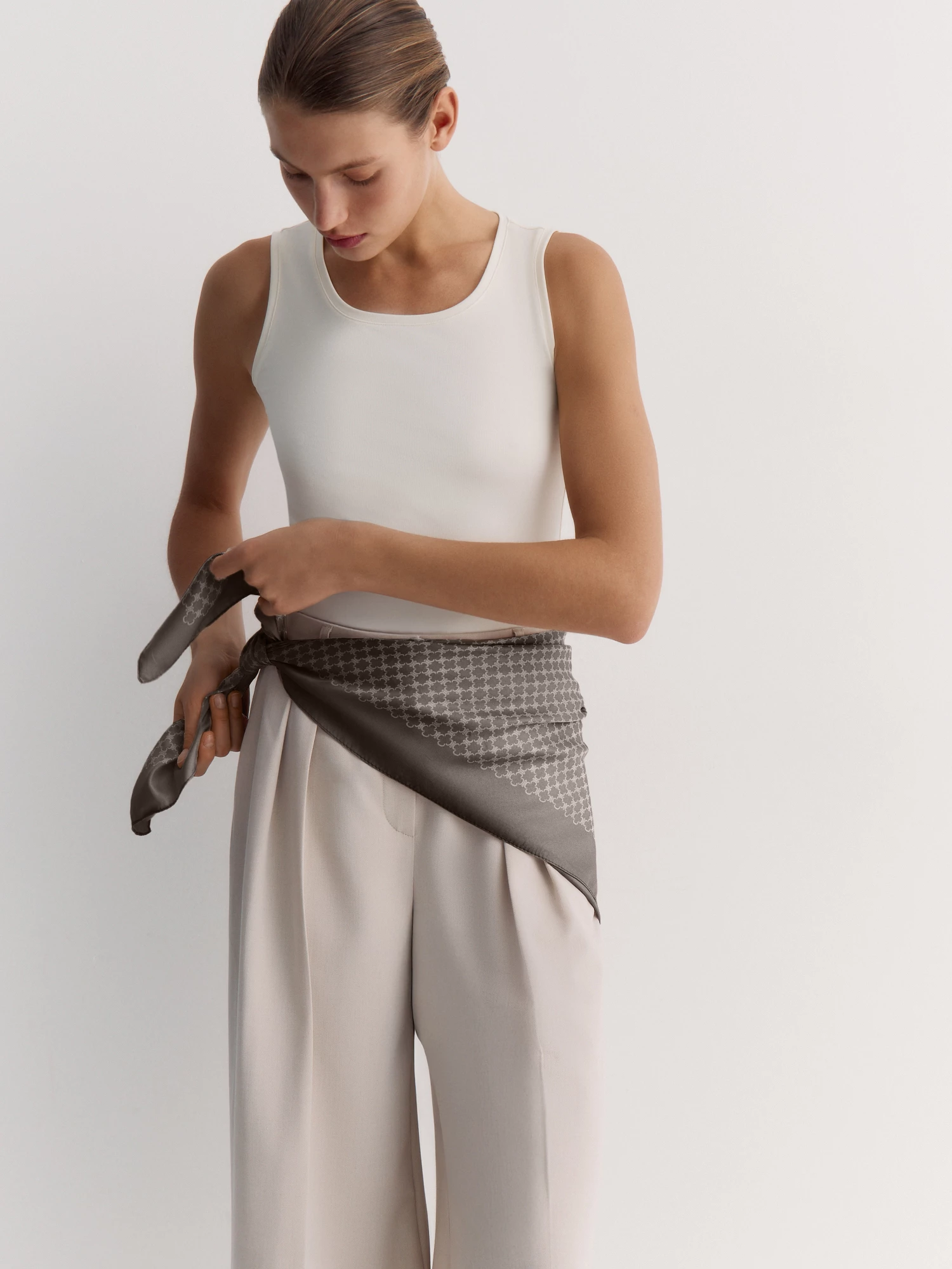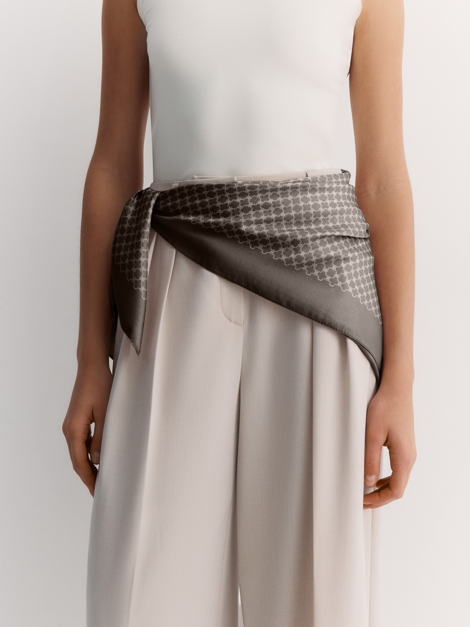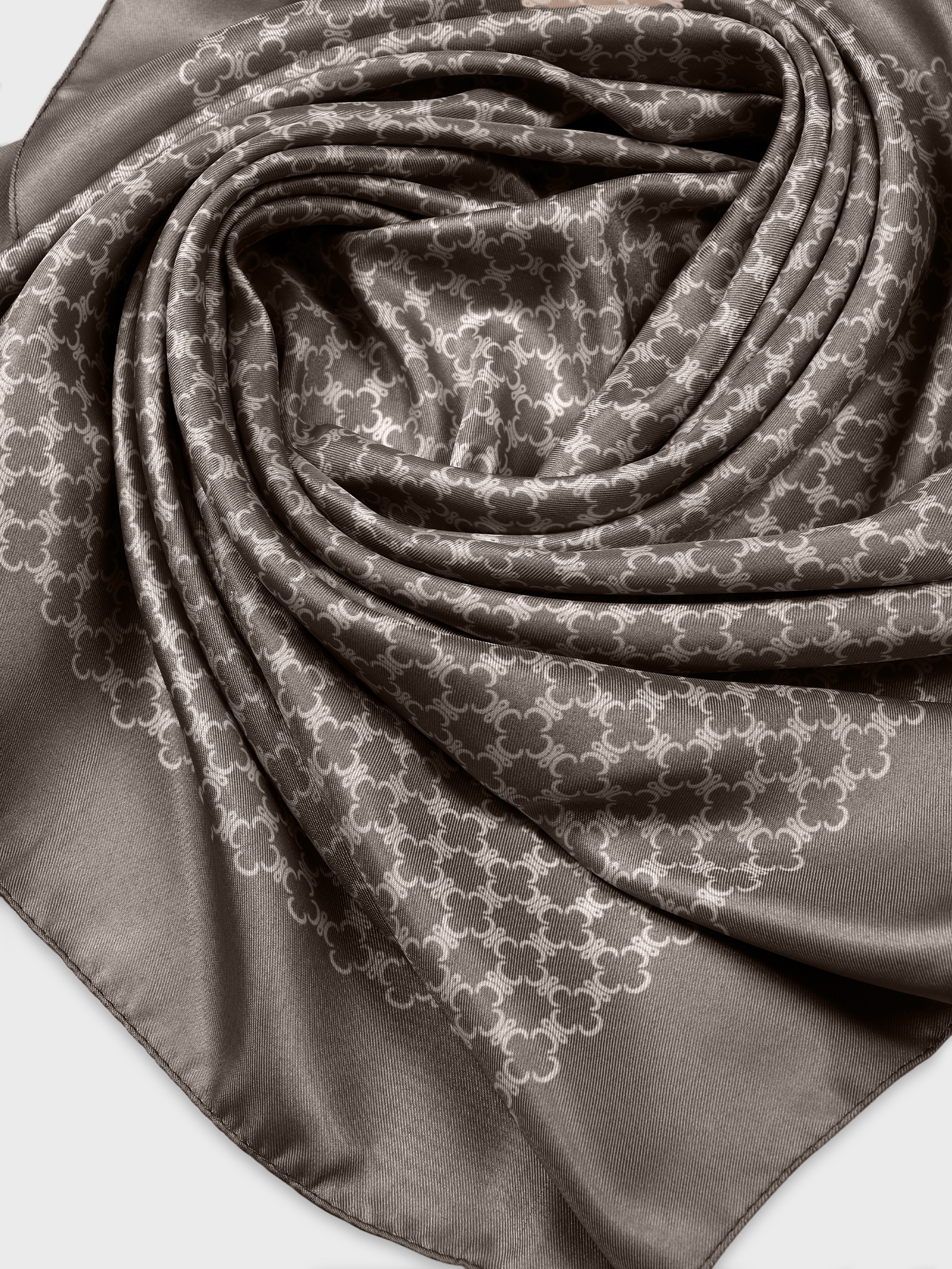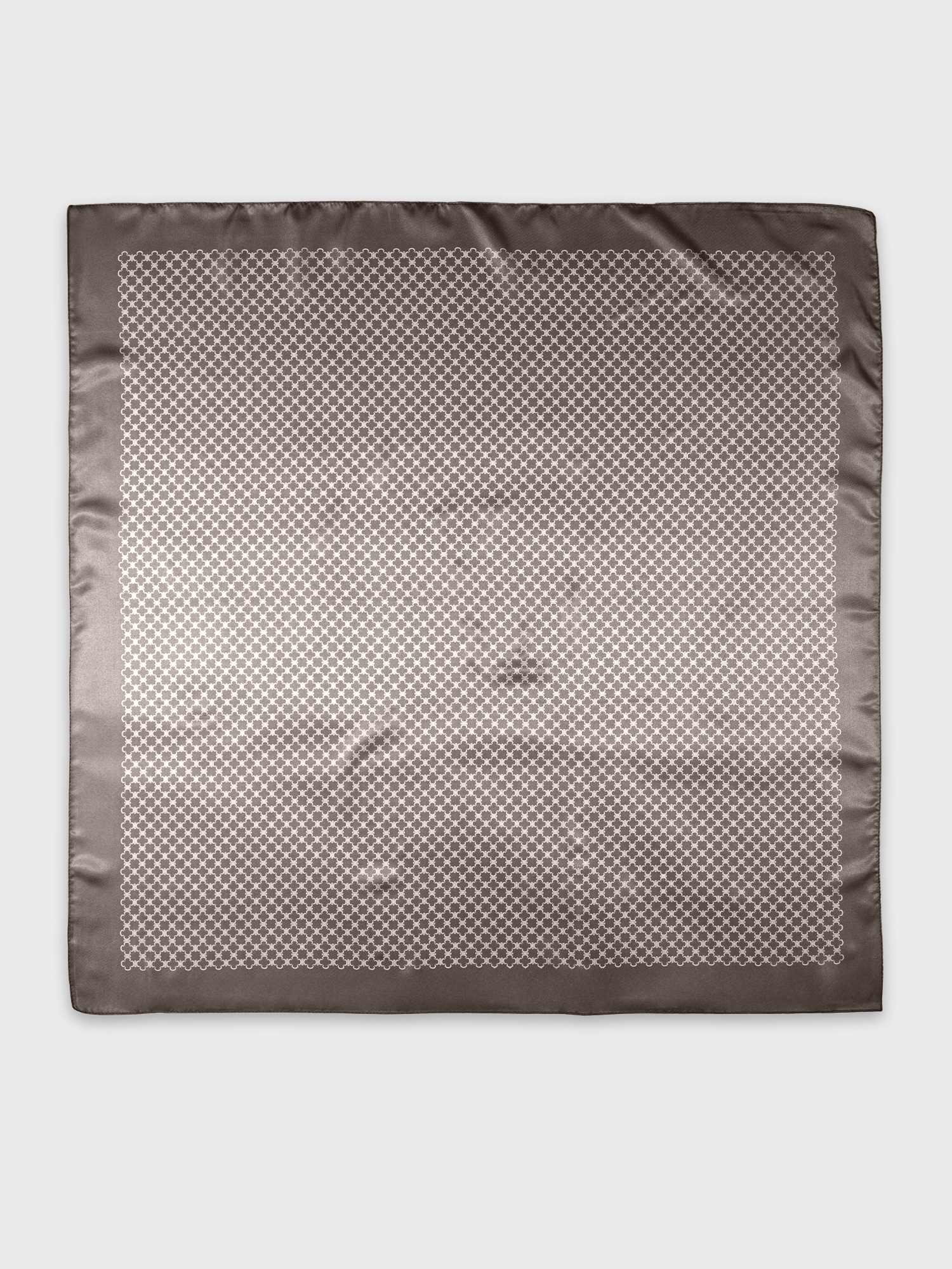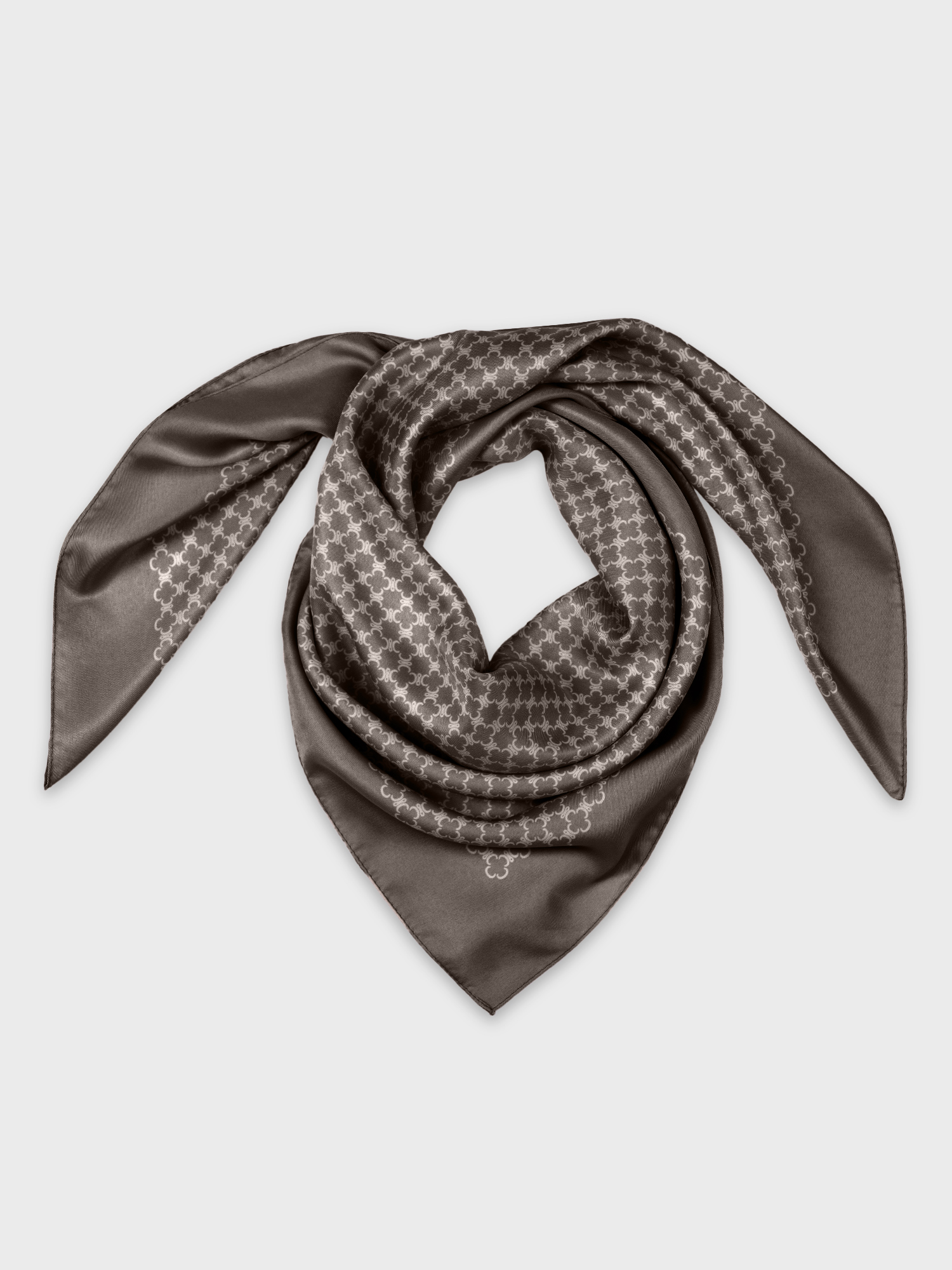 Шелковистый платок - актуальный и универсальный аксессуар. Привлекает внимание мелкий графичный рисунок на благородном коричневом фоне - воплощение классики в современном прочтении. Повторяющийся геометрический узор не конфликтует с другими принтами в образе.