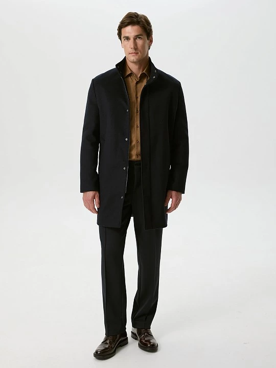 Пальто в строгом темно-синем цвете - участник базового гардероба, подойдет и к деловым образам, и логично завершит комплект в стиле casual. Выбрали для модели воротник-стойку и втачной двухшовный рукав хорошо держащий форму. Застежку на молнию закрыли внешним ветрозащитным клапаном на кнопках. Функциональные боковые карманы с листочками поддерживают общий стиль изделия. Пальто средней длины дополнено шлицей, обеспечивающей уверенный шаг. Полная подкладка гарантирует лучшую посадку. Для удобства добавили два внутренних кармана - прорезных "в рамку", оба застегиваются на молнию. Модель является полноценной демисезонной, а также подходит для зимы, ведь овечья шерсть хорошо согревает и модель дополнительно утеплена синтепоном. Вы можете завершить таким пальто костюмный образ, надеть его с джинсами и джемпером, или с костюмом, ведь качественная шерстяная итальянская ткань, классический крой и актуальный темно-синий делают модель универсальной, подходящей для офиса, вечернего выхода, повседневной носки, прогулок.