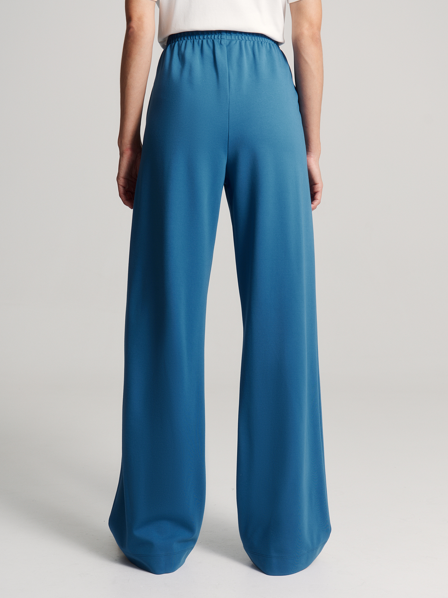 Брюки из вискозного трикотажа – мягкие, уютные и отлично тянутся, чтобы двигаться было комфортно. Синий цвет "глубокая вода" привлекает внимание и делает модель акцентом образа.