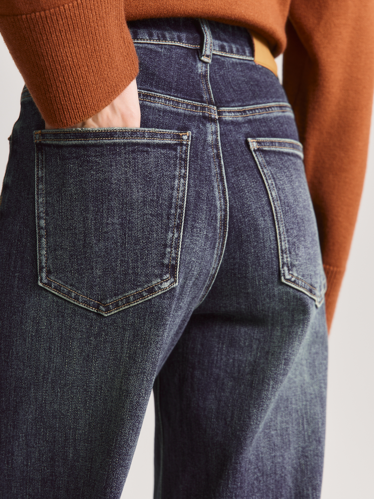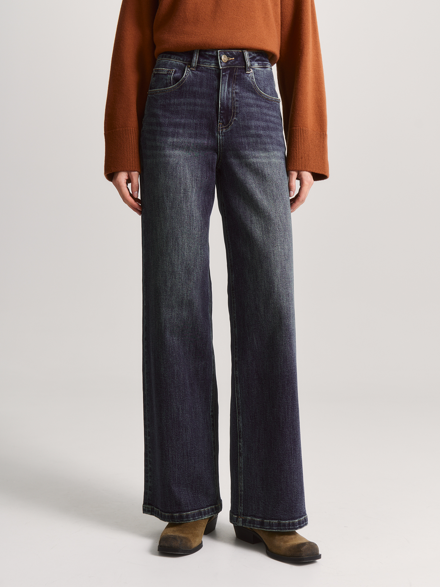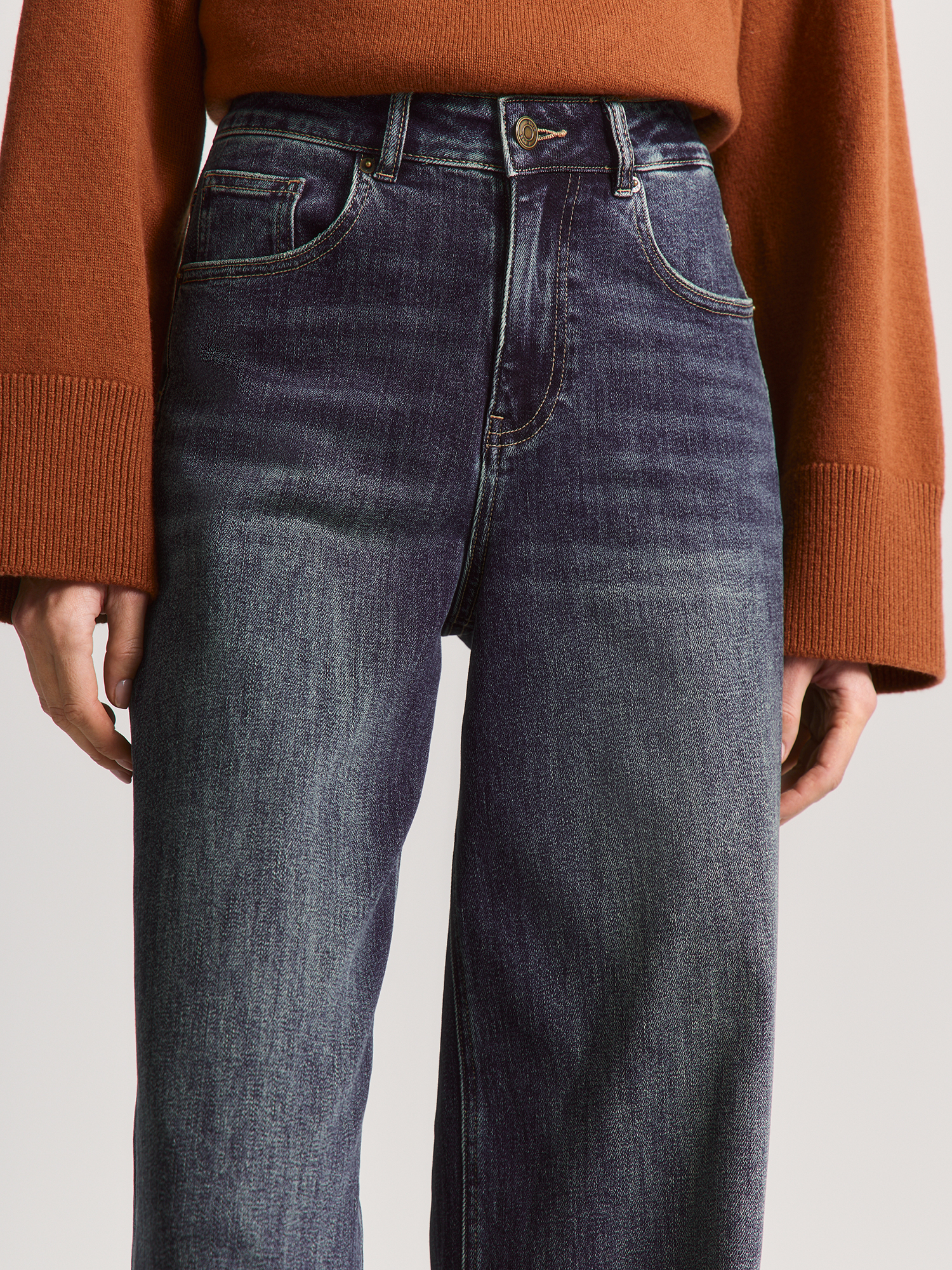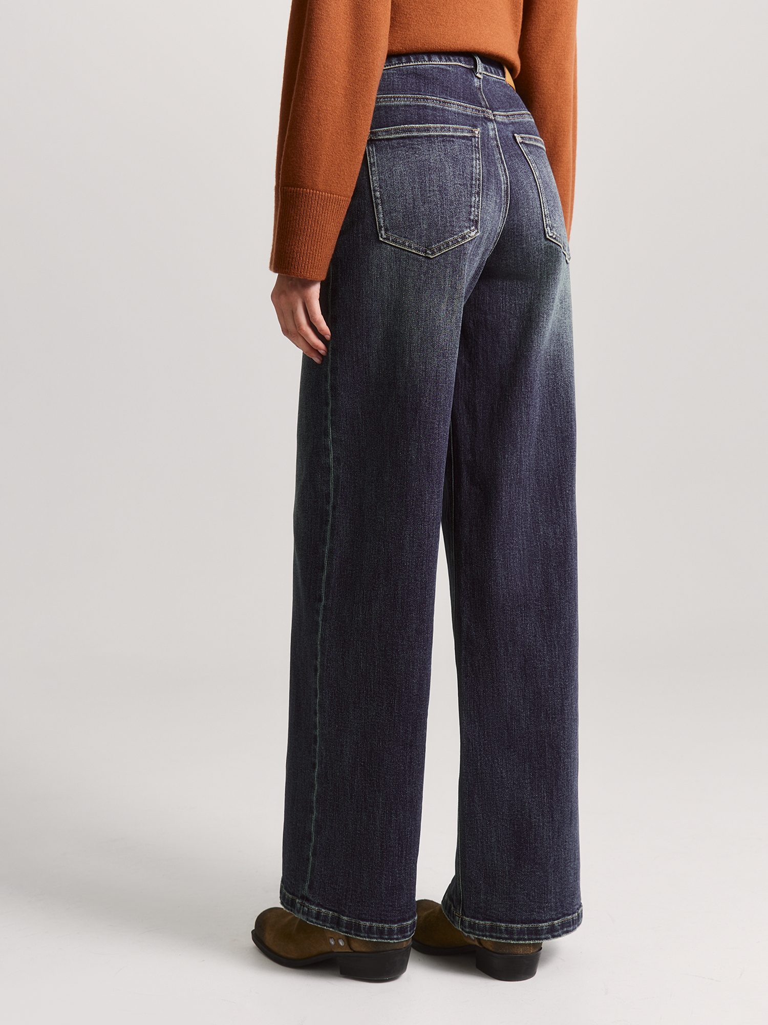 Прямые широкие джинсы - обязательный элемент в гардеробе. Высокая удобная посадка, застежка на молнию и болт, пять традиционных карманов и V-кокетка - идеальная модель для повседневной носки.