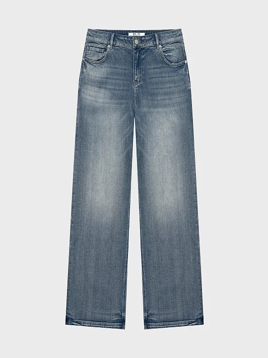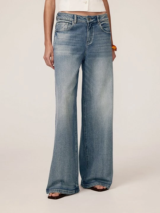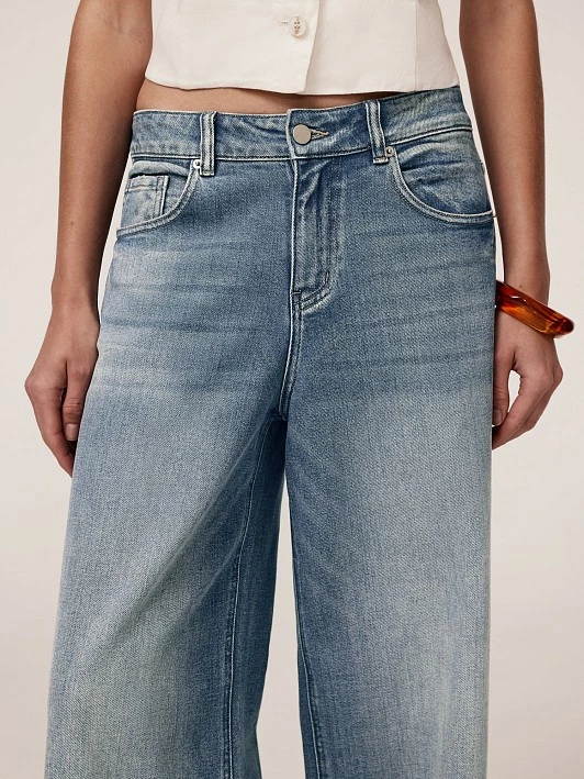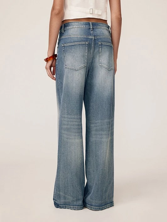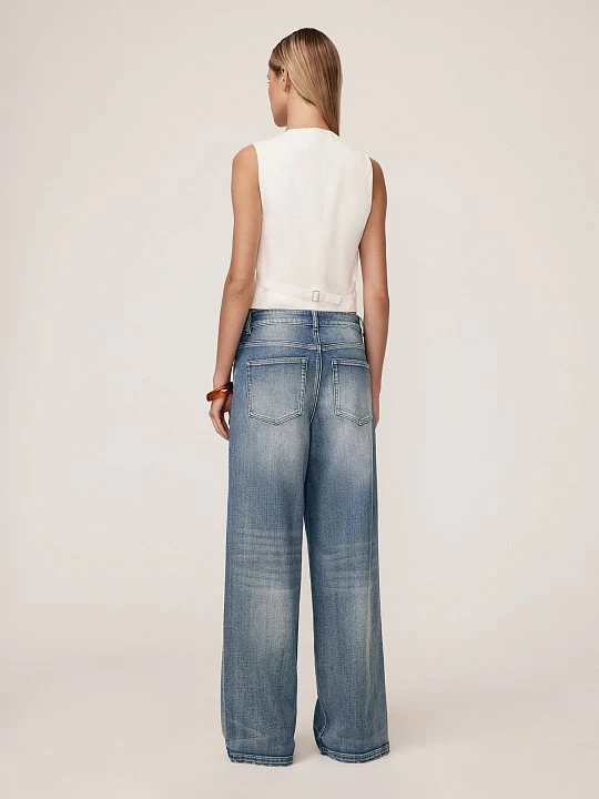Широкие джинсы-пятикарманники wide leg сочетают в себе актуальность и универсальность стиля casual. Свободный крой и практичный дизайн делают их идеальными для повседневной носки. Джинсы выполнены из хлопкового денима, который обеспечивает натуральность, воздухопроницаемость и комфорт. Хлопок приятен к коже и не вызывает раздражения, кроме того, он экологичен и гипоаллергенен. Добавление полиэстера повышает прочность и долговечность, а спандекс обеспечивает формоустойчивость. Потертости заявляют об уникальных рисунках варки. Активная варка на синем фоне привлекает внимание к традиционным пяти карманам, застежке и скульптуре швов. Такой прием визуально стройнит и подчеркивает повседневную стилистику, делая акцент на удобстве и практичности. Цель варки – придать готовому изделию мягкость и потертость, позволяющую выгодно обрисовать фигуру. Слегка потрепанный низ позволяет чувствовать себя свободной и дерзкой. Прямой широкий крой wide leg визуально удлиняет ноги и добавляет образу легкости. Средняя посадка обеспечивает актуальный расслабленный силуэт, а кокетка сзади, практически прямая, без выраженной V-формы, графически поддерживает такую посадку. Эти джинсы — сочетание трендового дизайна, комфорта и универсальности.