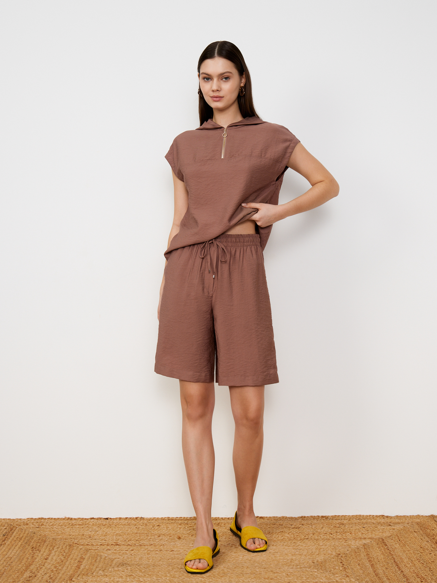 Повседневные шорты-бермуды оттенка горький шоколад выполнены из лёгкого вискозного полотна. Дышащий материал приятен к коже и почти не мнется. Модель прямого силуэта, с притачным поясом с эластичной резинкой и декоративными шнурками. Свободный крой обеспечивает комфортную посадку на любой тип фигуры. С блузой из того же материала составят однотонный тотал-лук для прогулок на природе или отпуска.