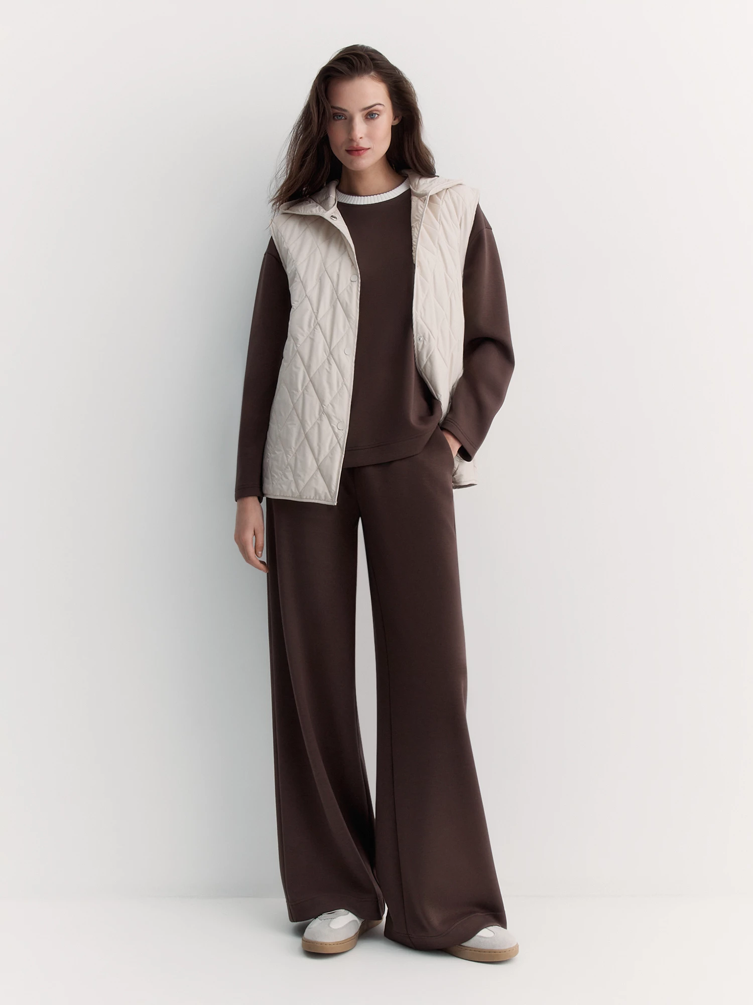 Удобный жилет-безрукавка в актуальном цвете мела – идеальный вариант для прохладной погоды. Сшит из практичной плащевки с влагозащитной пропиткой, которая убережёт от внезапного дождя и ветра. Внутри – лёгкий синтепон, зафиксированный аккуратной стёжкой в виде ромбов. Эта технология не только удерживает утеплитель на месте, но и добавляет жилету стильный внешний вид.