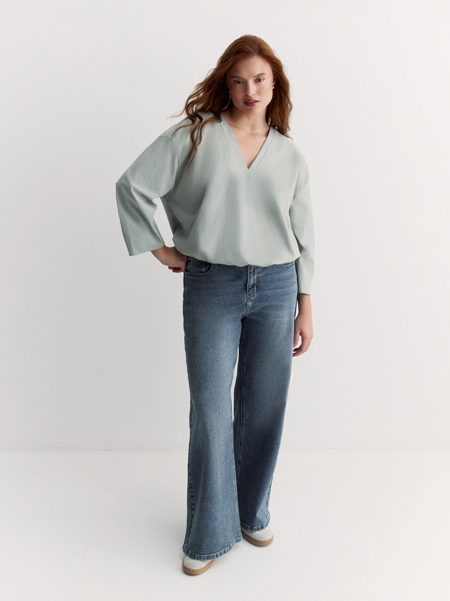 Свитшот из эластичного трикотажа невероятно комфортен. Свободный крой с резинкой по низу, спущенное плечо и наполненные рукава формируют легкий овер, аккуратный V-вырез стройнит силуэт.