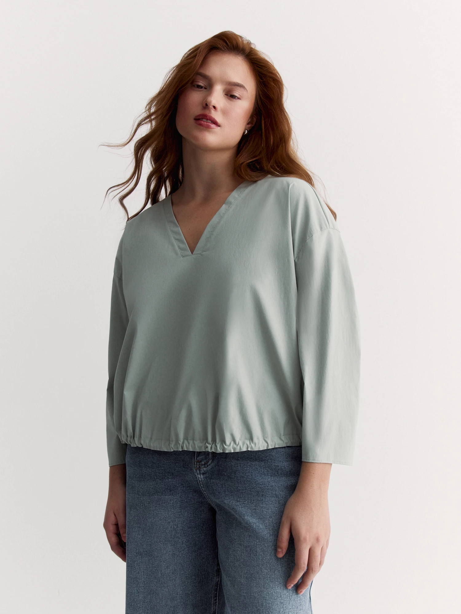 Свитшот из эластичного трикотажа невероятно комфортен. Свободный крой с резинкой по низу, спущенное плечо и наполненные рукава формируют слегка увеличенный силуэт, аккуратный V-вырез стройнит силуэт.