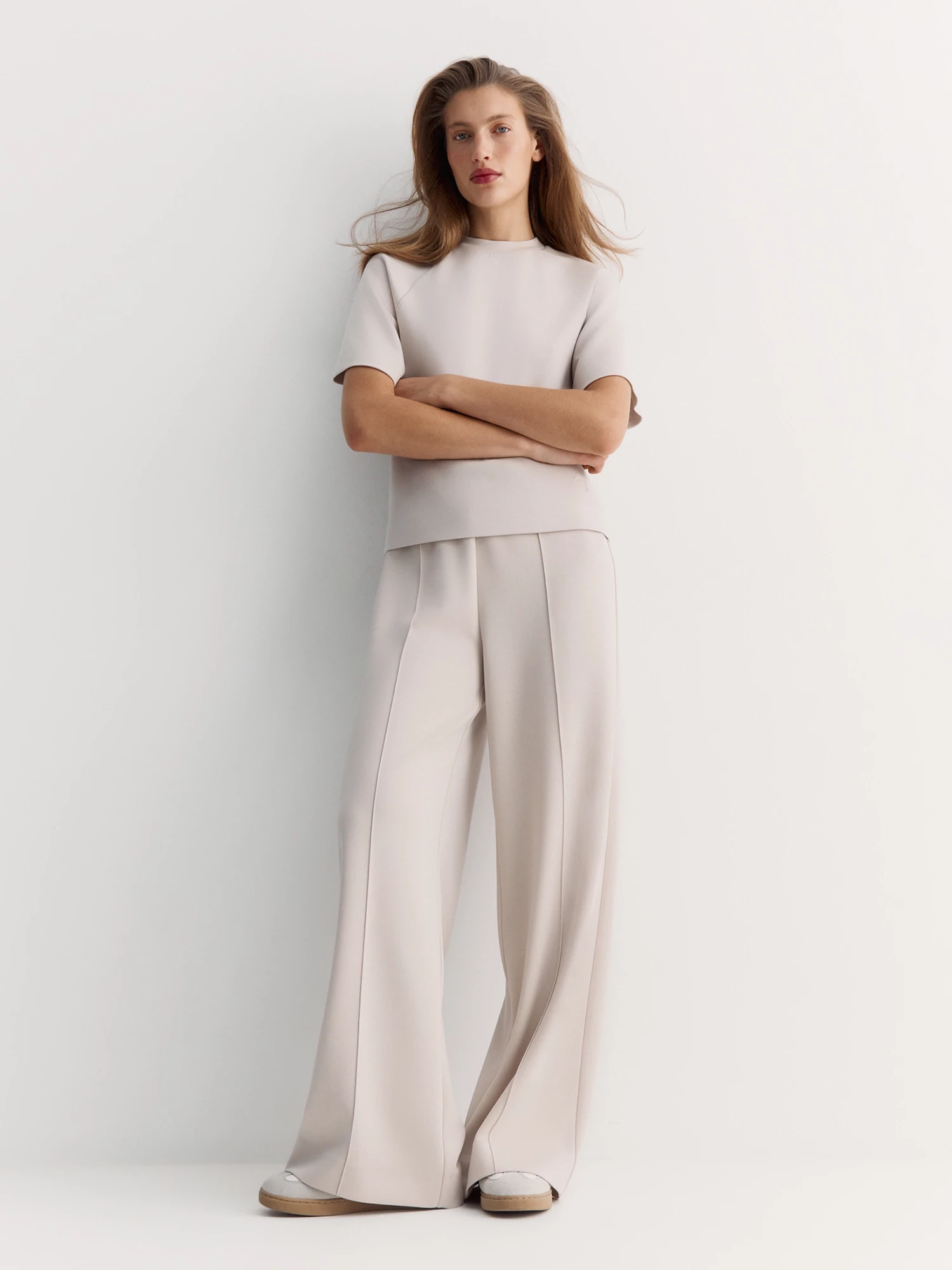 Нейтральный серо-бежевый цвет создает мягкий и уютный образ. Такой свитшот подходит для создания как расслабленных, так и стильных образов, идеально сочетается с брюками PT0008K5P.