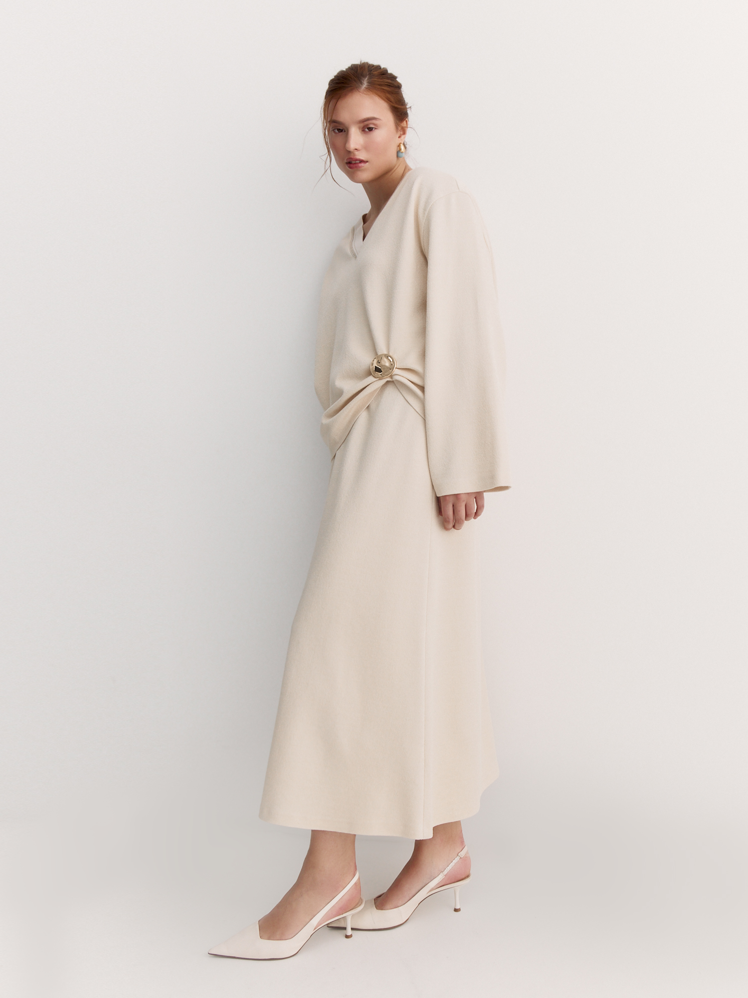 V-образный вырез украшен аккуратным подвязом – это добавляет модели изящную деталь. Спущенное плечо и втачной рукав делают силуэт расслабленным, но аккуратным. Молочный оттенок выглядит нежно и универсально.