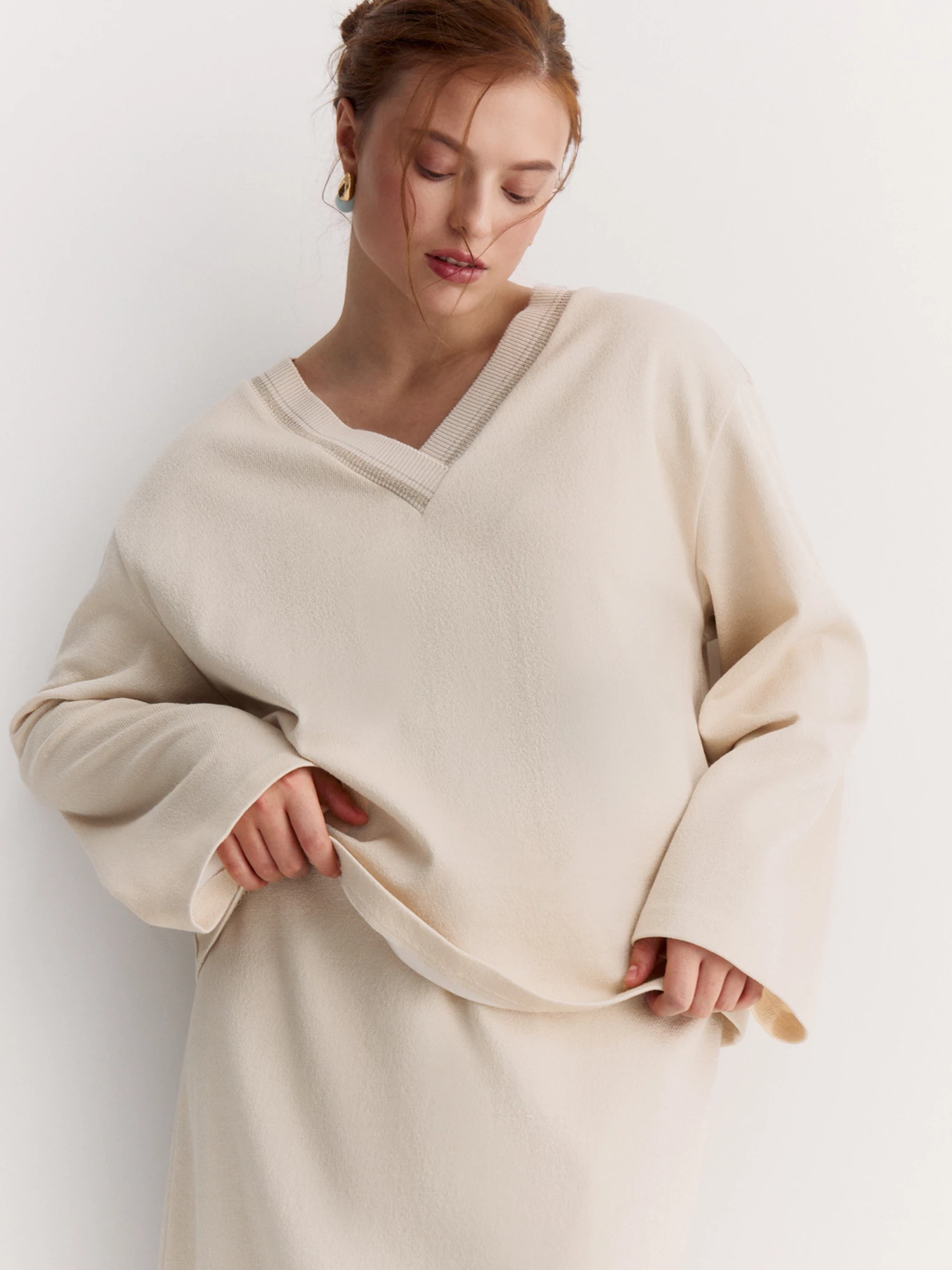 Свитшот слегка увеличенного силуэта с эффектным вырезом – уютный, свободный и стильный. Выполнен из мягкого трикотажа на основе вискозного рэйона (разновидности вискозы), который приятен к телу и хорошо держит форму.