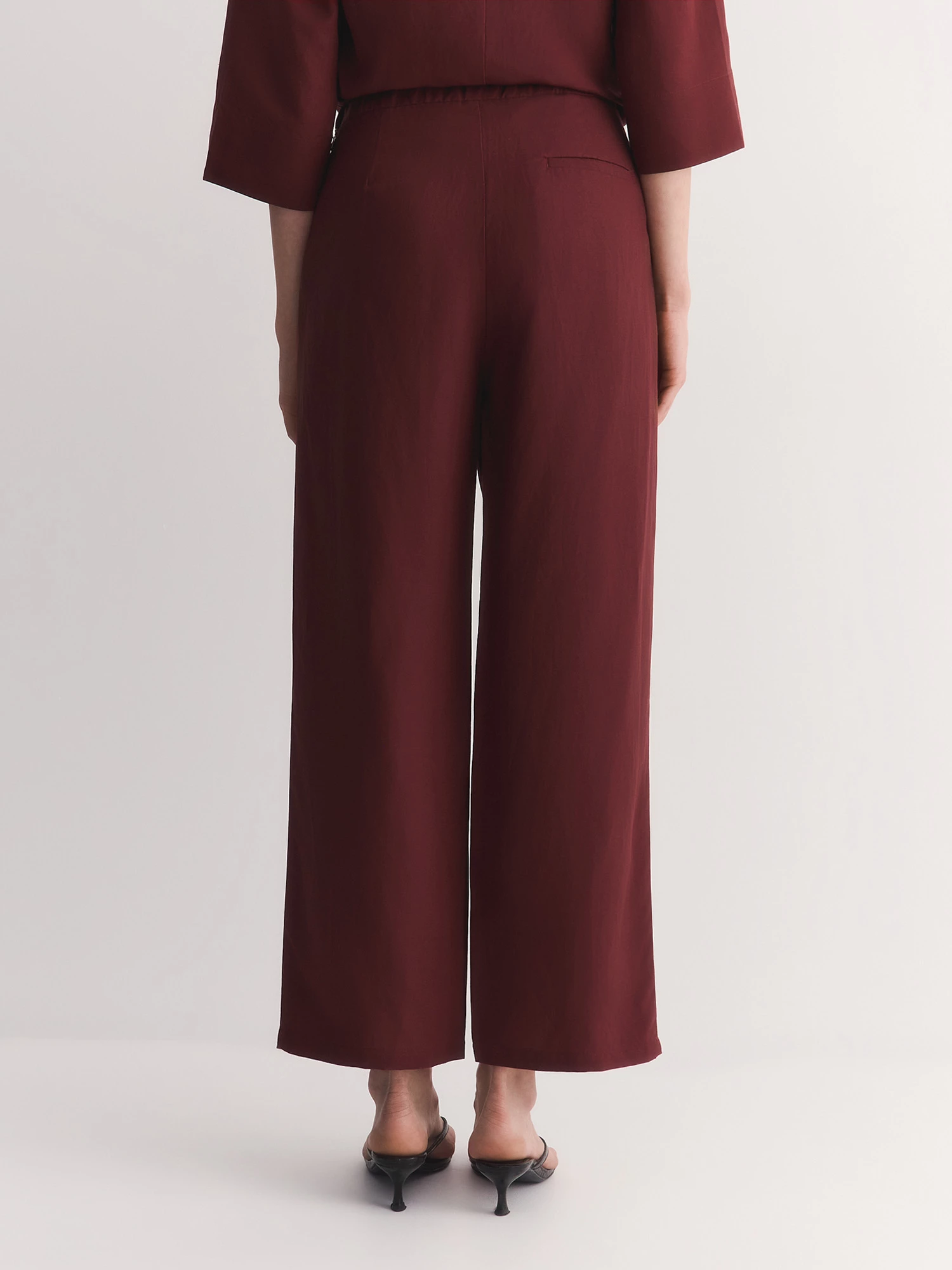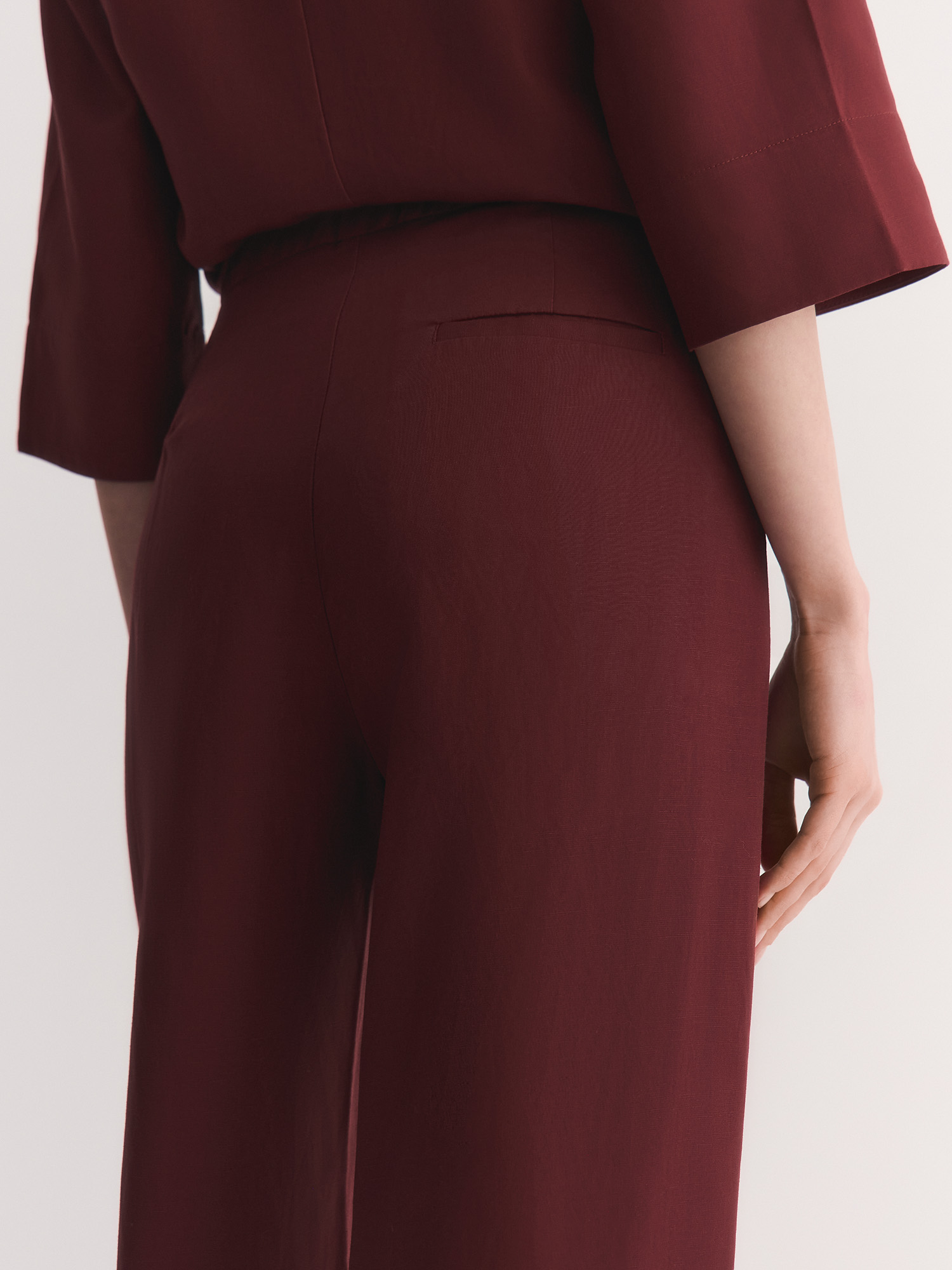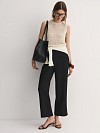 У брюк притачный пояс без шлевок и эластичная вставка сзади – это обеспечивает удобную посадку без лишних деталей. Сзади две аккуратные вытачки и декоративный карман с листочкой, который добавляет стильную изюминку. А еще есть удобные боковые карманы – всегда можно положить телефон или ключи.