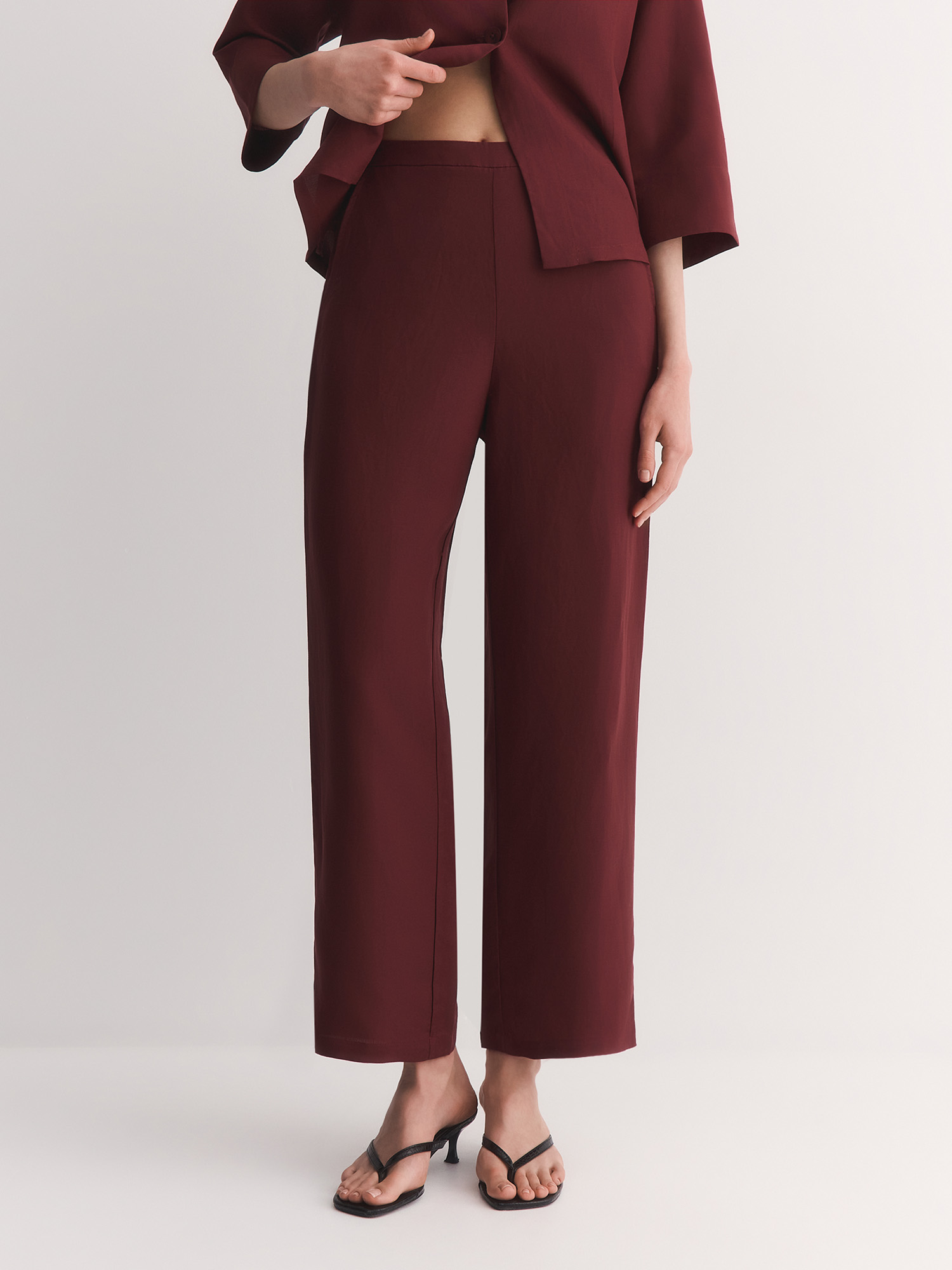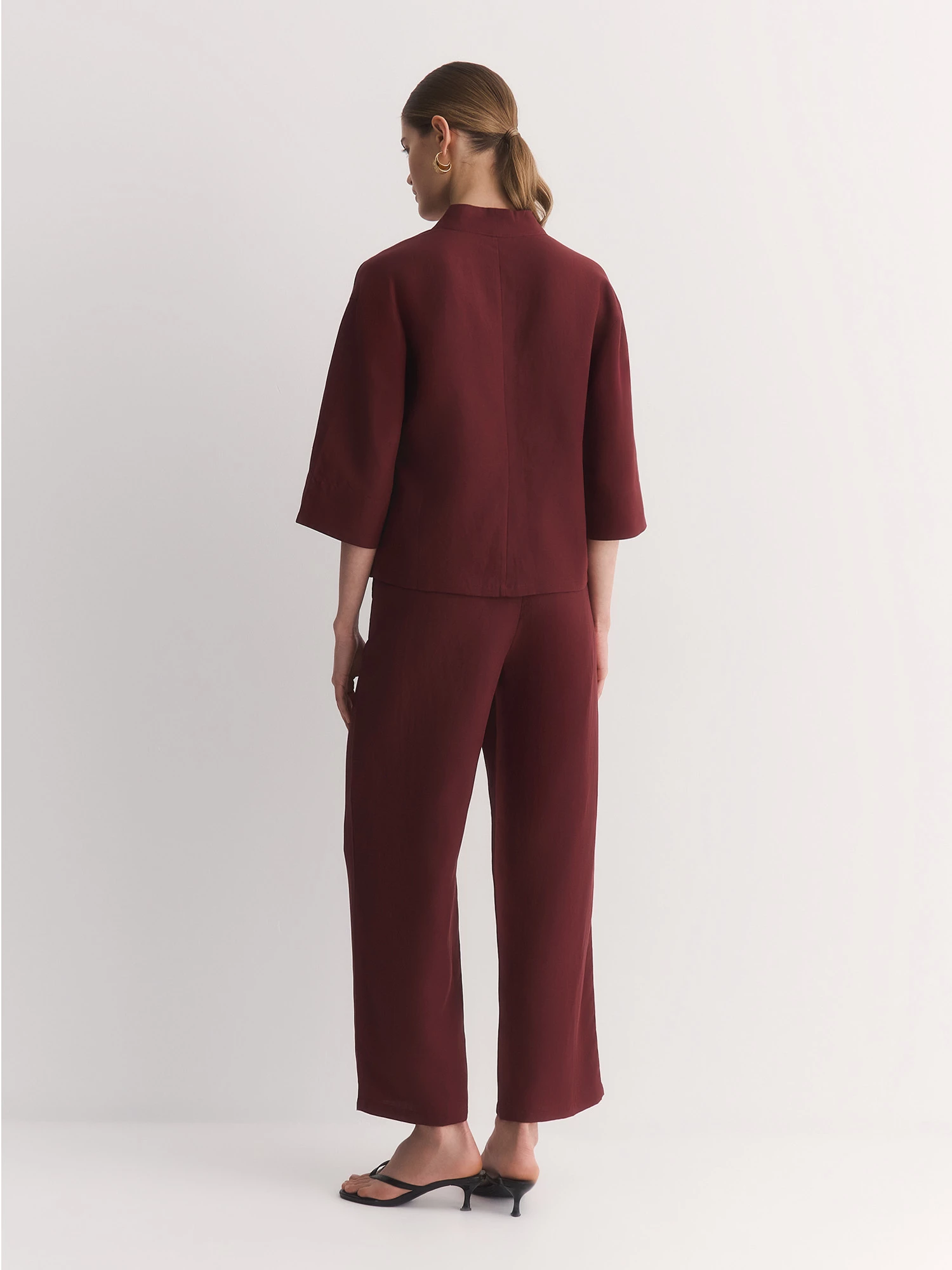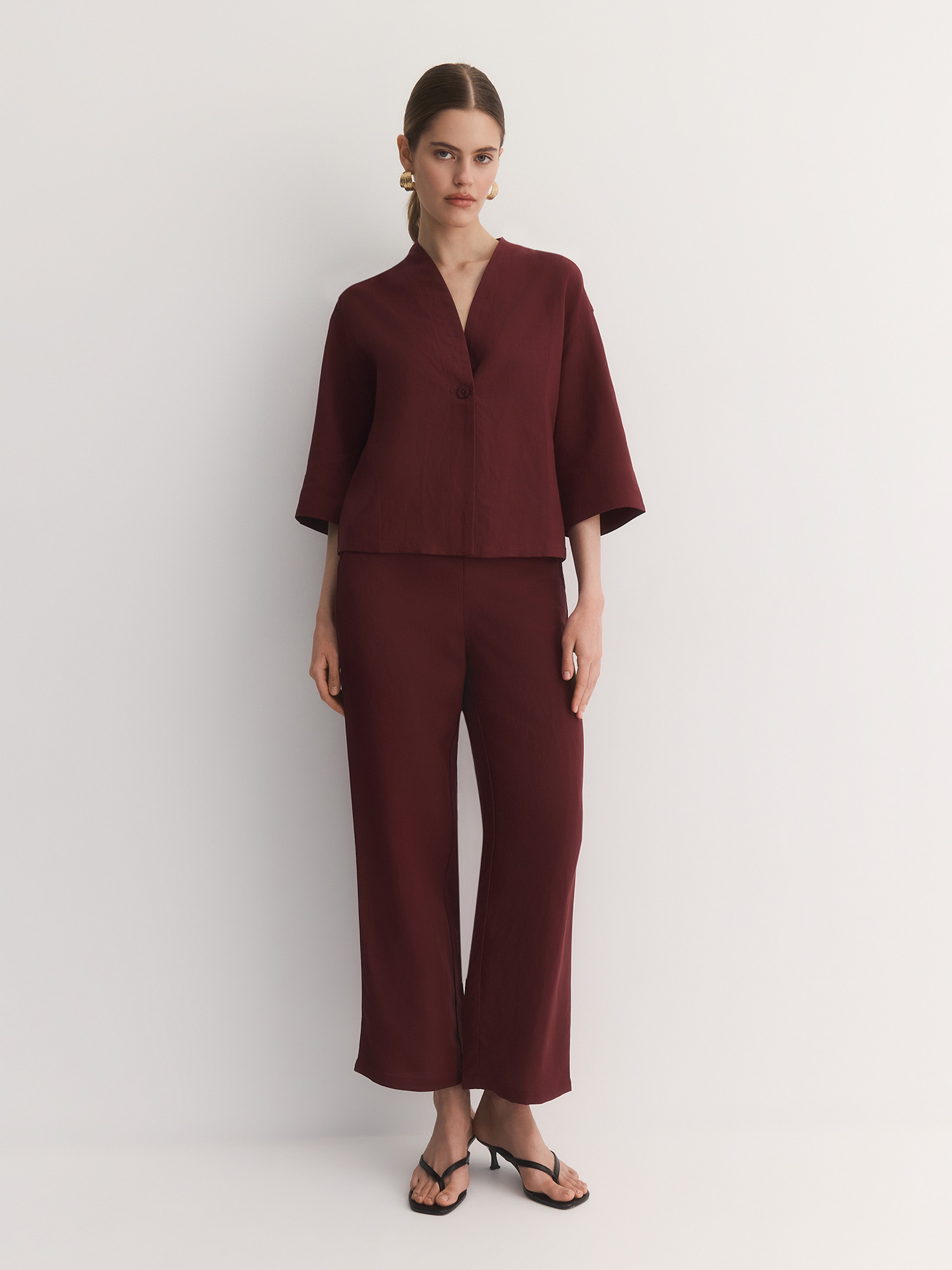 Брюки в терракотовом цвете глины отлично сочетаются с жакетом в стиле кимоно JC0204R, с топом-бестселлером TP0058V5. Легкие, дышащие и непринужденные, они идеальны для летних прогулок, поездок за город или неформальных встреч.