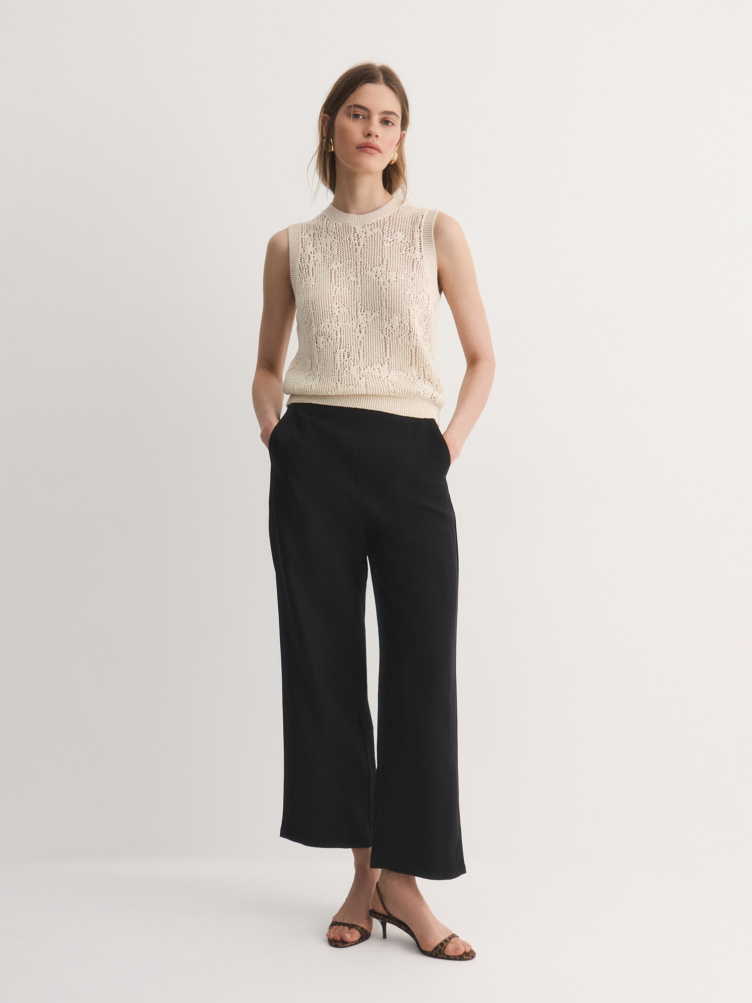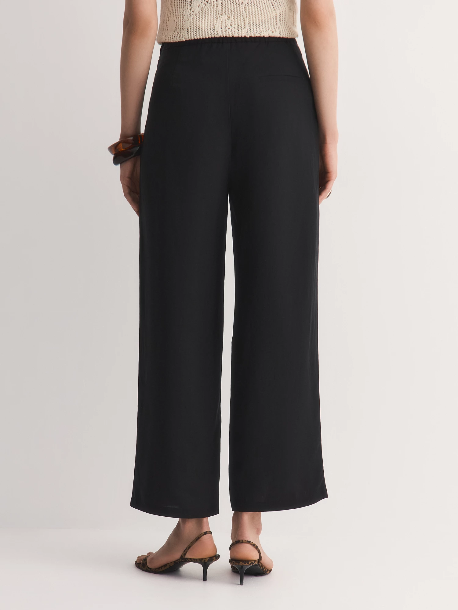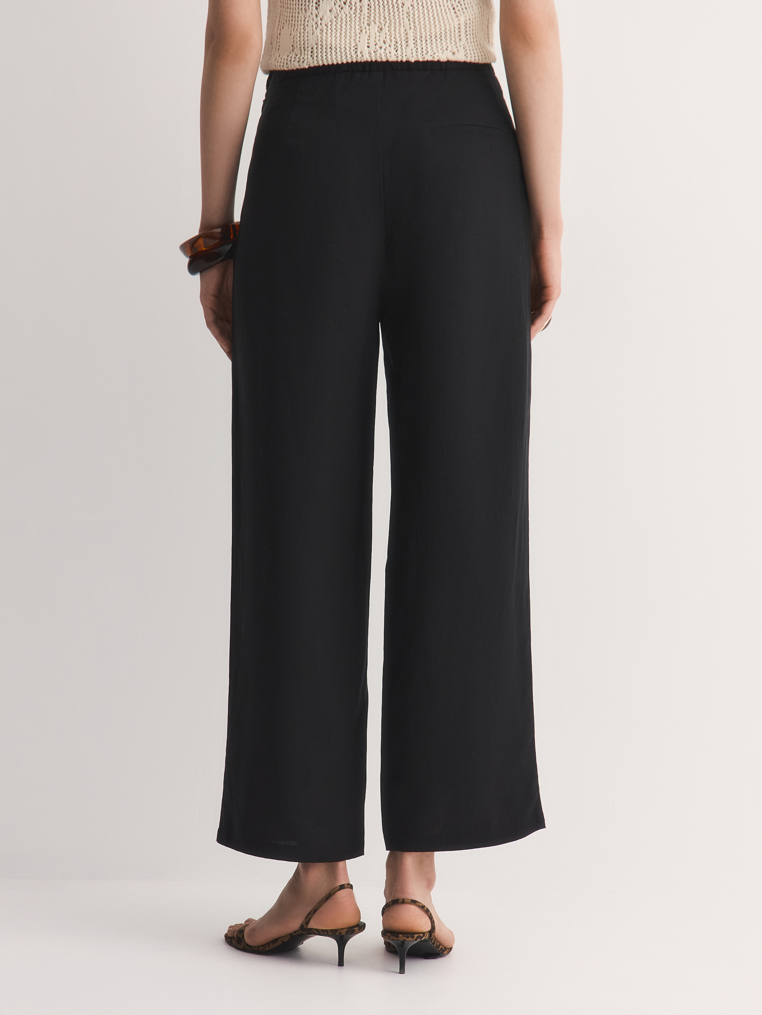 Укороченные брюки свободного кроя – легкая и комфортная модель из смеси льна и вискозы. Натуральный лен обеспечивает отличную воздухопроницаемость, а вискоза добавляет мягкости, делая брюки приятными к телу.