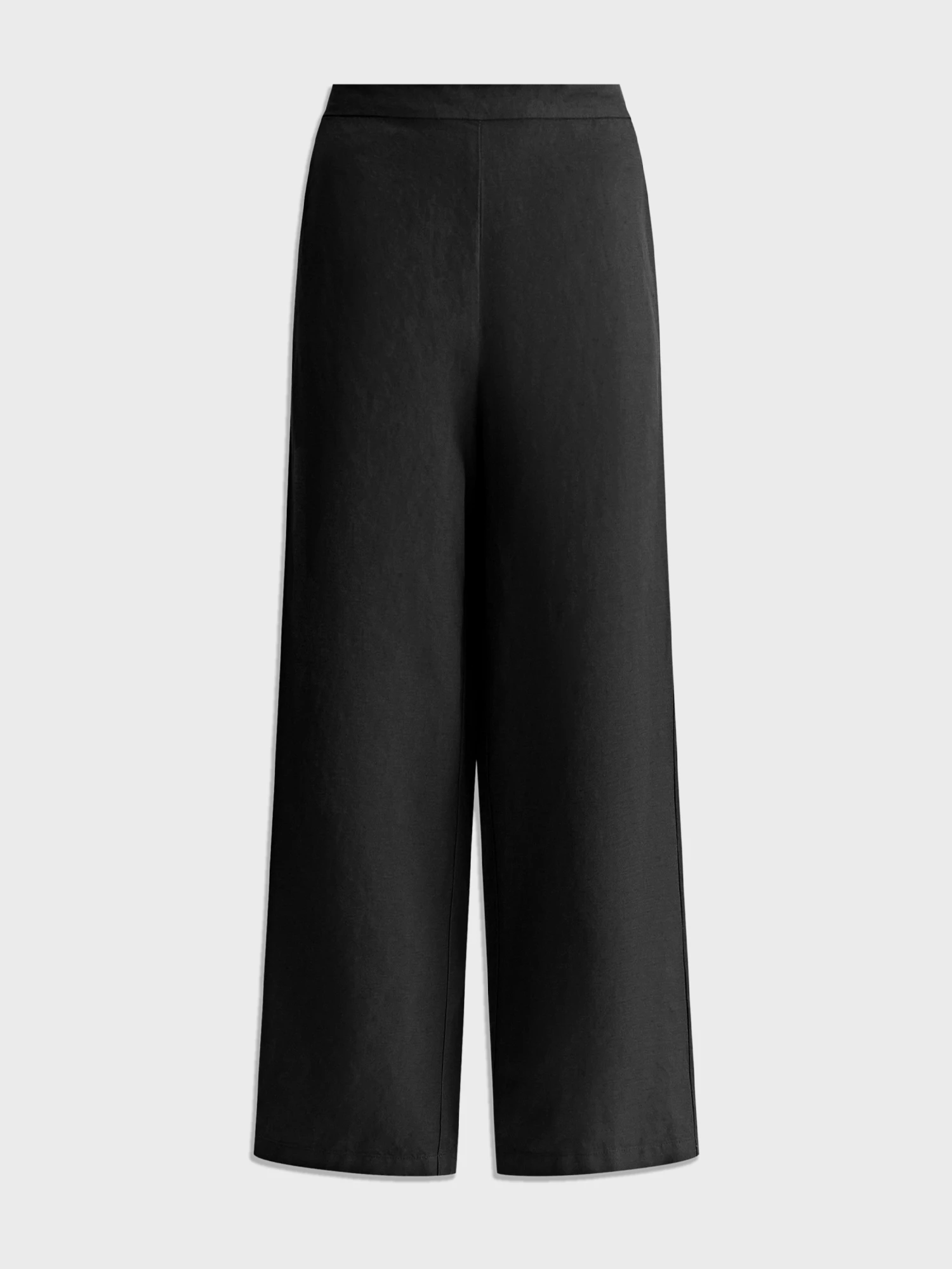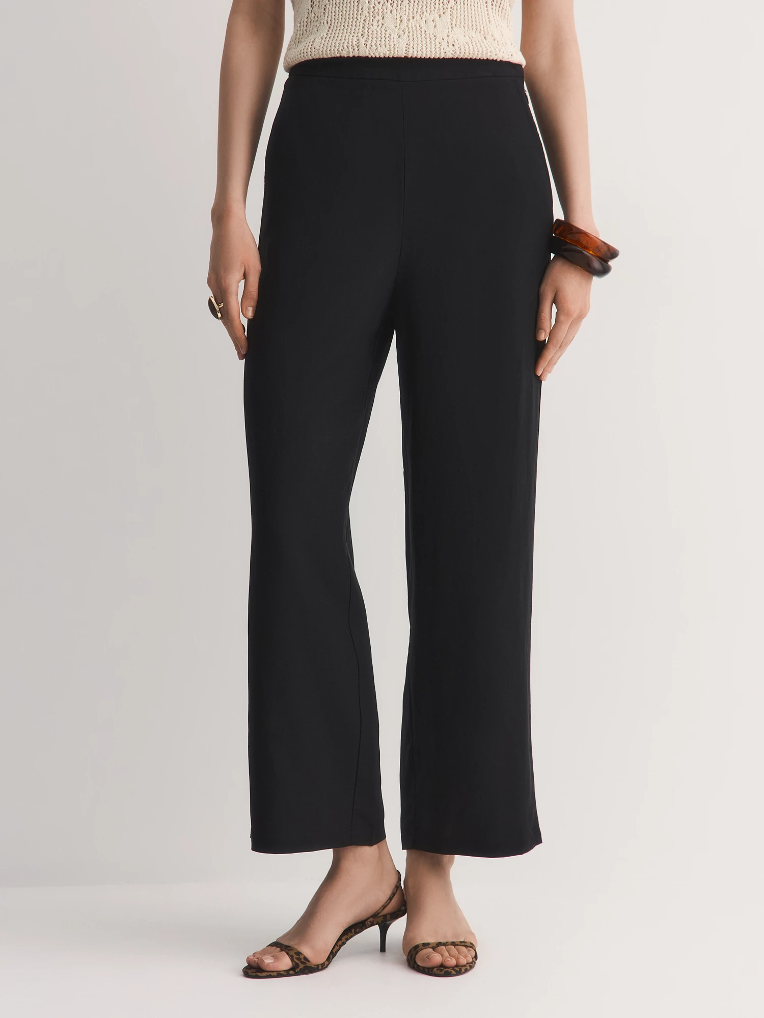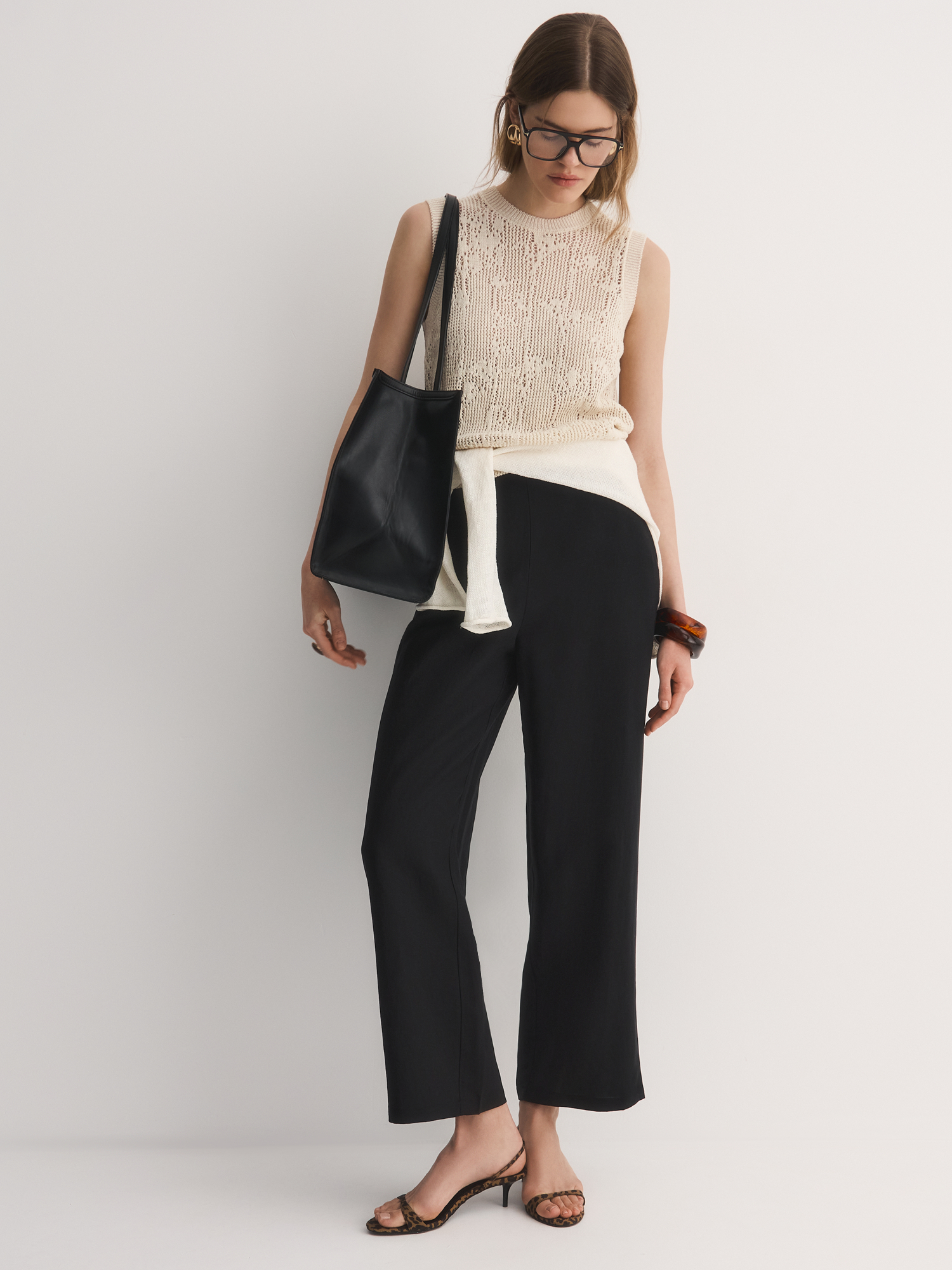 Укороченные брюки свободного кроя – легкая и комфортная модель из смеси льна и вискозы. Натуральный лен обеспечивает отличную воздухопроницаемость, а вискоза добавляет мягкости, делая брюки приятными к телу.
