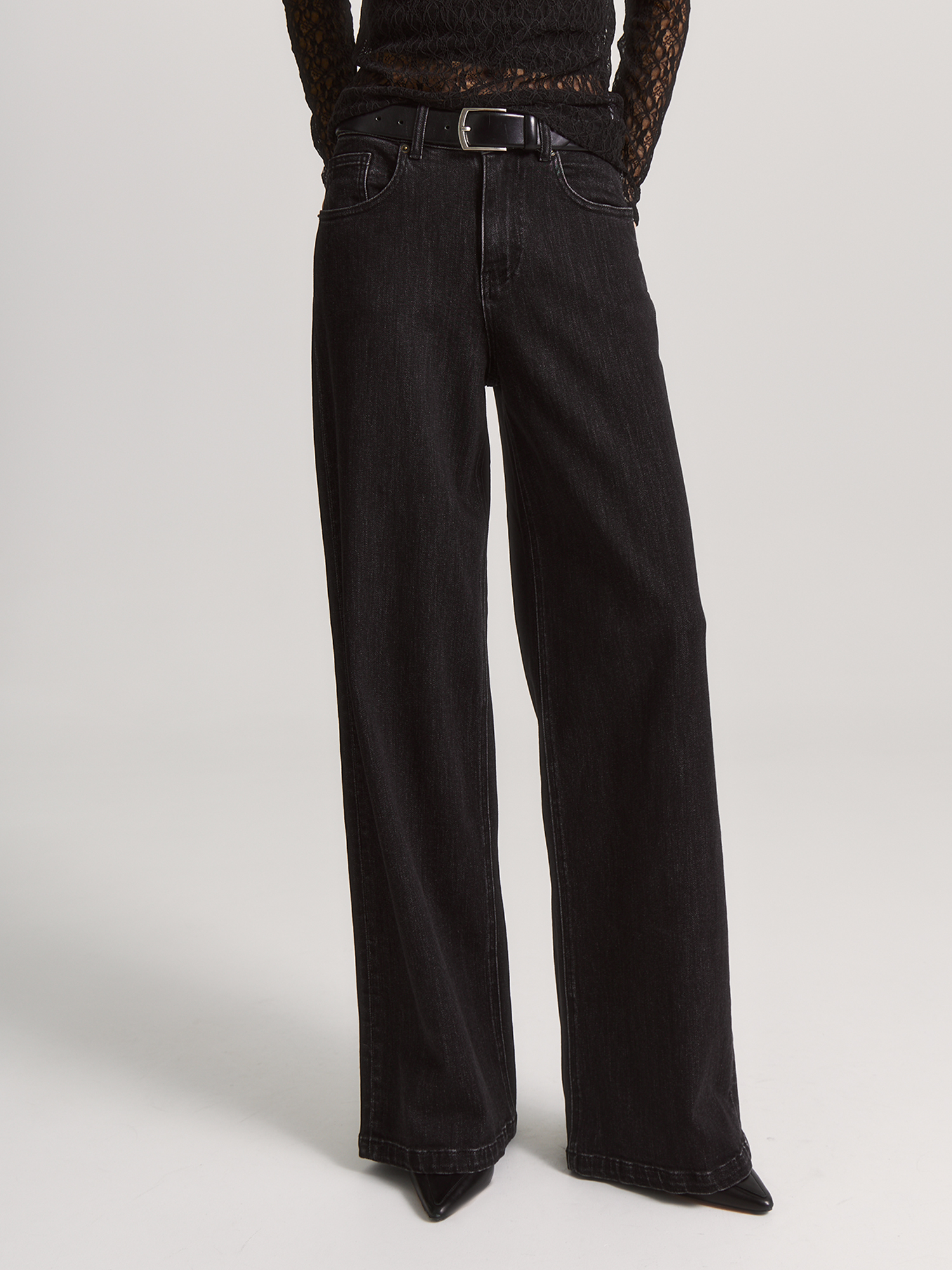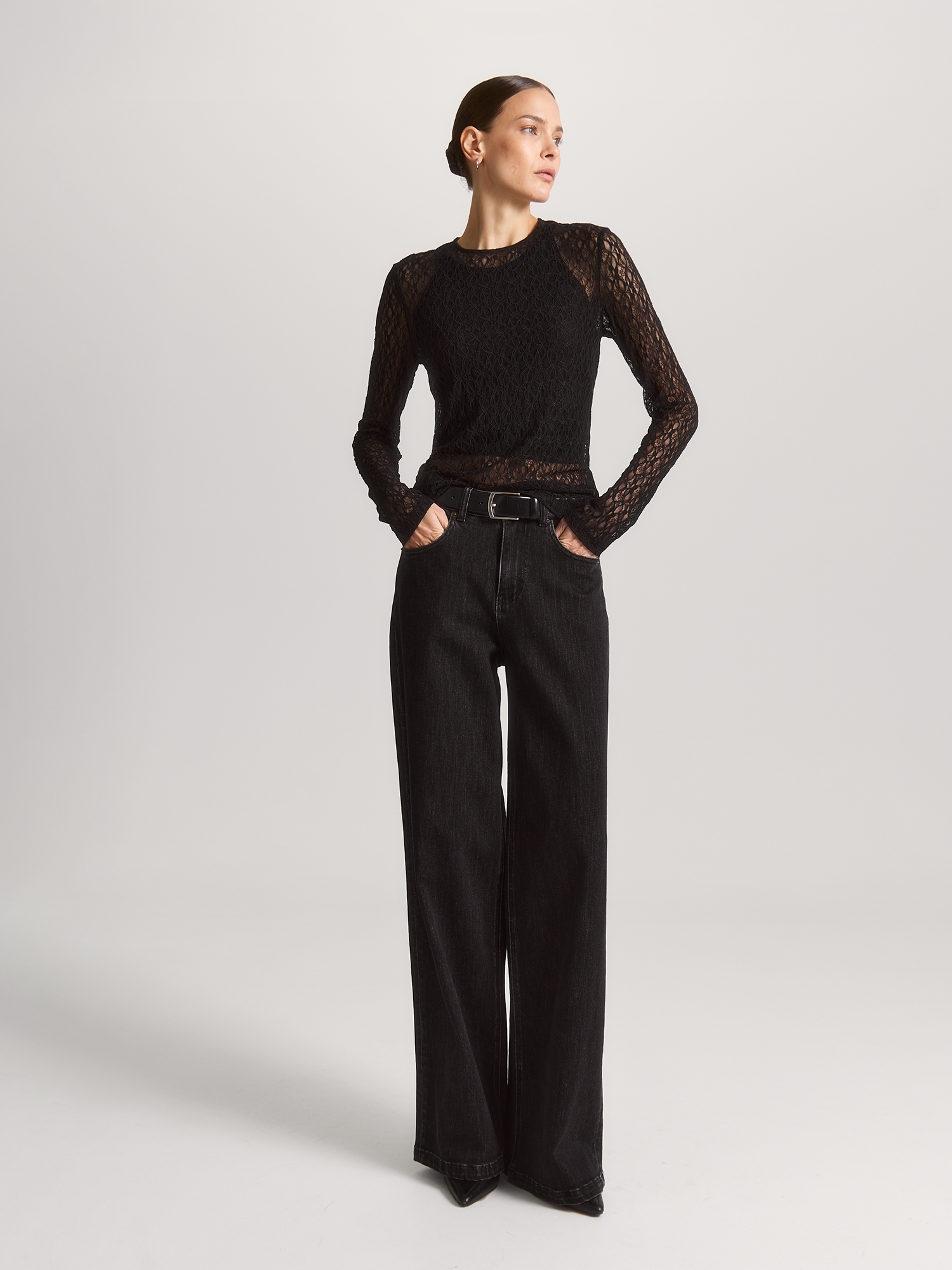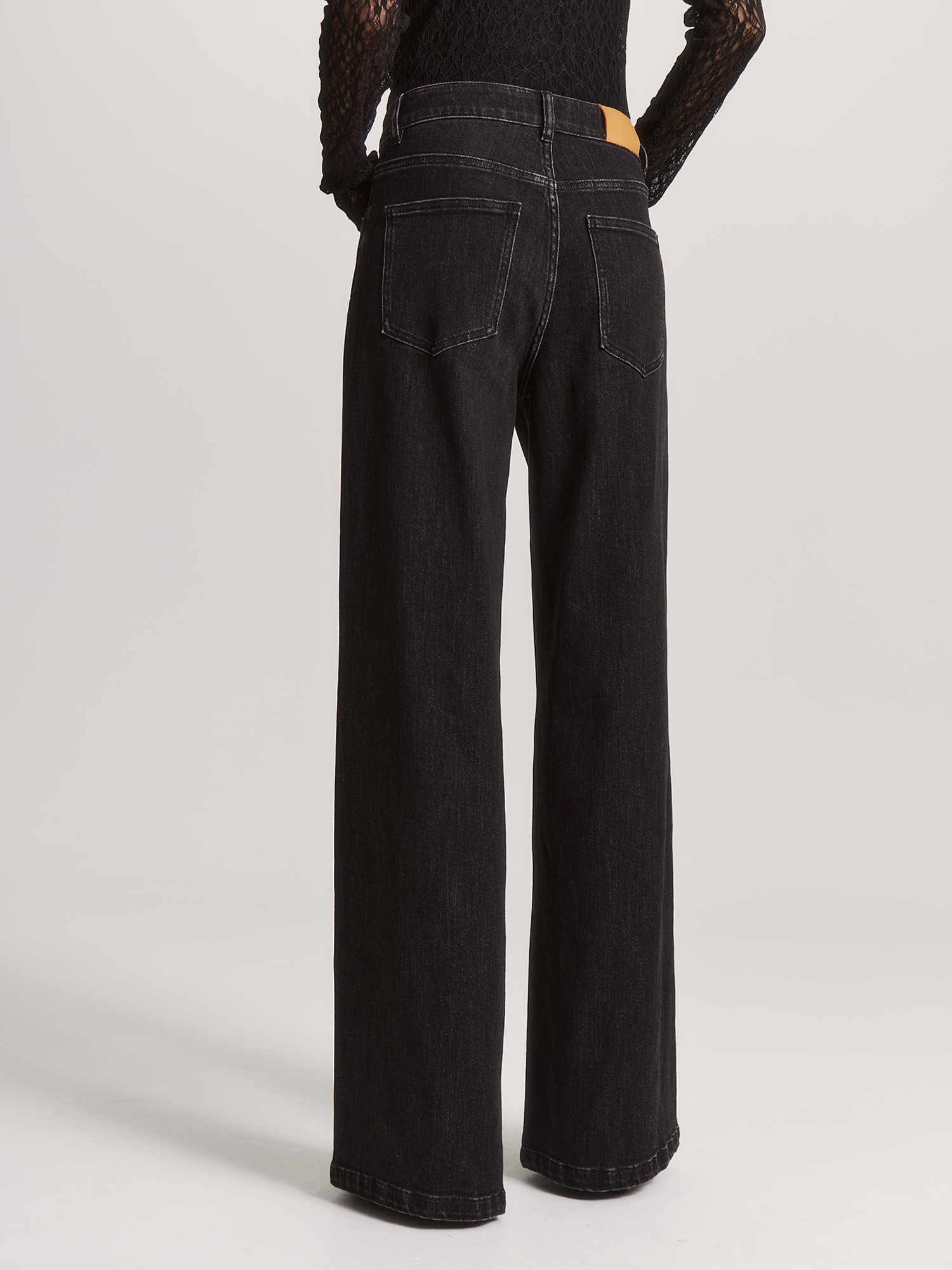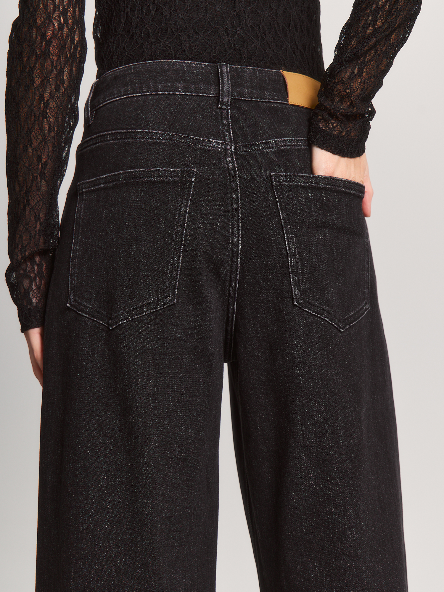 Прямые широкие джинсы - обязательный элемент в гардеробе. Высокая удобная посадка, застежка на молнию и болт, пять традиционных карманов и V-кокетка - идеальная модель для повседневной носки.