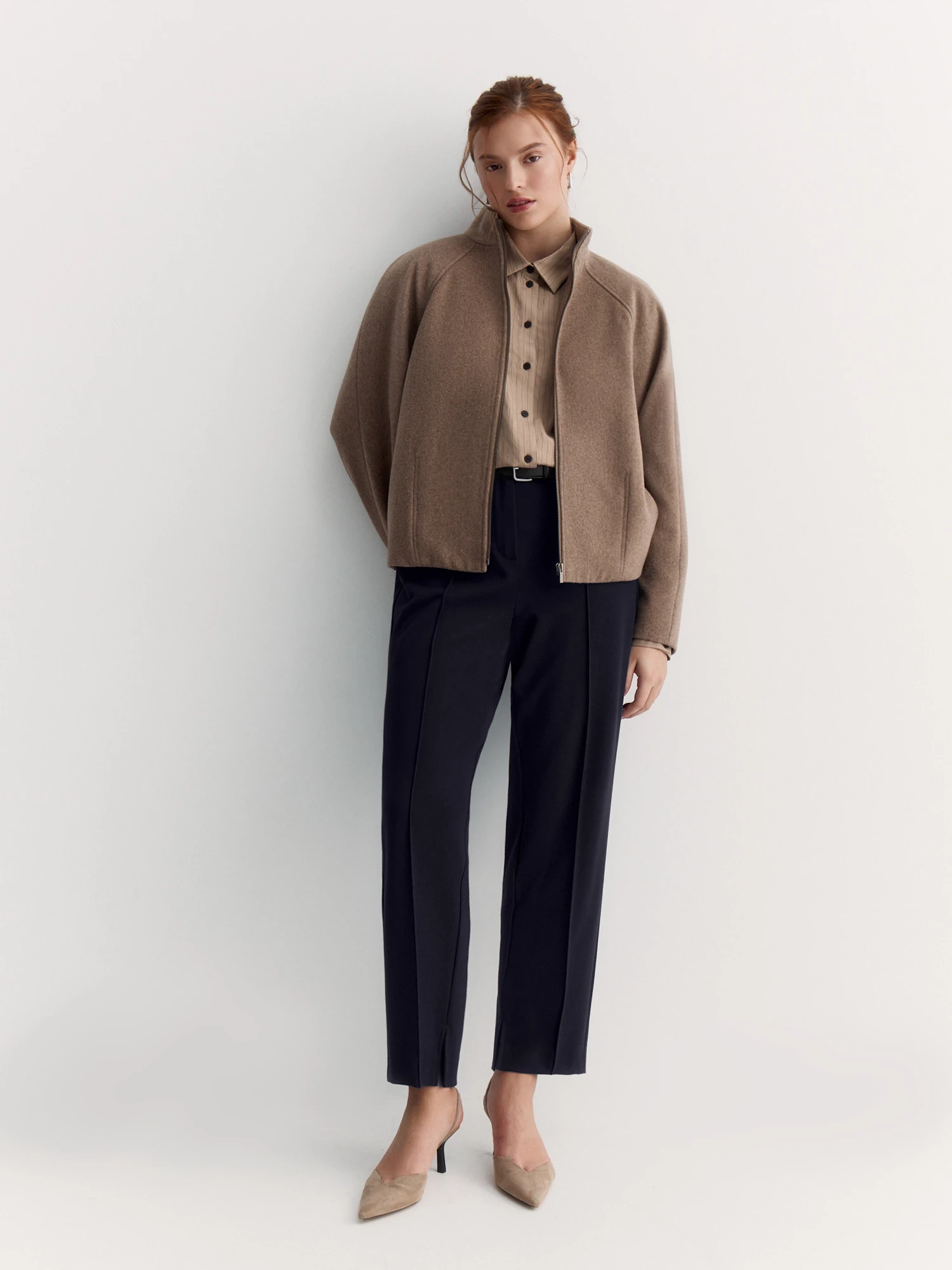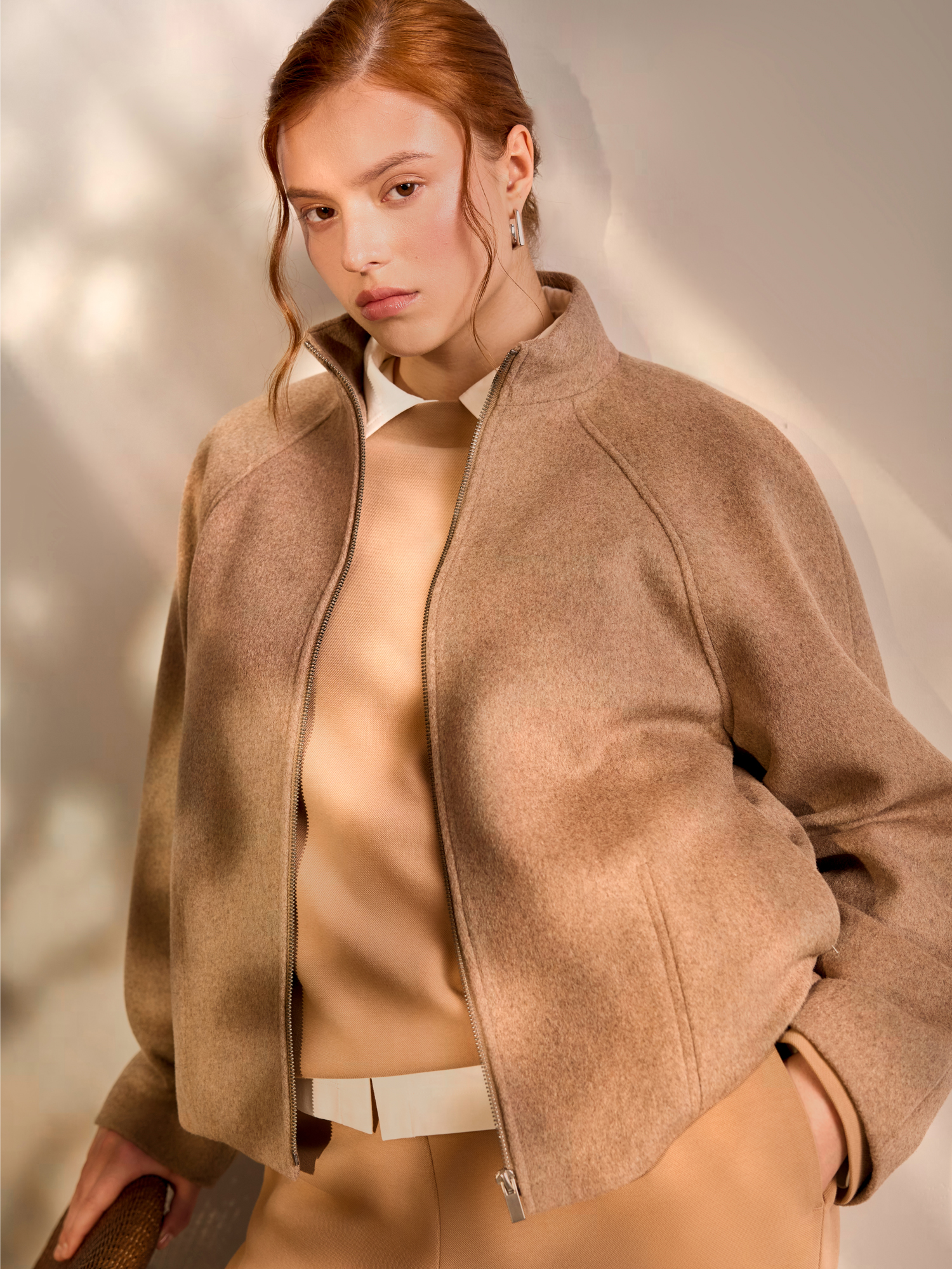 Короткое пальто или куртка из пальтовой ткани – стильная, удобная и тёплая. Сшита из смесовой ткани на основе шерсти и вискозы кофейного оттенка, которая хорошо держит форму и приятна к телу.
