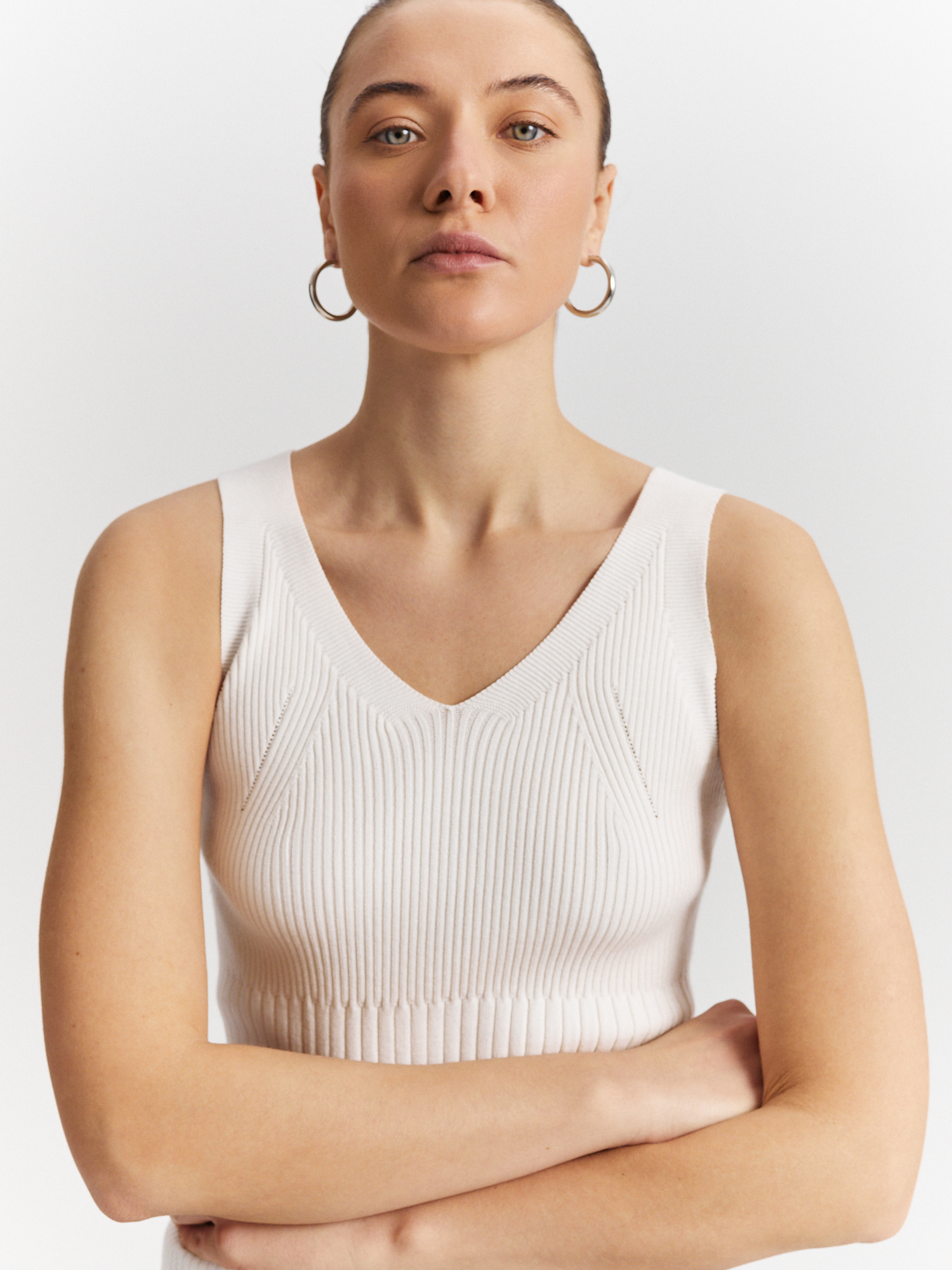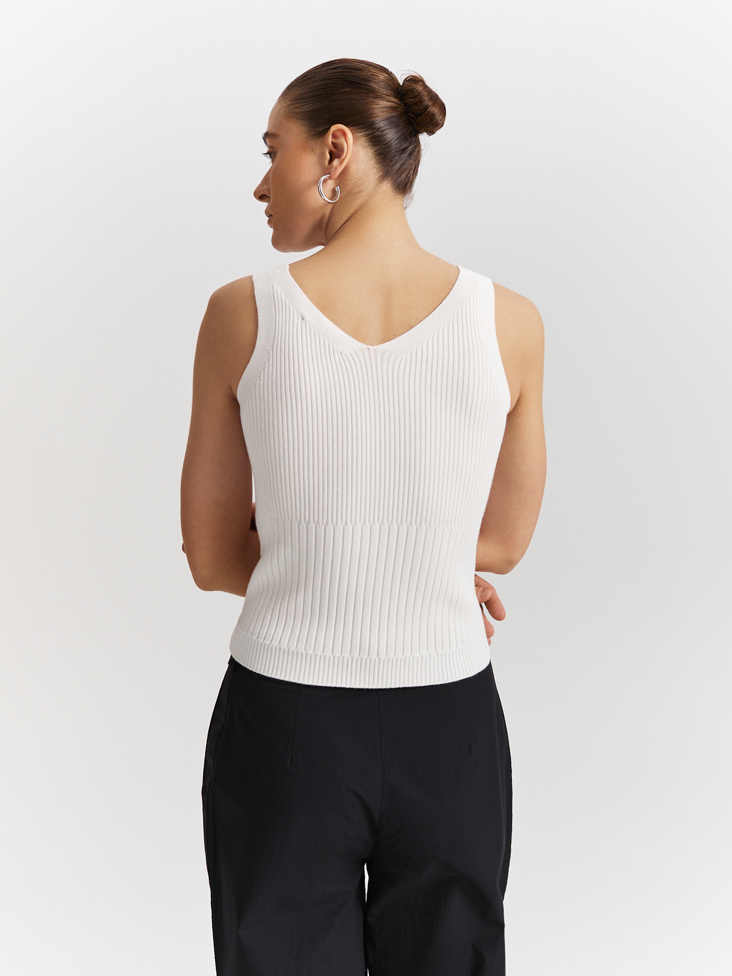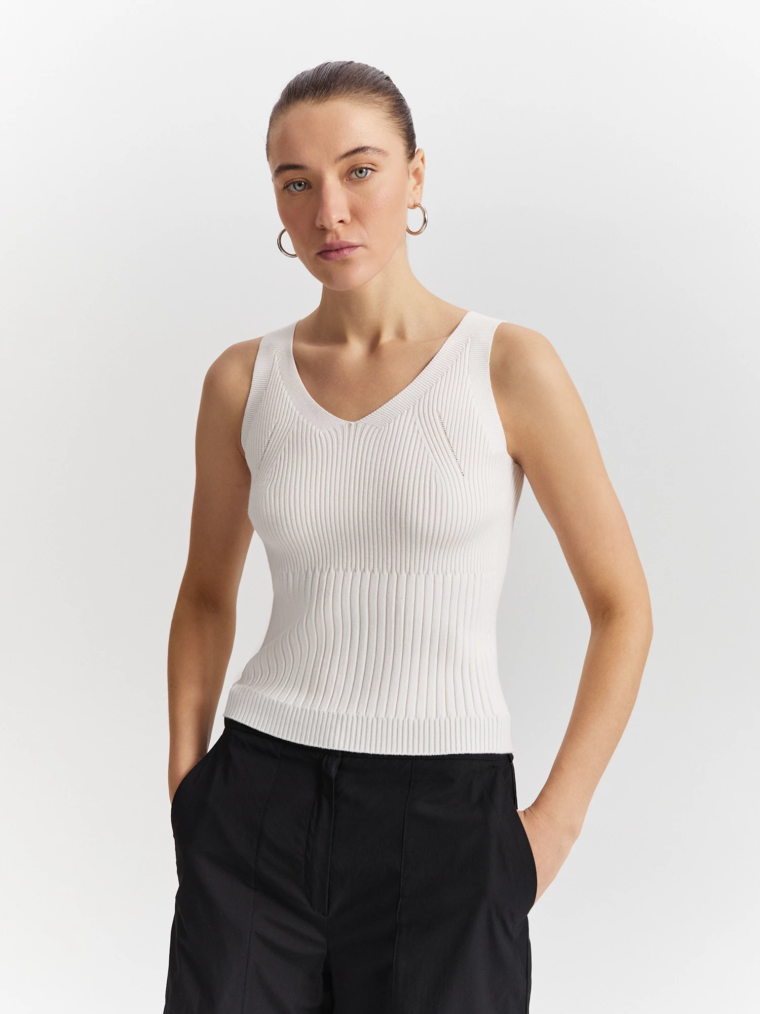 Вывязанный рибаной топ выполнен из премиальной пряжи на основе нежной и легкой вискозы. Модель приталенного силуэта с комфортным поясом на резинке дополнена изящным V-образным вырезом горловины и широкими бретелями. В сочетании с брюками-палаццо или юбкой того же оттенка составит стильный и удобный образ на каждый день.