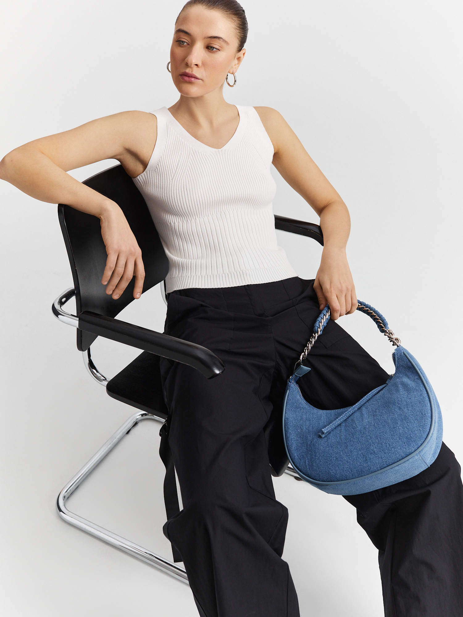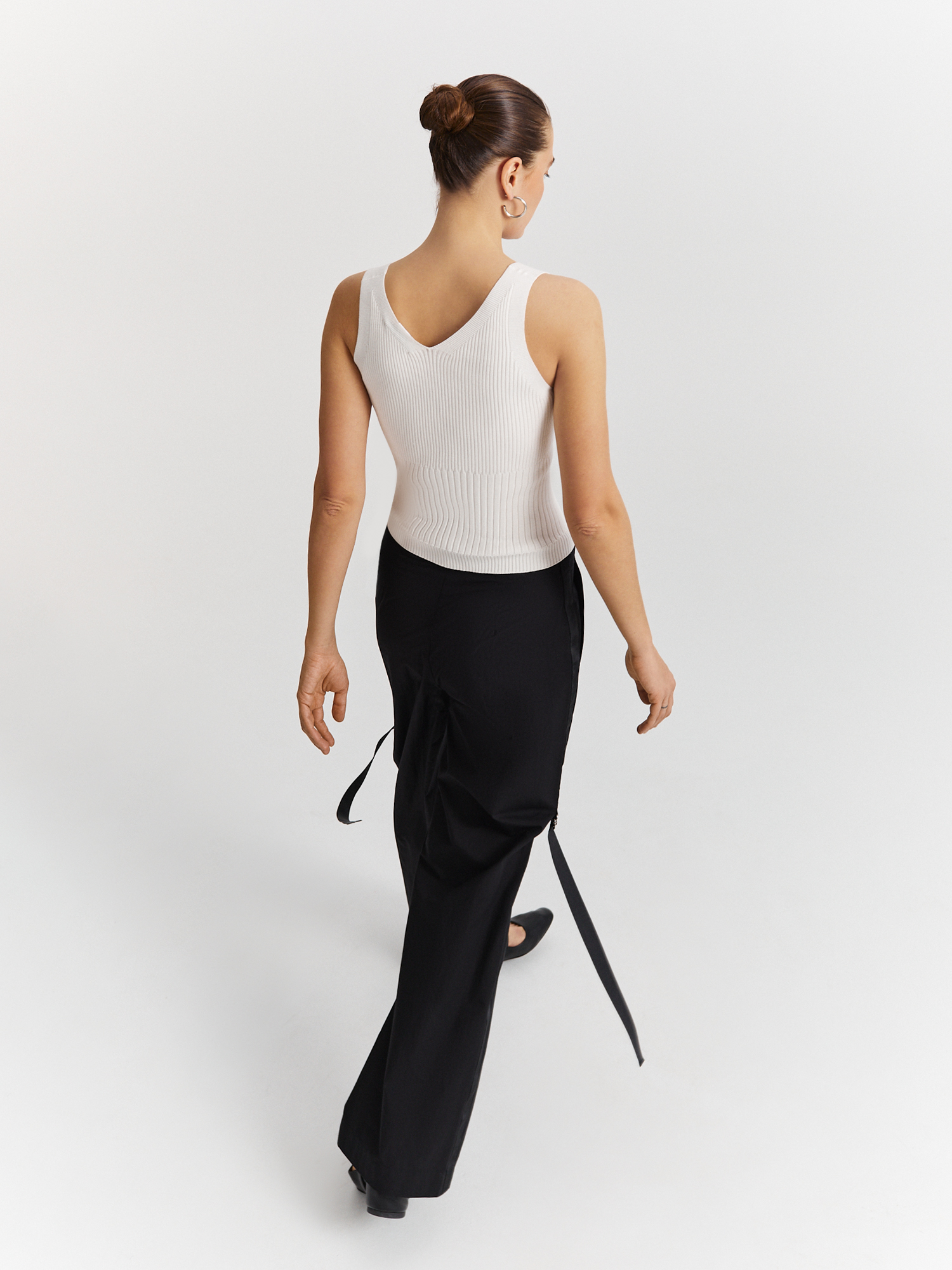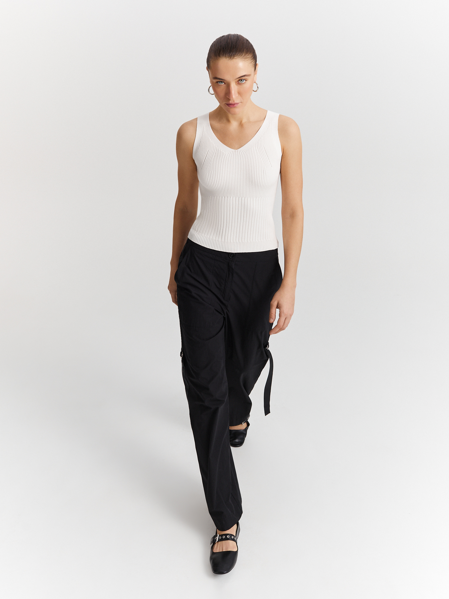 Вывязанный рибаной топ выполнен из премиальной пряжи на основе нежной и легкой вискозы. Модель приталенного силуэта с комфортным поясом на резинке дополнена изящным V-образным вырезом горловины и широкими бретелями. В сочетании с брюками-палаццо или юбкой того же оттенка составит стильный и удобный образ на каждый день.