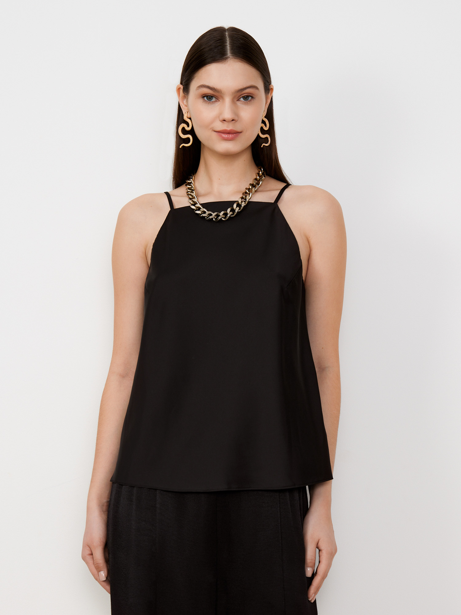 Топ из эффектной атласной ткани универсального чёрного цвета. Модель минималистичного кроя, полуприлегающего силуэта, с прямым вырезом переда и спинки. Такой силуэт в сочетании с цветом выгодно подчеркивает линию плеч. Стильная базовая вещь, которая сочетается как с деловым так и неформальным гардеробом. Идеальна в комплекте с широкими черными брюками из той же капсулы.