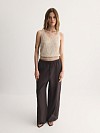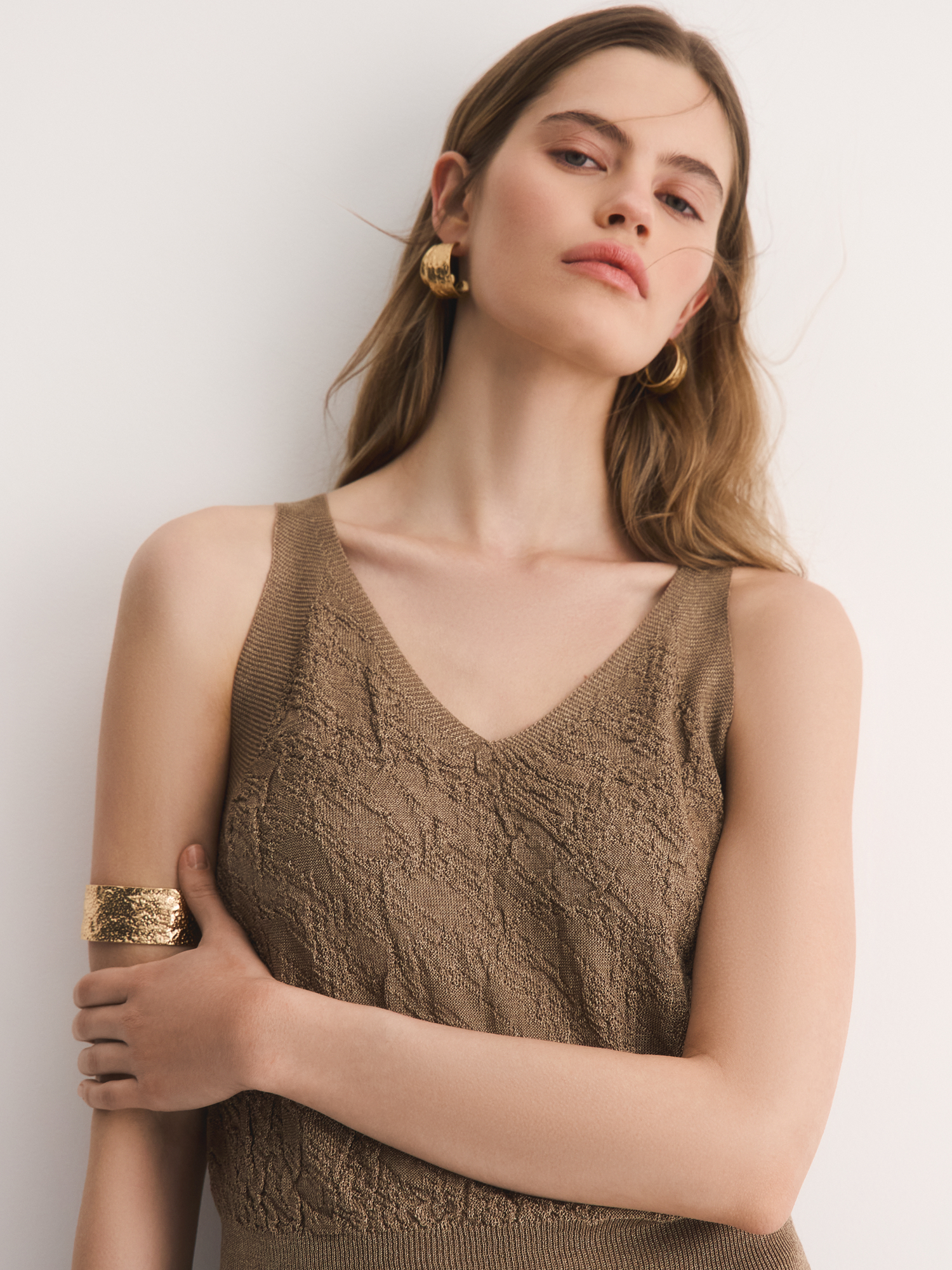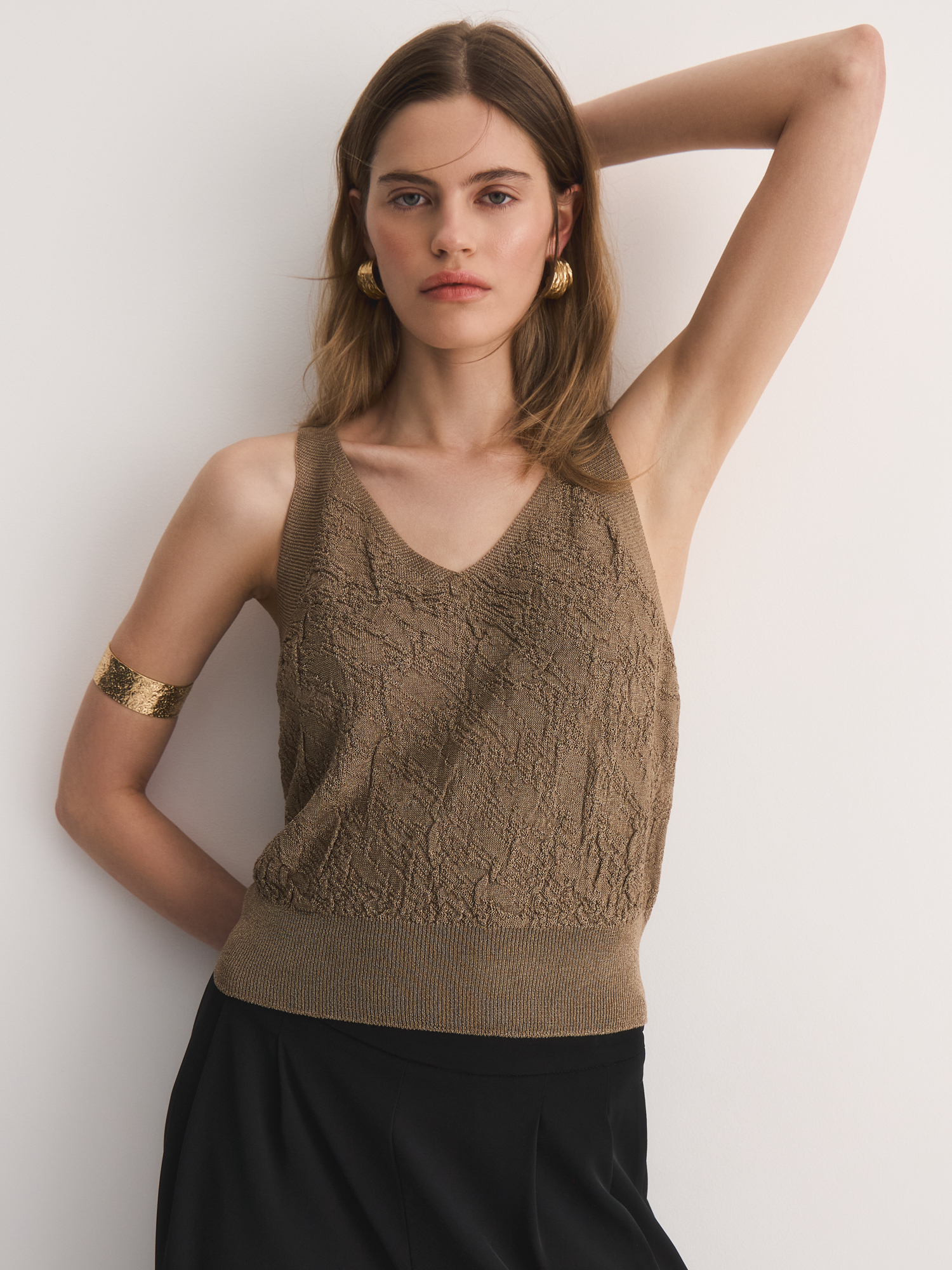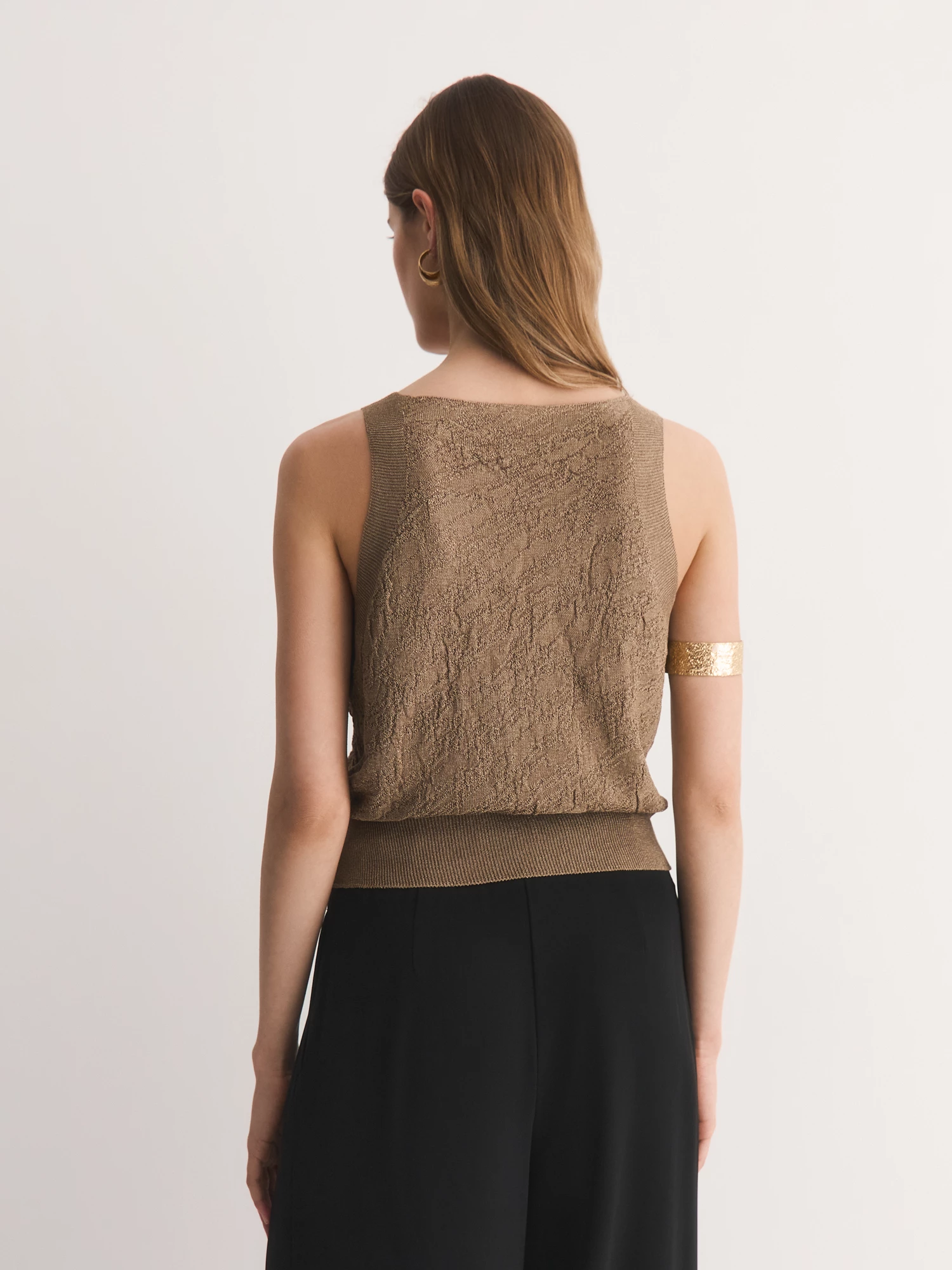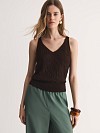 V-образный вырез удлиняет шею, добавляя образу изящества, а широкие бретели обеспечивают комфортную посадку. Сложное жаккардовое переплетение создаёт эффектную 3D-текстуру, делая топ визуально объёмным и интересным. Эффектный бронзово-коричневый оттенок легко сочетается с юбками, брюками и джинсами коллекции.