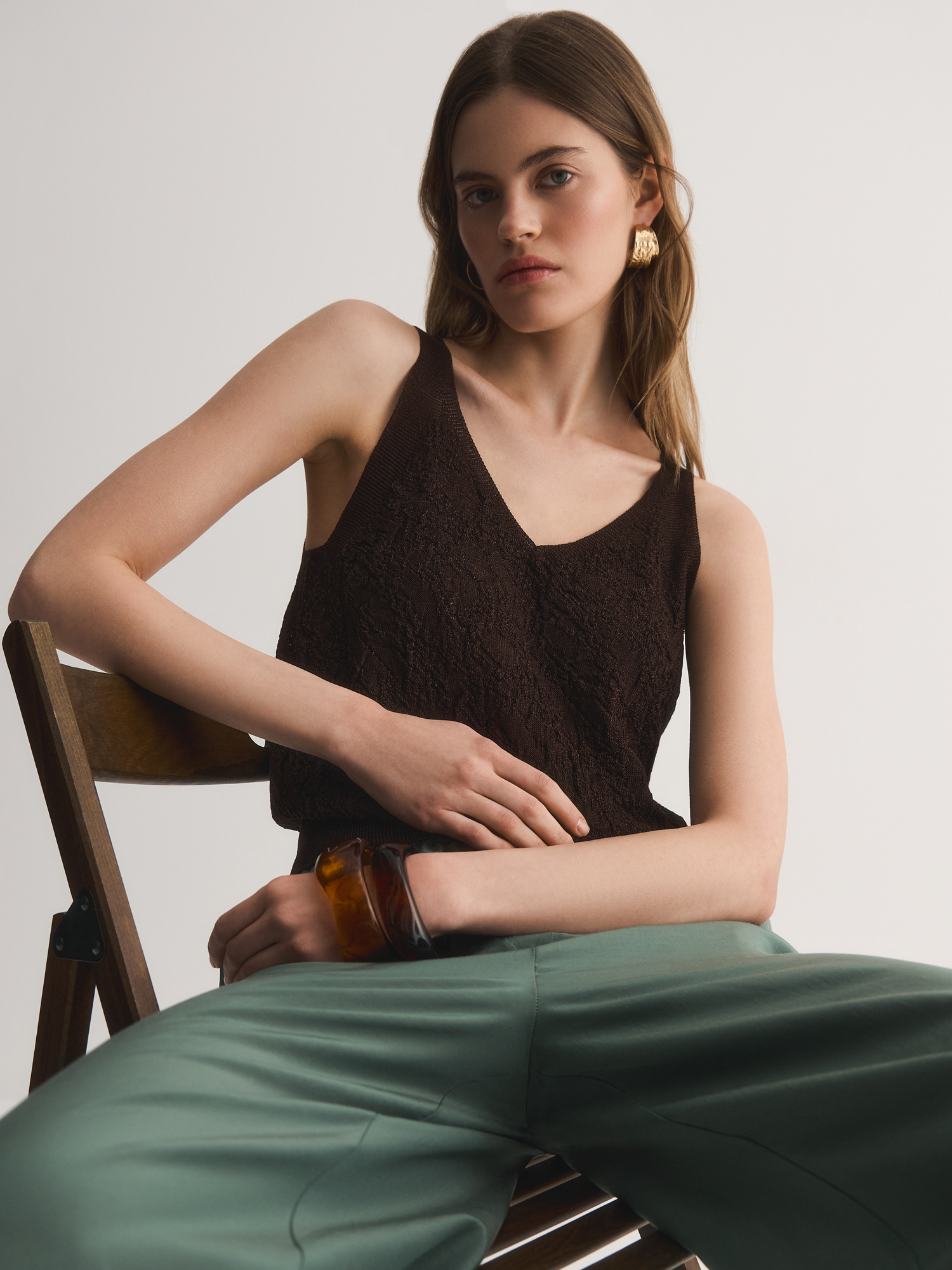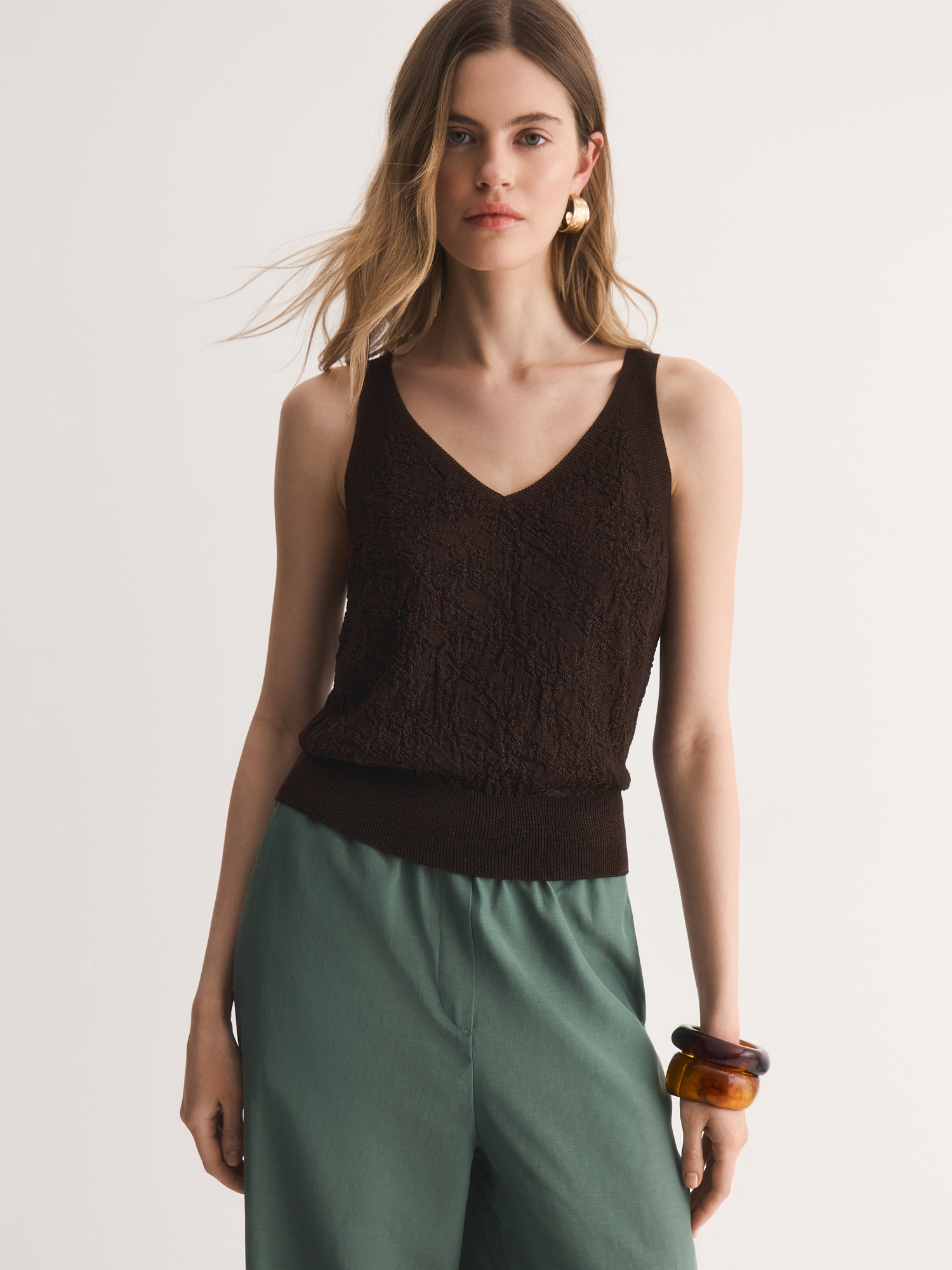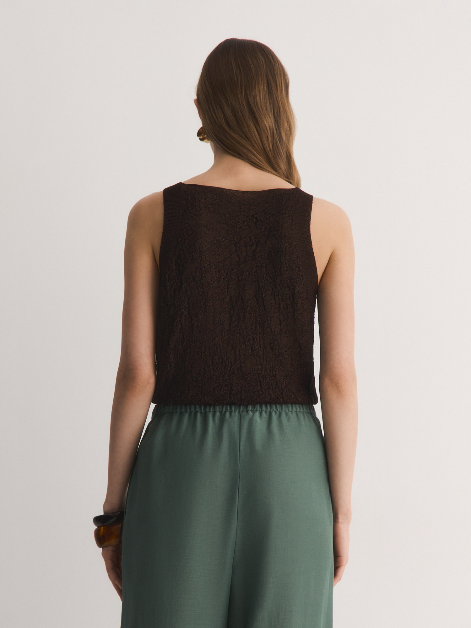 V-образный вырез удлиняет шею, добавляя образу изящества, а широкие бретели обеспечивают комфортную посадку. Сложное жаккардовое переплетение создаёт эффектную 3D-текстуру, делая топ визуально объёмным и интересным. Благородный коричневый оттенок легко сочетается с юбками, брюками и джинсами коллекции.