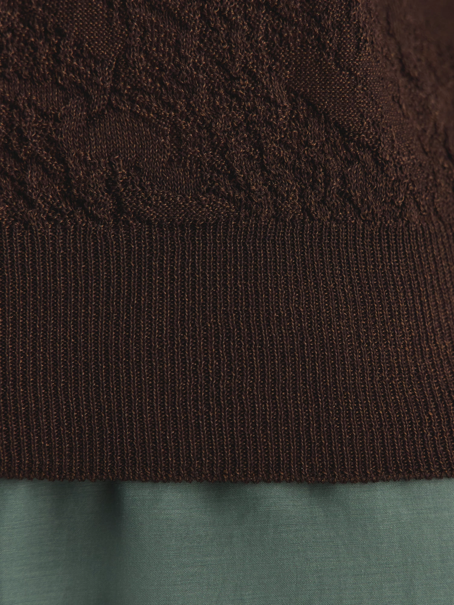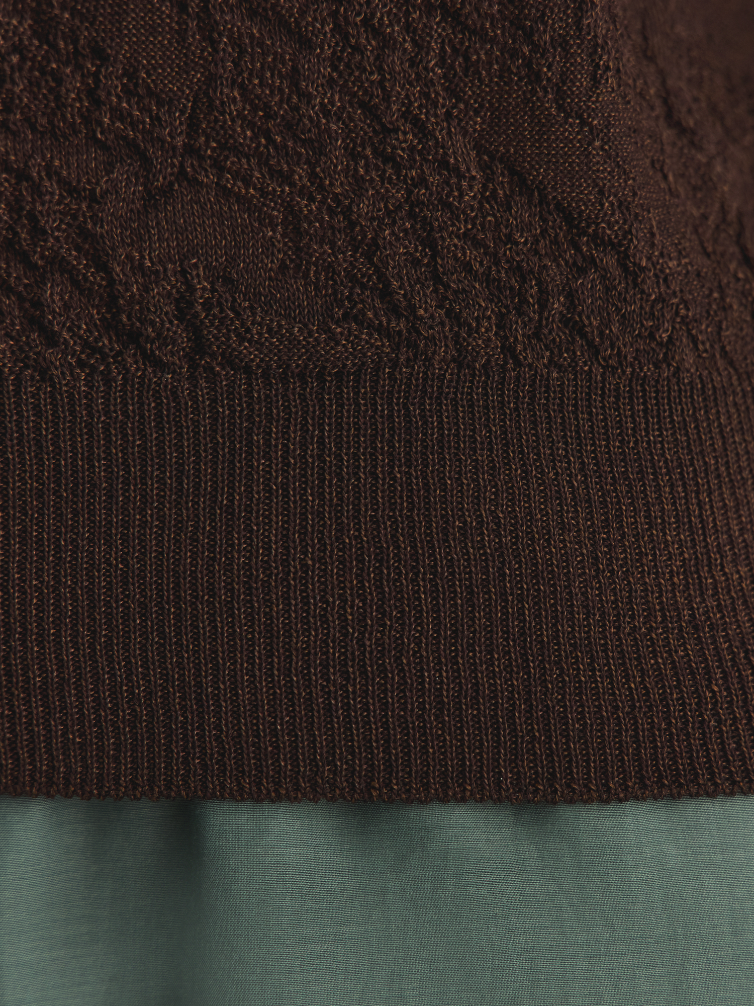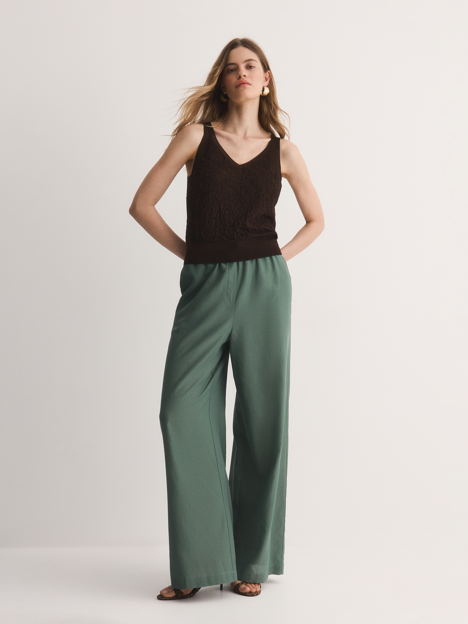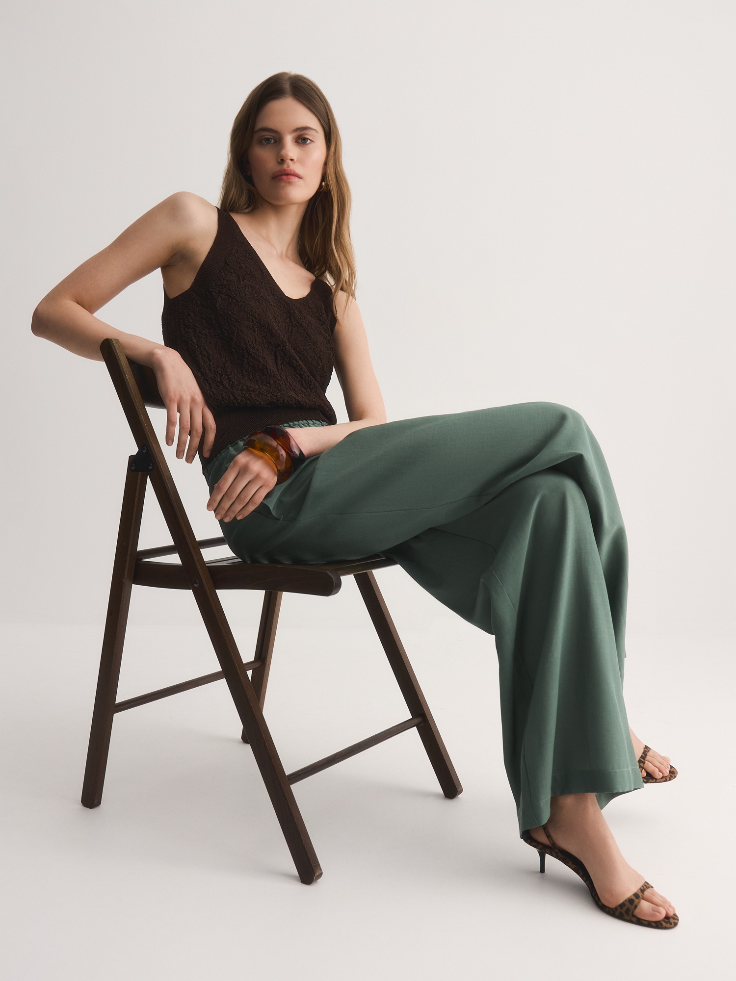 V-образный вырез удлиняет шею, добавляя образу изящества, а широкие бретели обеспечивают комфортную посадку. Сложное жаккардовое переплетение создаёт эффектную 3D-текстуру, делая топ визуально объёмным и интересным. Благородный коричневый оттенок легко сочетается с юбками, брюками и джинсами коллекции.