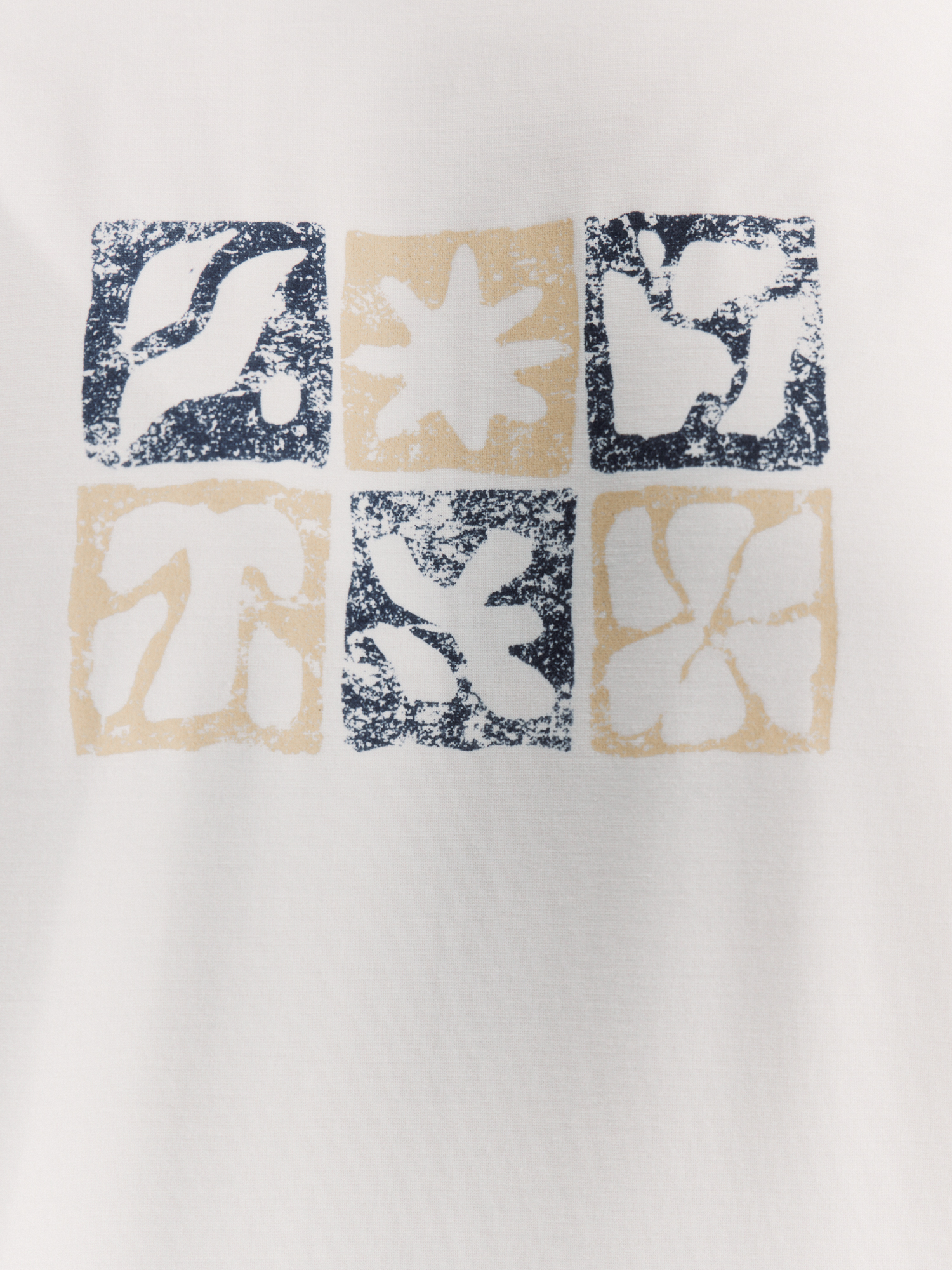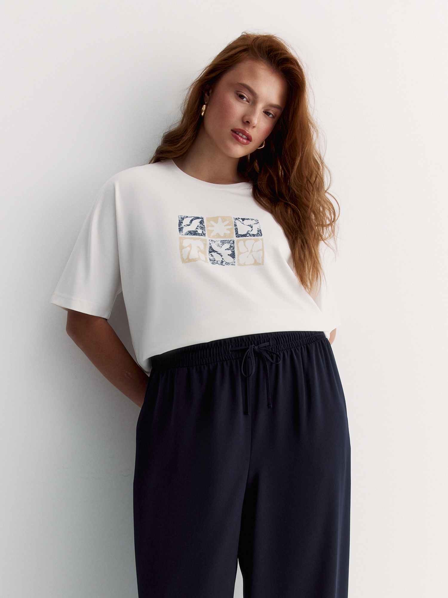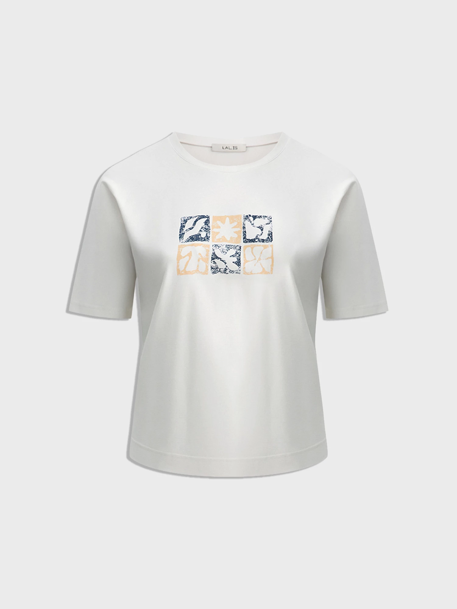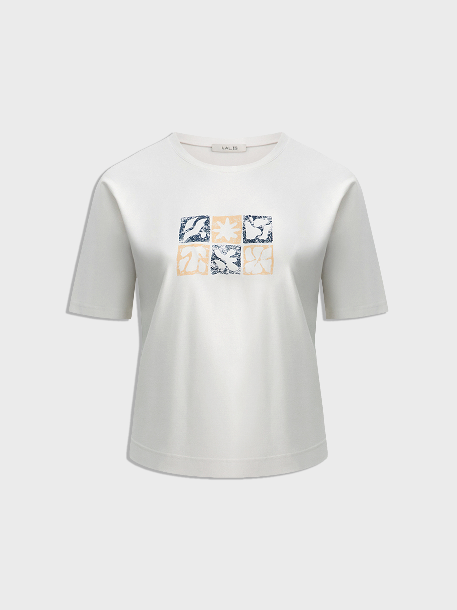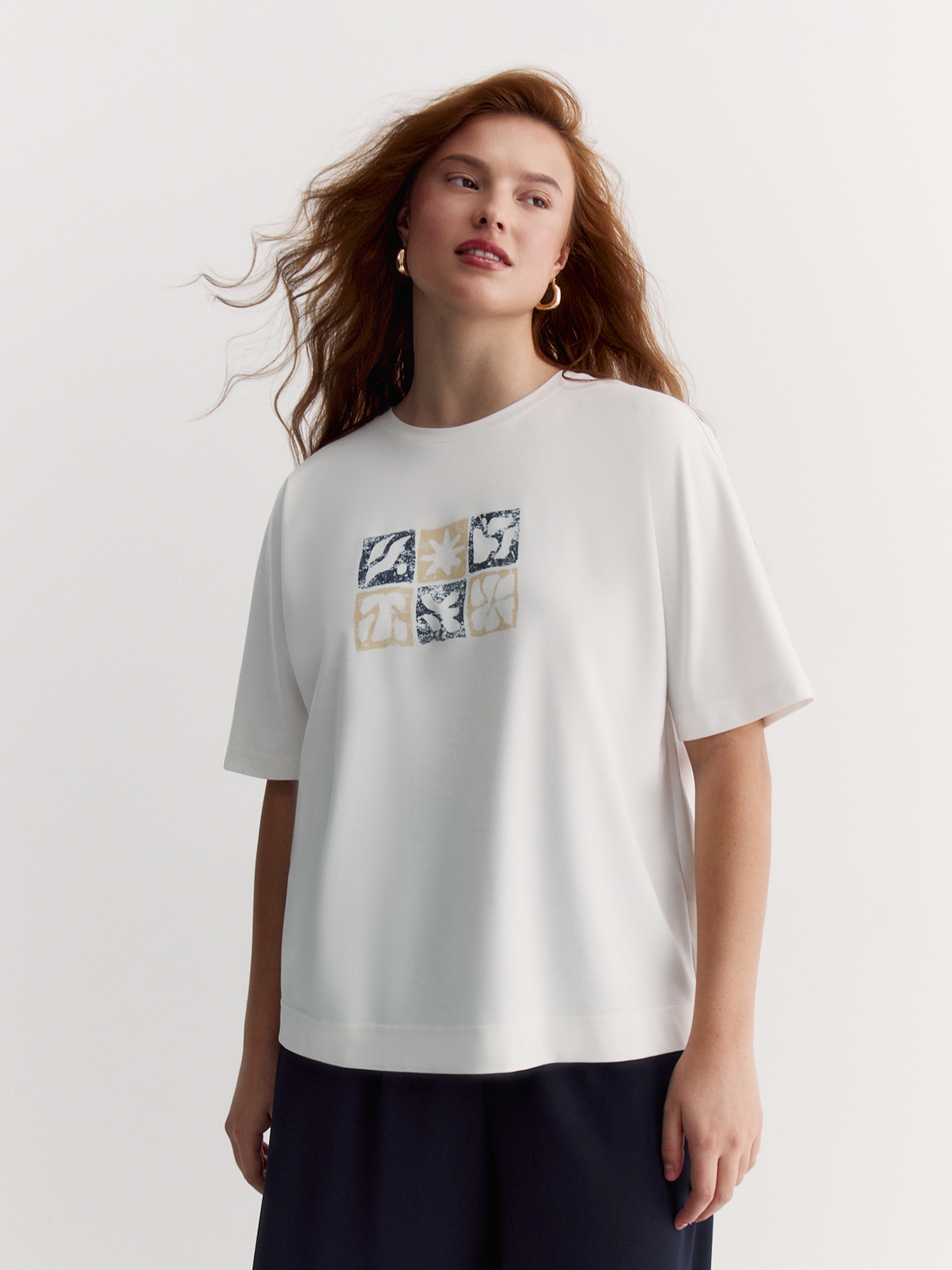 Круглый вырез, отделанный основной тканью, выглядит аккуратно, а прямой крой с цельнокроеным рукавом обеспечивает свободу движений. Яркий курортный рисунок на белом фоне добавляет образу летнего настроения.