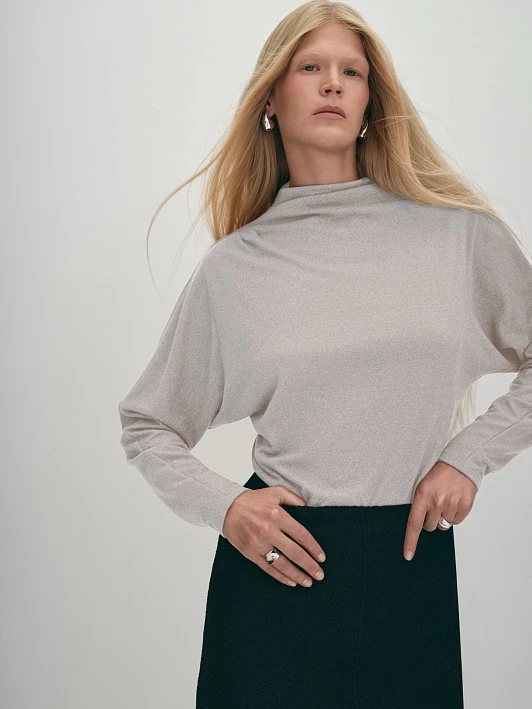 Блузка или лонгслив с цельнокроеной стойкой и удобной застежкой сзади на потайную молнию. Блуза асимметричная, заложены две складки у правого плеча – это привлекает внимание. Кроме того, предусмотрена драпировка по боковым швам в области талии, это стилистически сочетается со складками у плеча и делает блузу завершенной. Интересна конструкция рукава – по переду он втачной, по спинке цельнокроеный, вместе с увеличенной проймой такая конструкция рукава обеспечивает комфортную посадку. Модель выполнена из кроеного тонкого поливискозного трикотажа. Вискоза в составе такого трикотажа способствует тактильному комфорту, а полиэстер продлевает срок службы. Для сохранения формы изделия, в составе ткани необходимы эластичные волокна, в данном случае добавлен спандекс. Асимметричная блузка в светло-сером цвете полуприлегающего силуэта выгодно сочетается по пропорциям с прямыми юбками миди и комфортными длинными трикотажными брюками, и будет востребована как повседневная, офисная, деловая, вечерняя, а также дополнит образ в стиле спорт-шик.