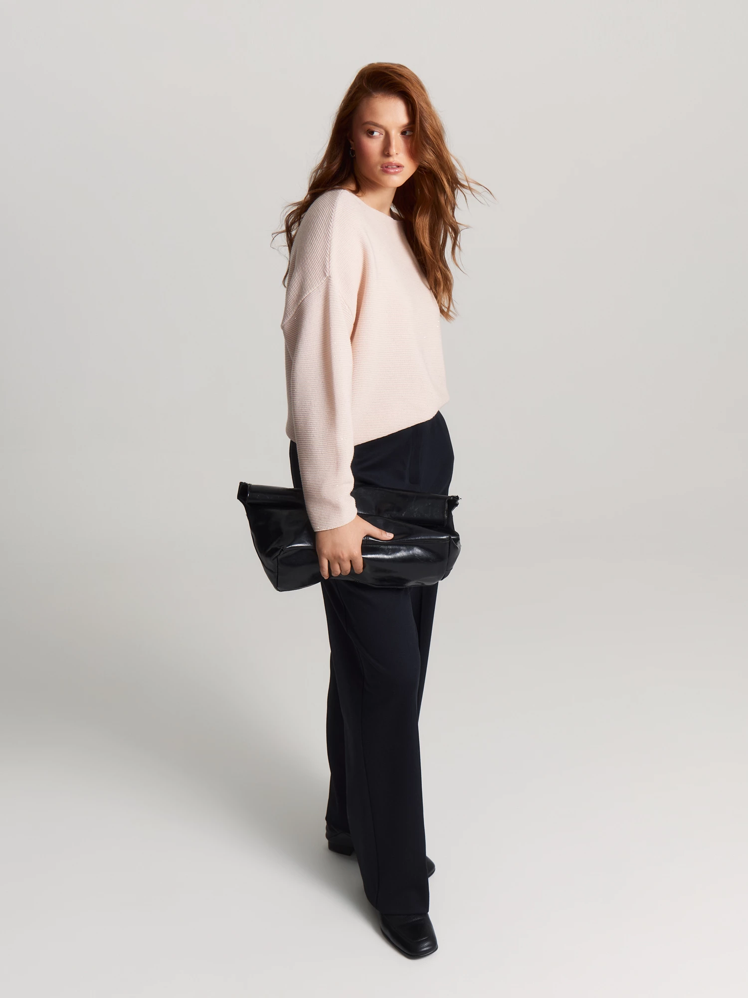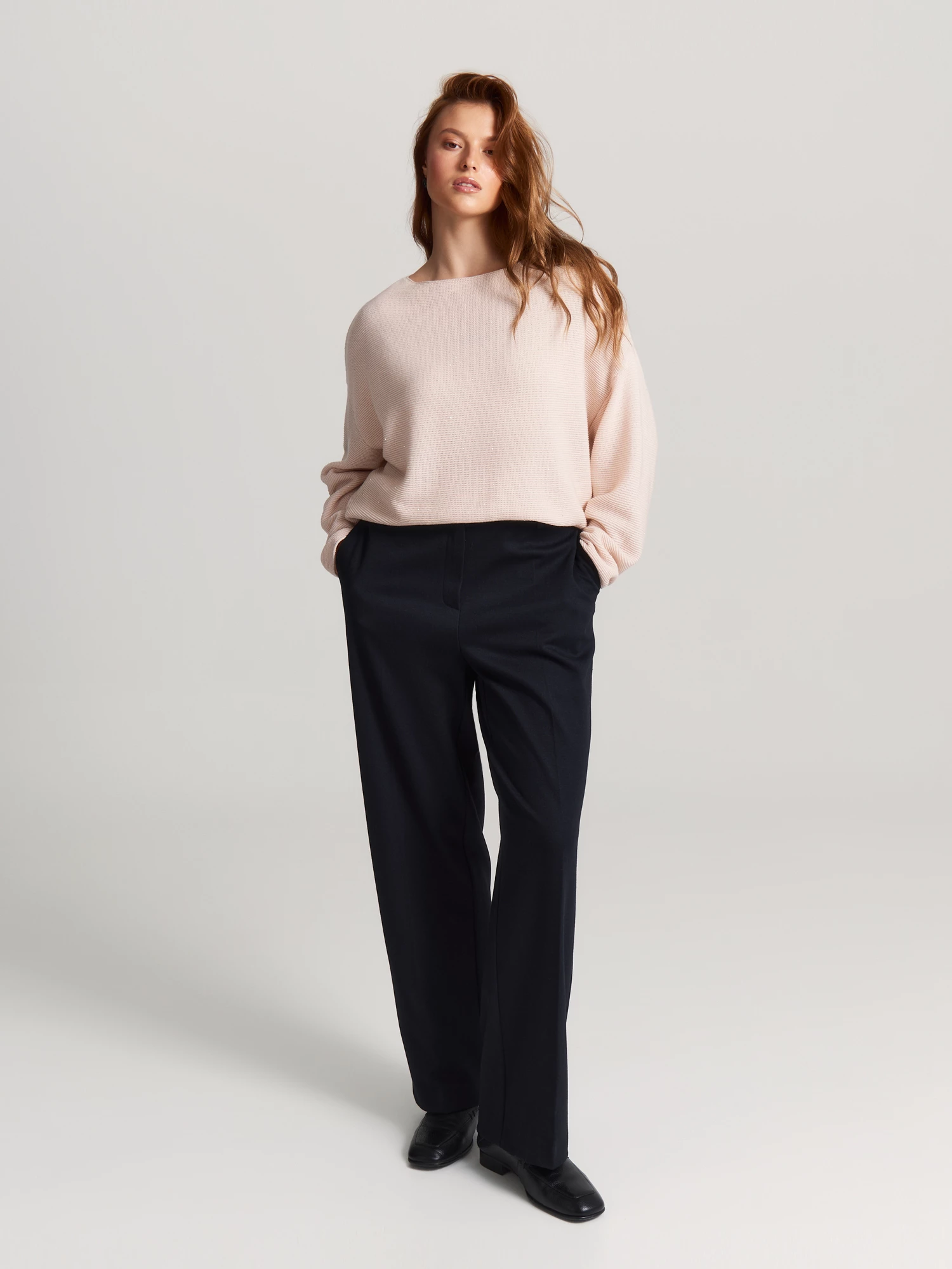 Тёмно-синий navy с мраморным меланжем универсален: сочетайте брюки с блузами, рубашками или джемперами коллекции.