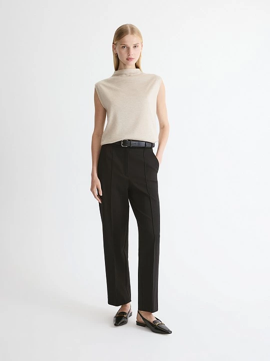 Черные укороченные брюки прямого кроя - отличная база для осенне-зимнего гардероба. Трикотаж с эффектом текстиля дарует комфорт, а классический крой и застроченные стрелки дисциплинируют модель.