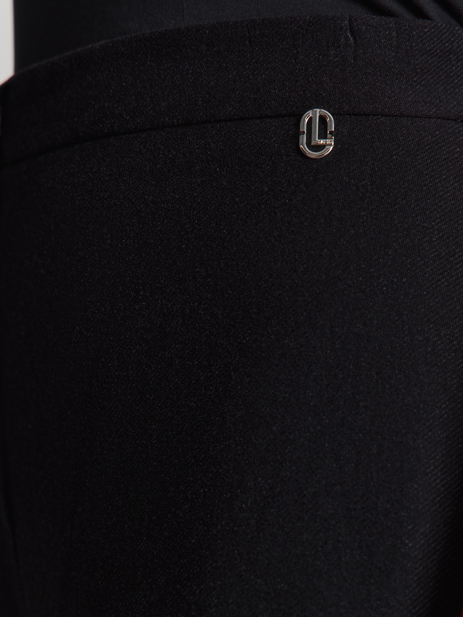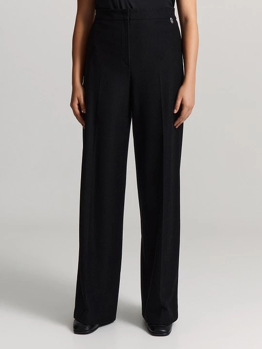 Модель с притачным поясом и застёжкой-гульфиком выглядит строго и элегантно. Заутюженные стрелки дисциплинируют брюки и стройнят силуэт. Металлическое украшение - как визуальная подпись дизайнеров бренда.
