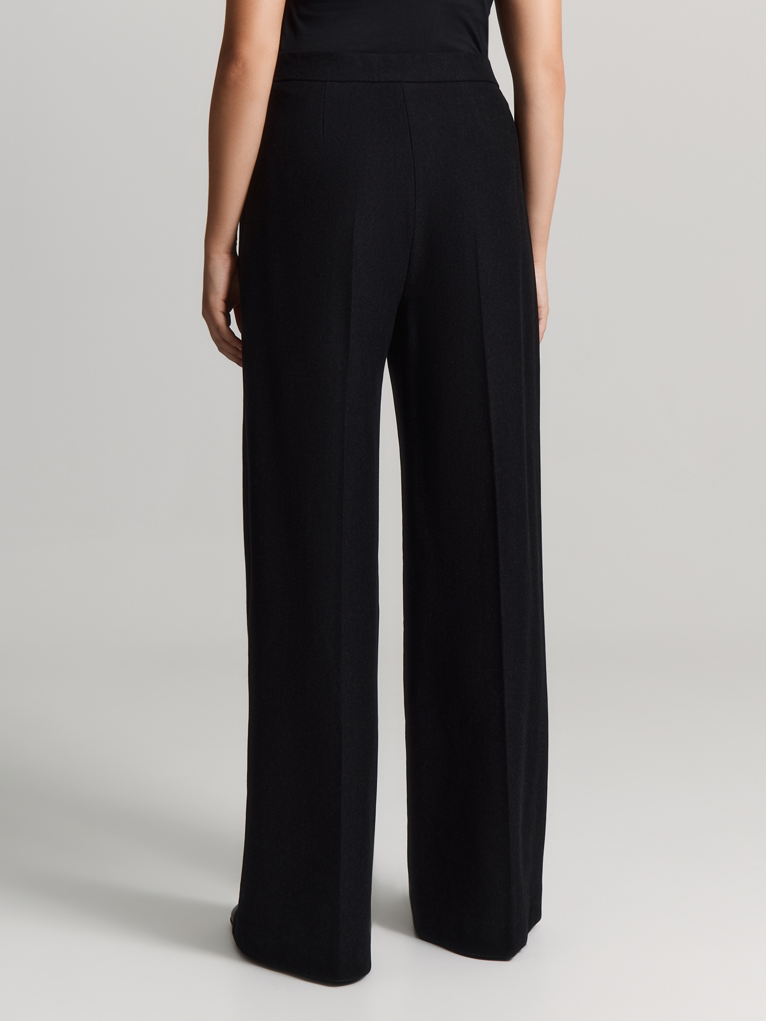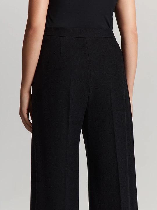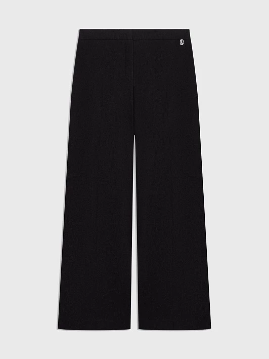 Брюки прямого кроя сшиты из эластичного трикотажа хорошей плотности с диагональным переплетением нитей. Основное вискозное волокно такой ткани - мягкое, тактильно приятное, с шелковистым блеском и хорошей воздухопроницаемостью.