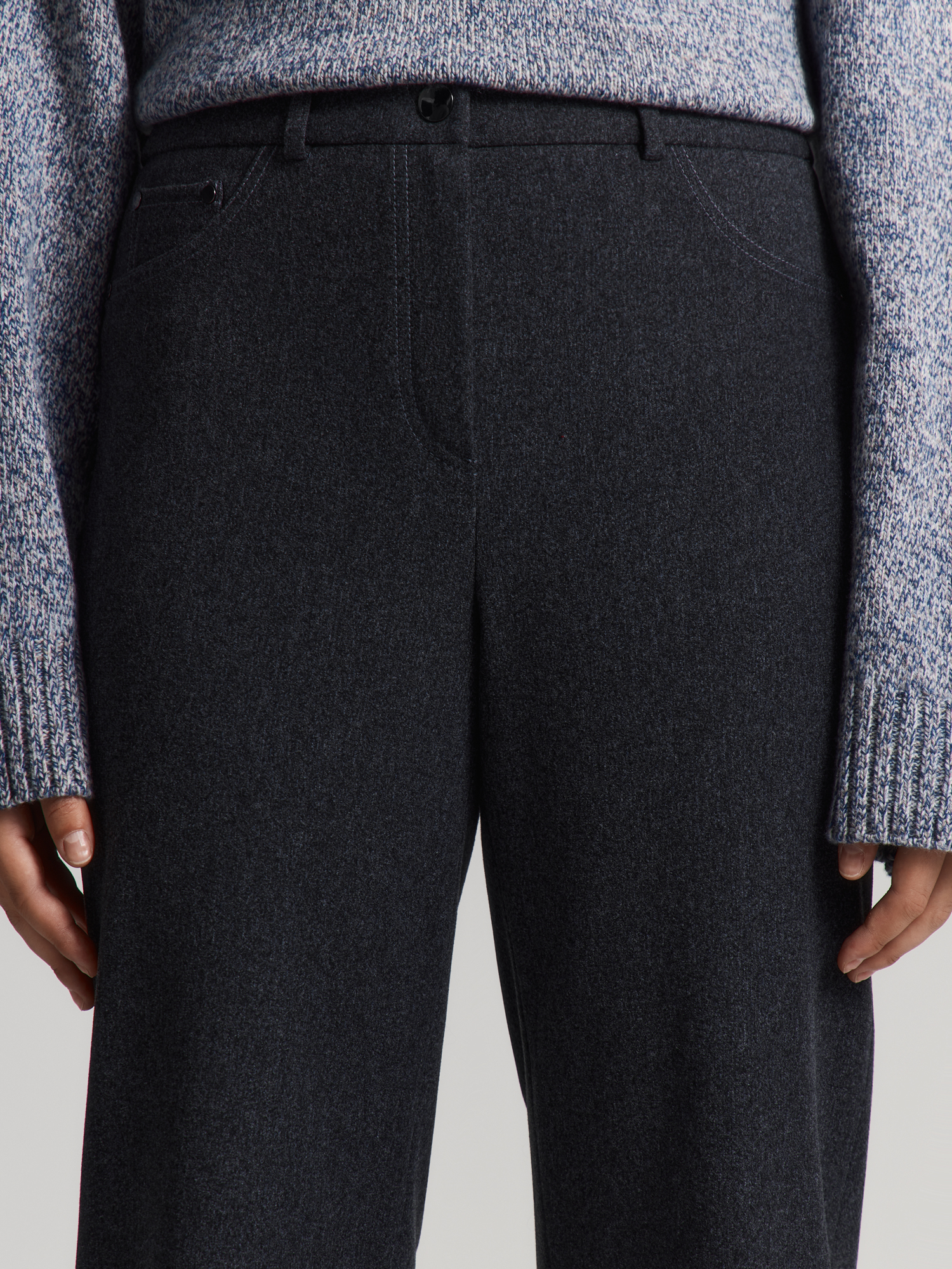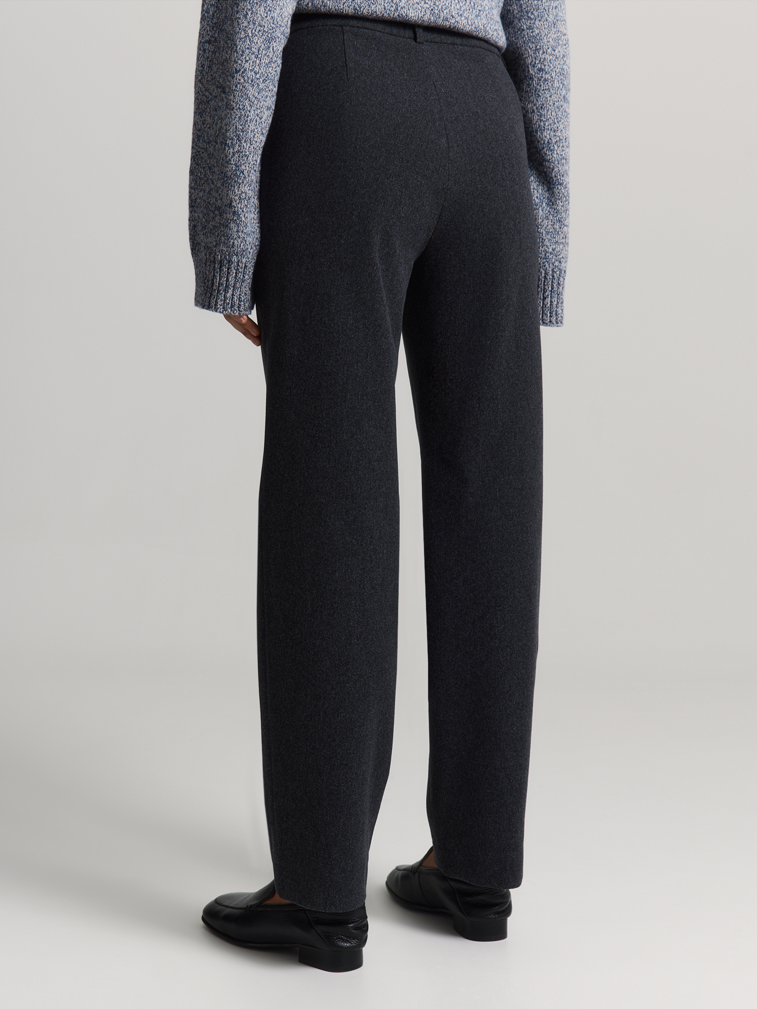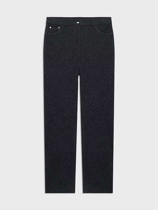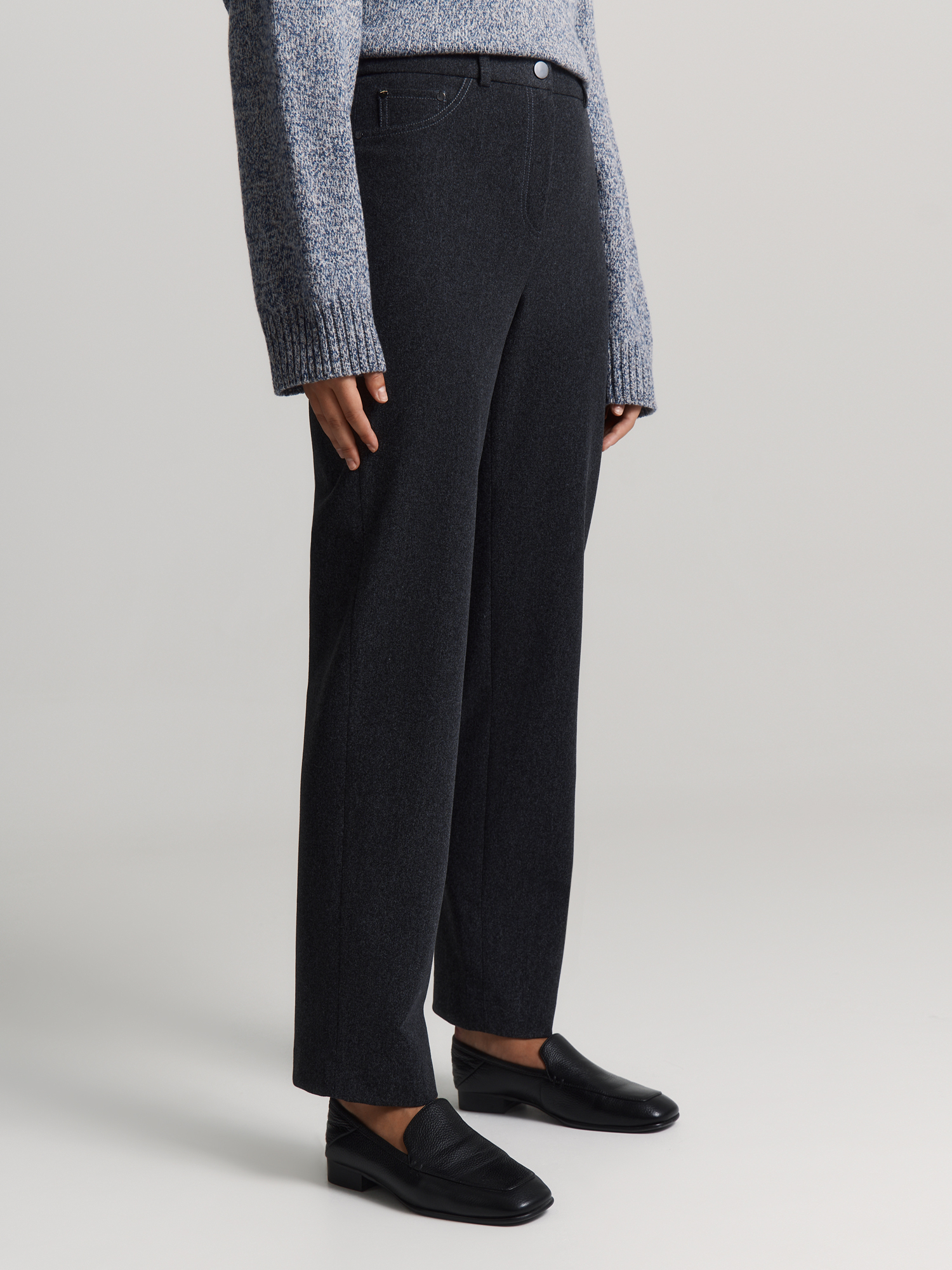 Прямые брюки с легким заужением сшиты из эластичного трикотажа с выразительным меланжевым эффектом. Они хорошо тянутся и комфортно сидят. Модель с притачным поясом, шлевками и застёжкой-гульфиком долговечна и практична.