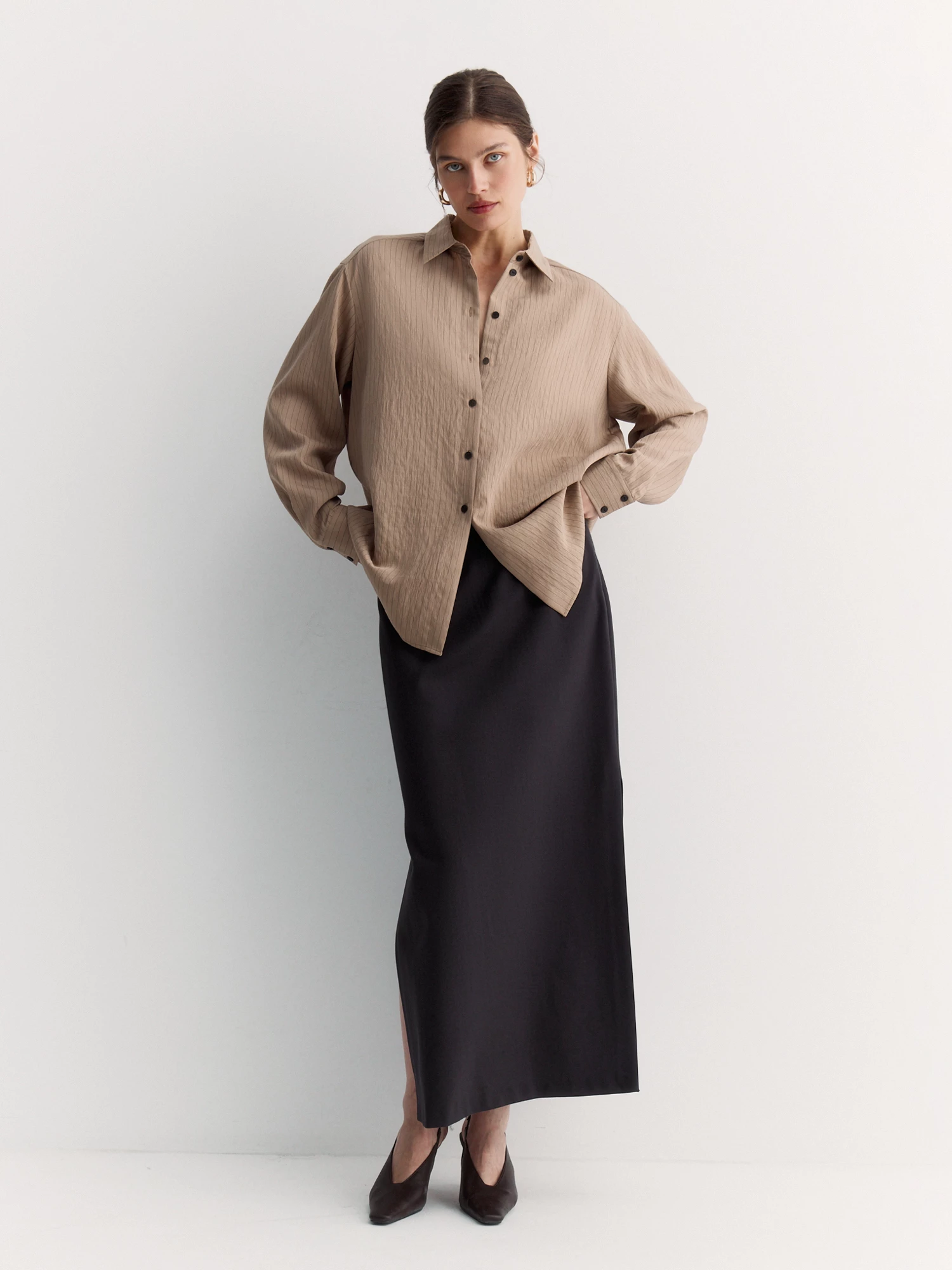Удлиненная блуза рубашечного кроя — идеальный вариант для тех, кто ценит комфорт и стиль. Сшитая из качественной турецкой вискозной ткани с эффектом легкой жатки, она приятна к телу и красиво струится при движении. Рубашечный крой с отложным воротником на стойке придает образу элегантность, а сильно спущенное плечо создает модный oversize-эффект без потери формы.