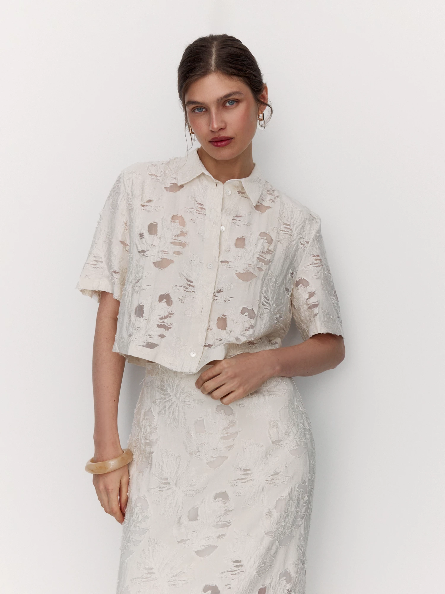 Укороченная блуза с прозрачными фрагментами – идеальный вариант для создания стильного образа. Сшита из вискозной ткани с добавлением нейлона, которая образует художественные просветы, создавая модный рваный эффект.