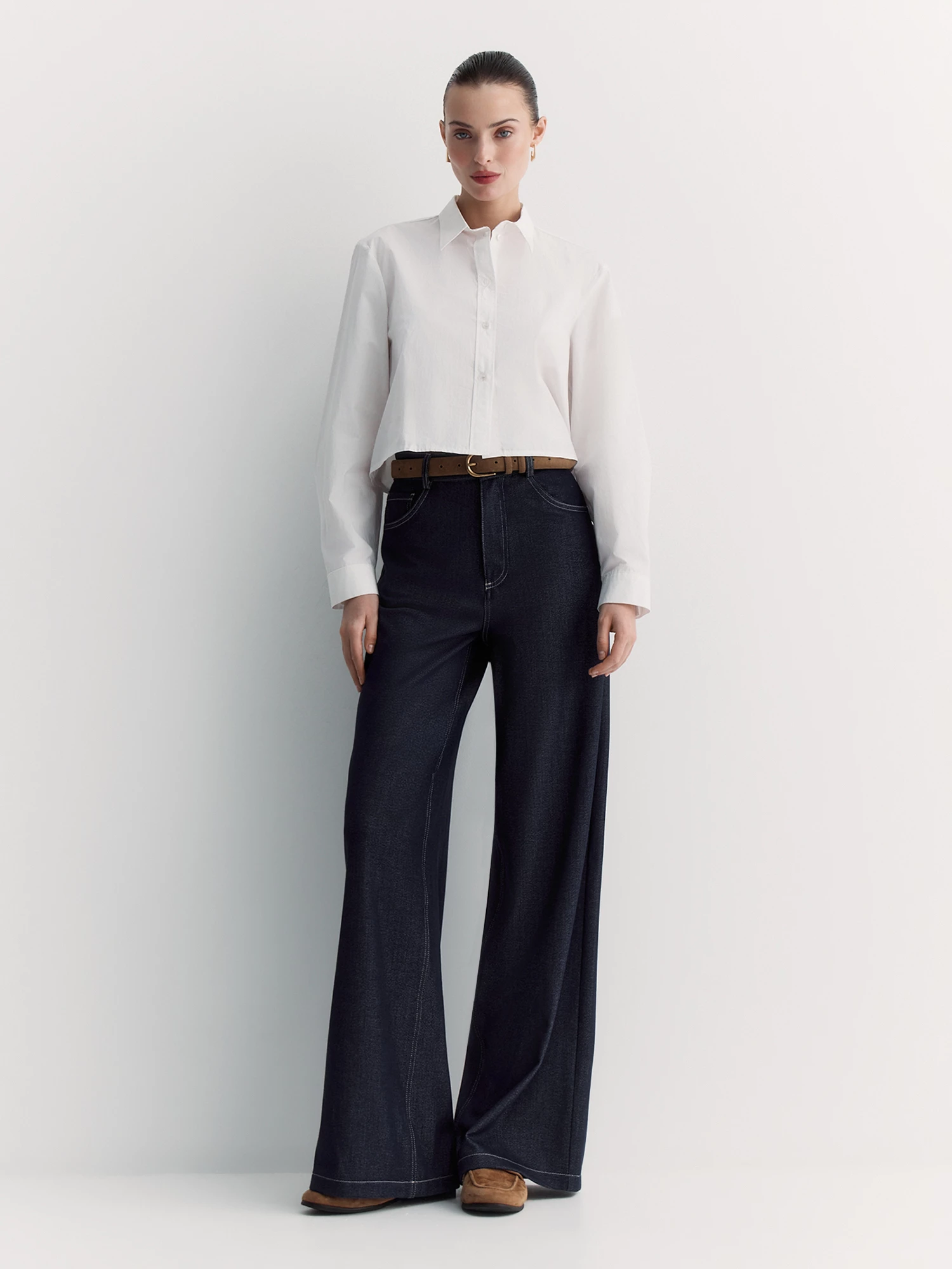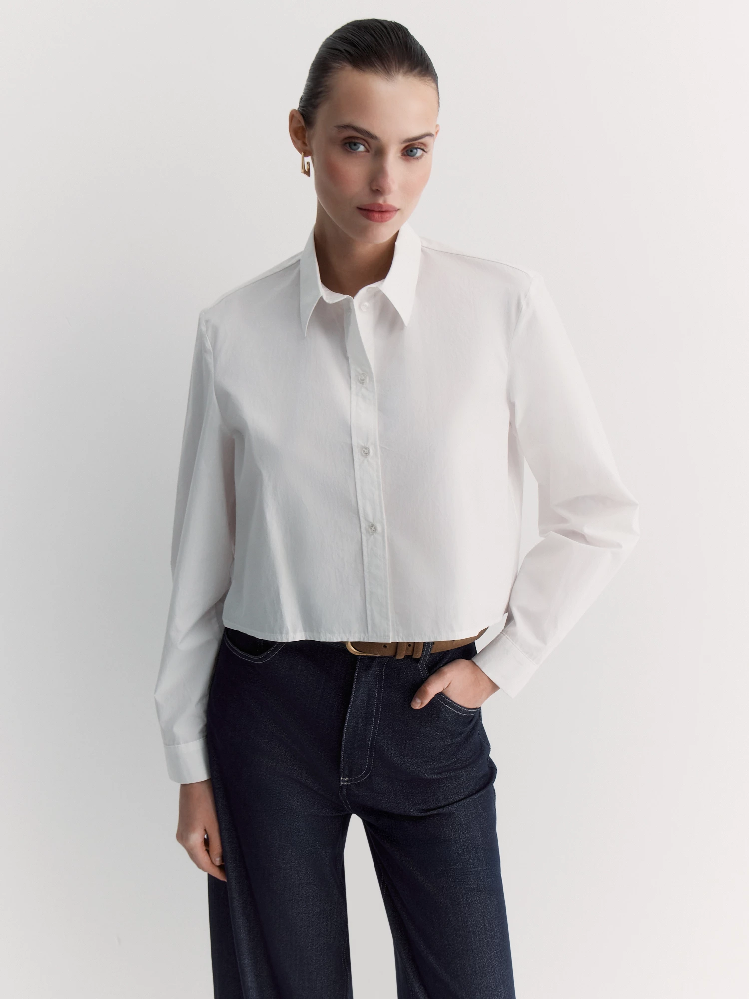 Укороченная блуза рубашечного кроя из хлопка с лёгким жатым эффектом хорошо дышит и удобно сидит.