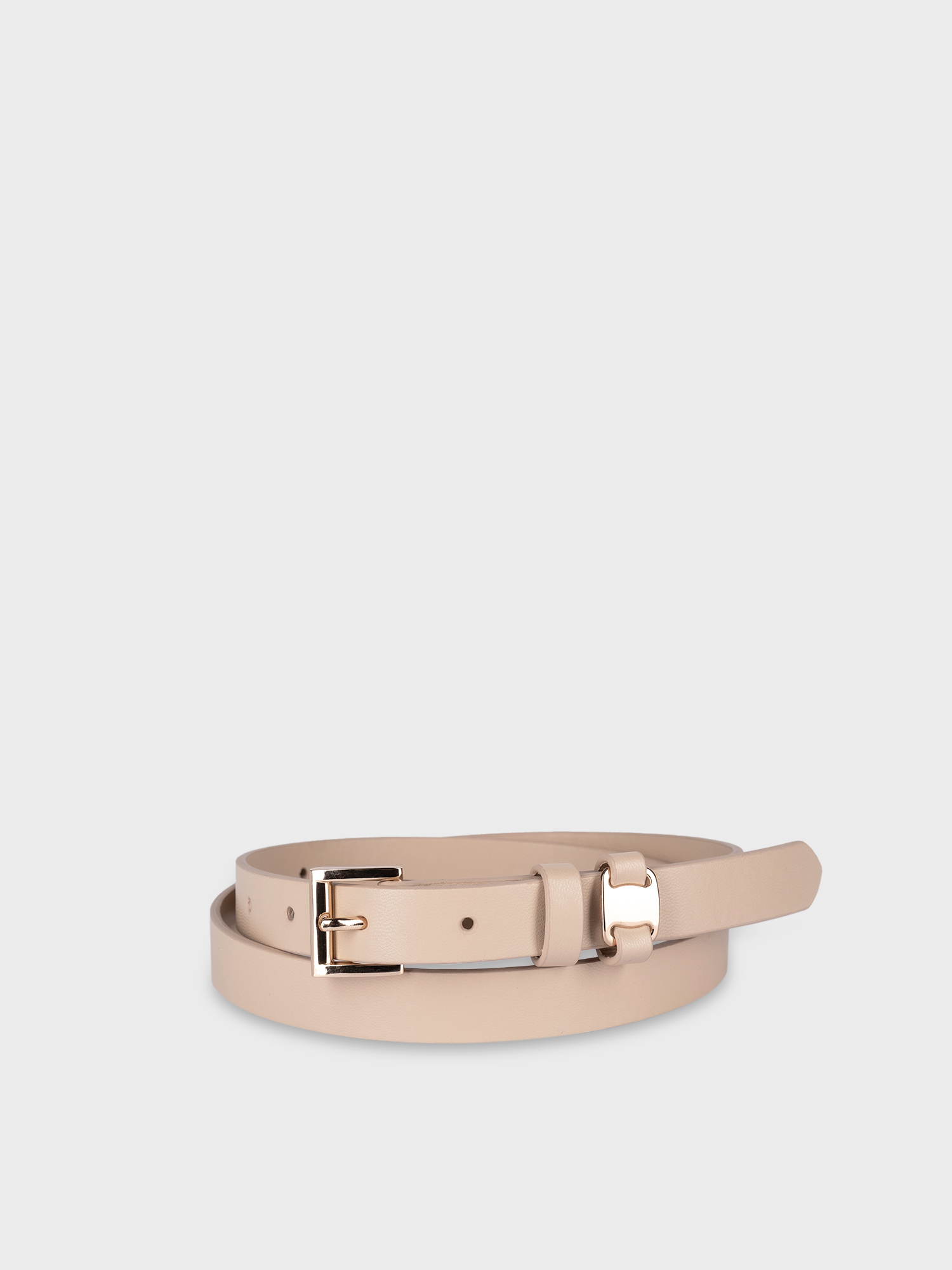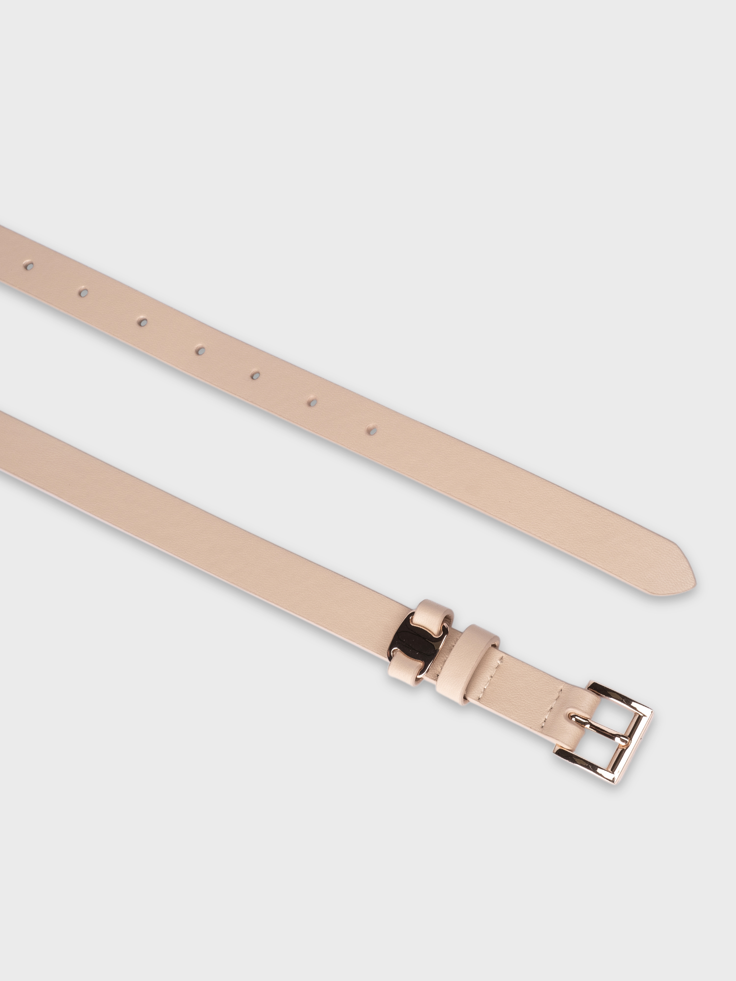 Квадратная золотистая пряжка и металлическая деталь с плавными изгибами на шлевке - актуальные стилистические нюансы узкого ремня из качественной эко-кожи. Такой аксессуар поможет подчеркнуть фигуру тем, кто предпочитает летящие платья или блузы.