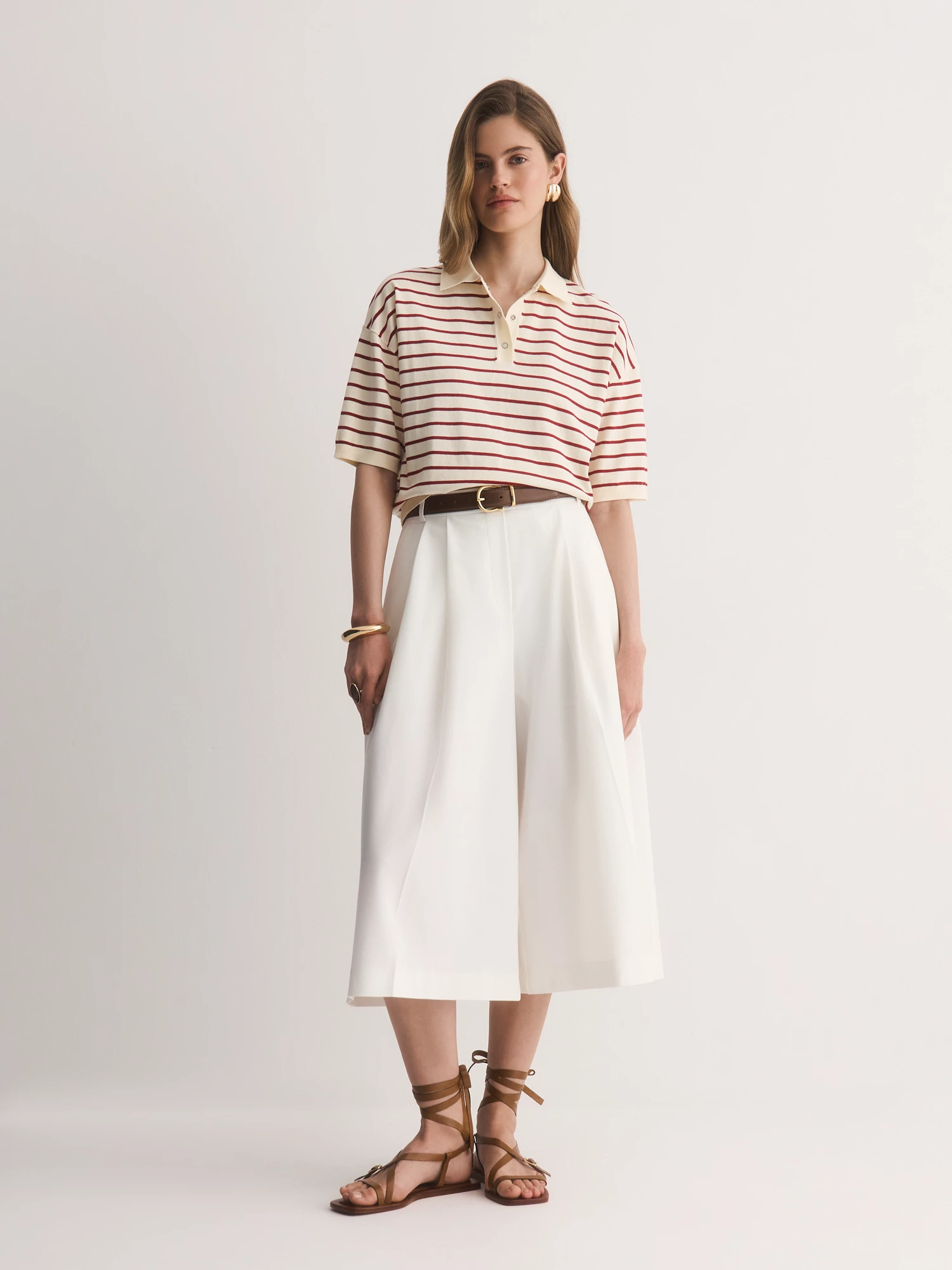 Бордовая полоска на молочном фоне актуальна как никогда и привнесет в образ ноту морского стиля.