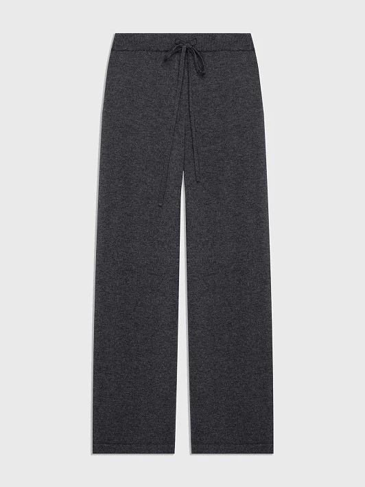 Пояс на вязаной тесьме мягко фиксирует талию, а декоративная узкая резинка по низу добавляет аккуратный вид. Классический тёмно-серый цвет делает брюки универсальными.
