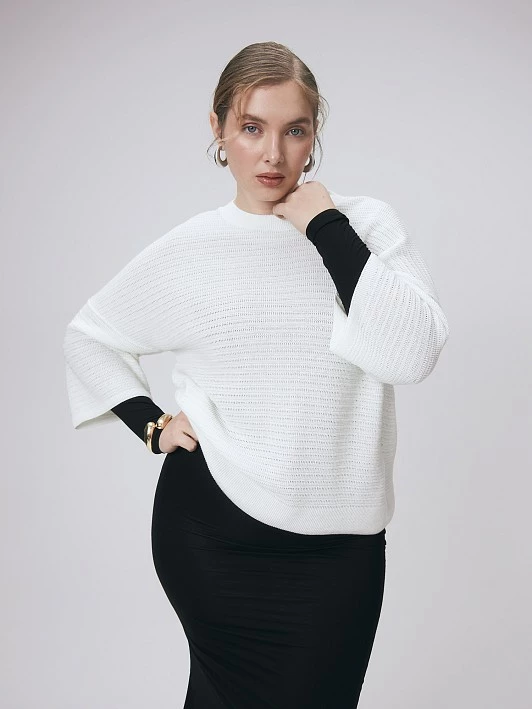 Благодаря такому способу производства, джемпер в актуальном молочном оттенке будет хорошо держать форму и долго прослужит.