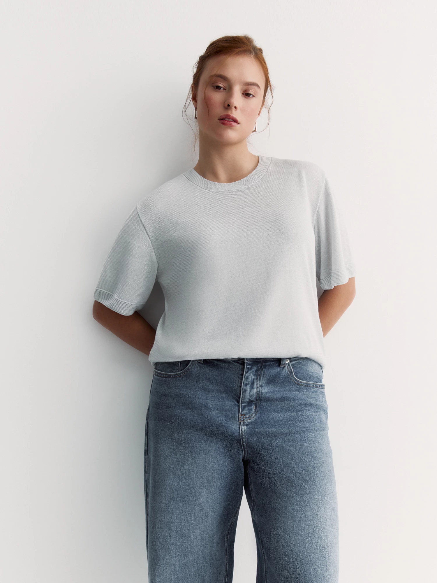 Тонкий вязаный джемпер по смыслу аналогичен футболке, он легкий, уютный и приятный на ощупь. Связан из шелковистой пряжи на основе вискозы, которая дарит нежность коже и легкий благородный блеск.