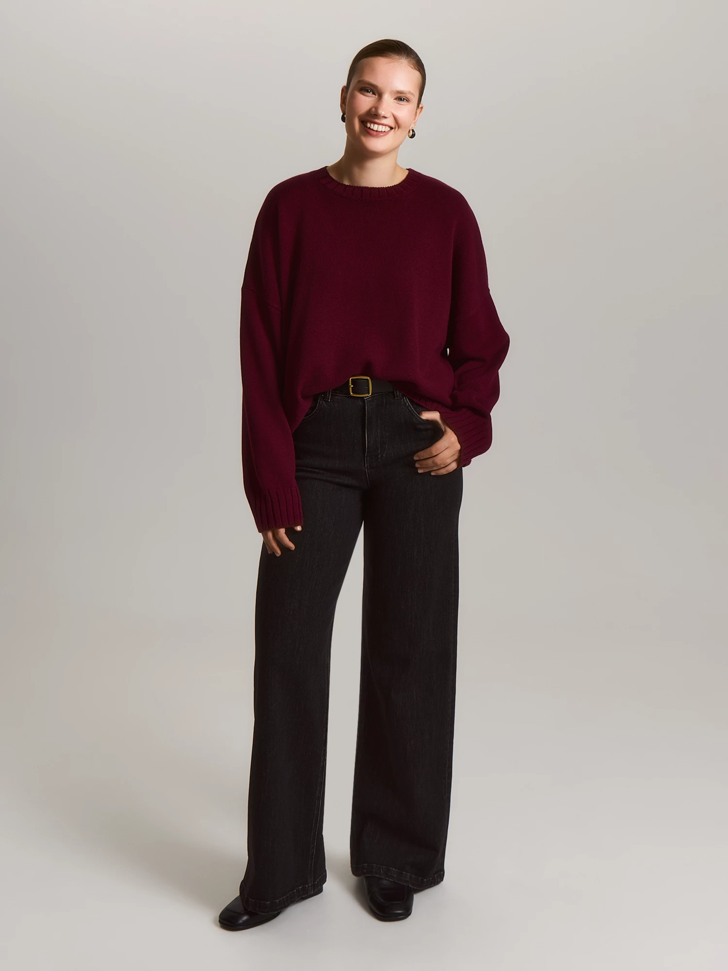 Джемпер с круглым вырезом и длинными рукавами, продукт высокоточной машины Shima Seiki, призван дарить не только тепло, но и безупречный стиль. Мягкие складки высоких манжет нежно обволакивают запястья, создавая ощущение защищенности и комфорта, а спущенное плечо добавляет образу непринужденную изысканность, делая силуэт женственным и пластичным. Асимметричный низ, где спинка чуть длиннее переда, придает модели динамичный современный характер — такой джемпер не просто согревает, но и визуально вытягивает фигуру, делая движения более выразительными, а образ — цельным и продуманным до мелочей. Связанный из премиальной пряжи с добавлением шерсти мериноса и хлопка — самого востребованного и любимого в России состава, — свитер сочетает в себе лучшее от натуральных материалов: нежную теплоту мериноса, который прекрасно регулирует температуру тела, и воздушную легкость хлопка, обеспечивающего невероятный комфорт. Деликатный благородный блеск пряжи придает вещи нарядный штрих, позволяя ей легко переходить из повседневных образов в более торжественные. Сдержанный бордовый цвет - это благородная альтернатива классическому красному, сочетающая глубину и элегантность. Не просто одежда, а инвестиция в комфорт и уверенность.