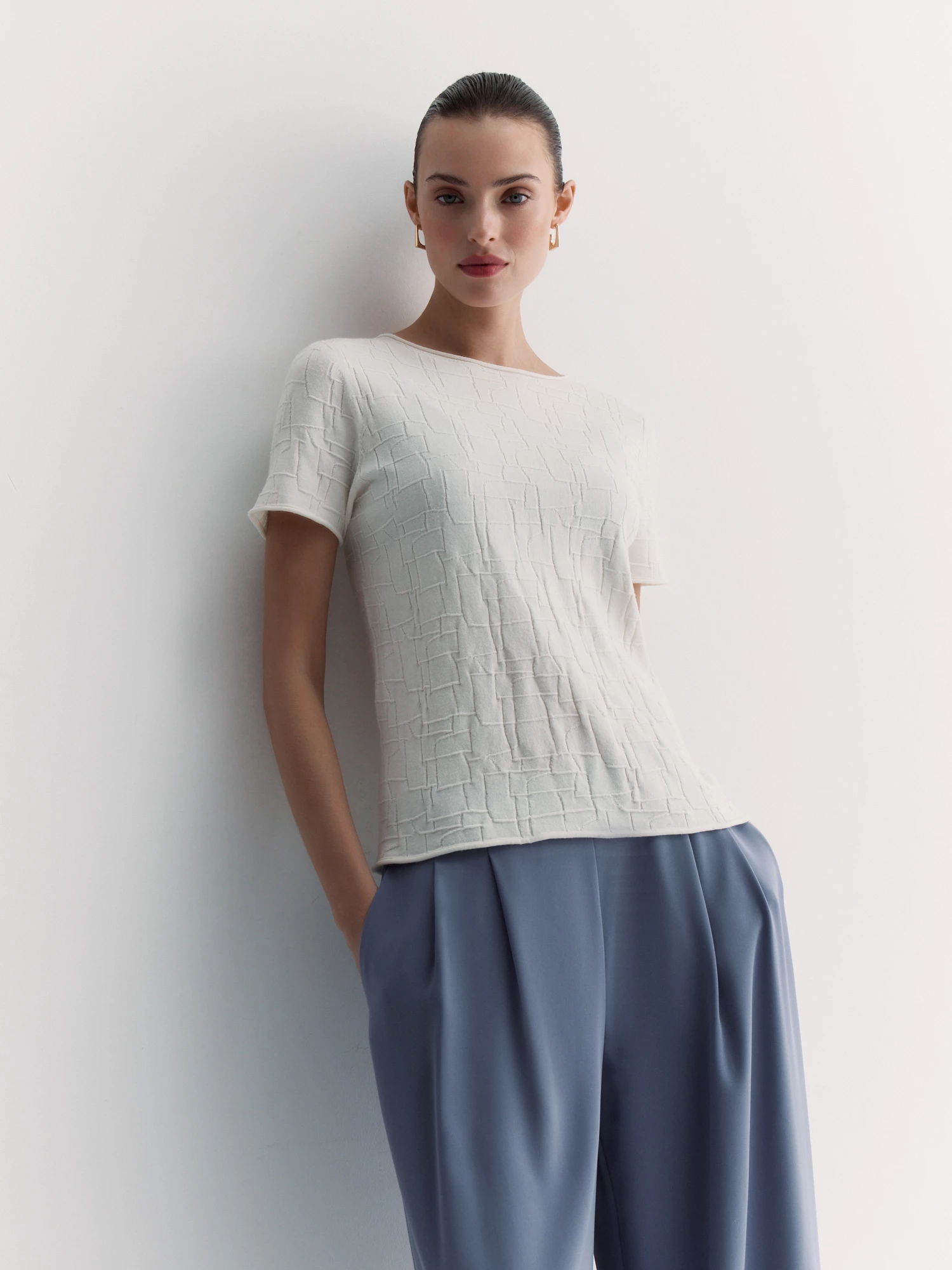 Жаккардовое переплетение нитей создает интересную текстуру, а закручивающиеся края коротких рукавов добавляют модели игривости. Вырез лодочкой подчеркивает женственность, сохраняя сдержанность образа.